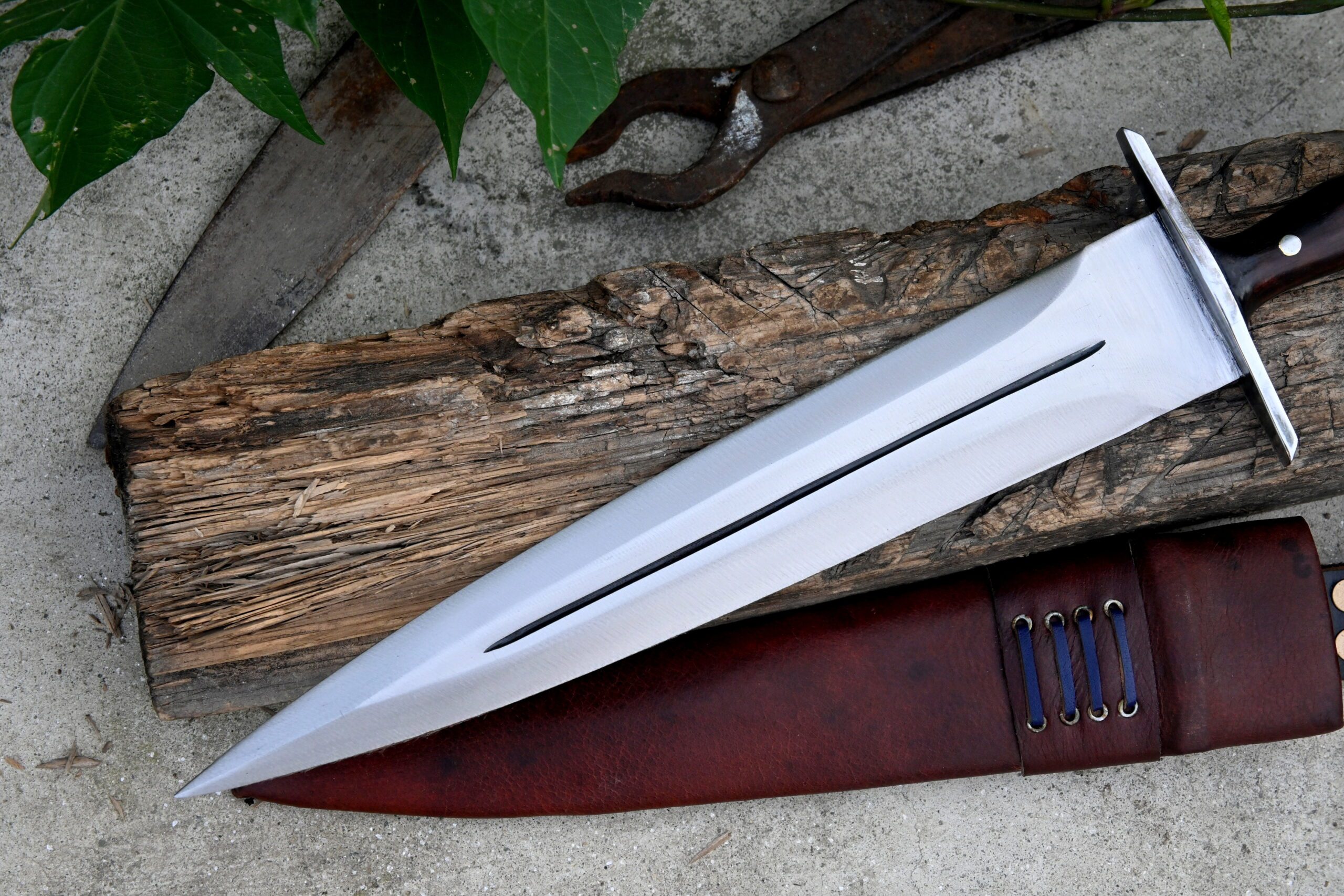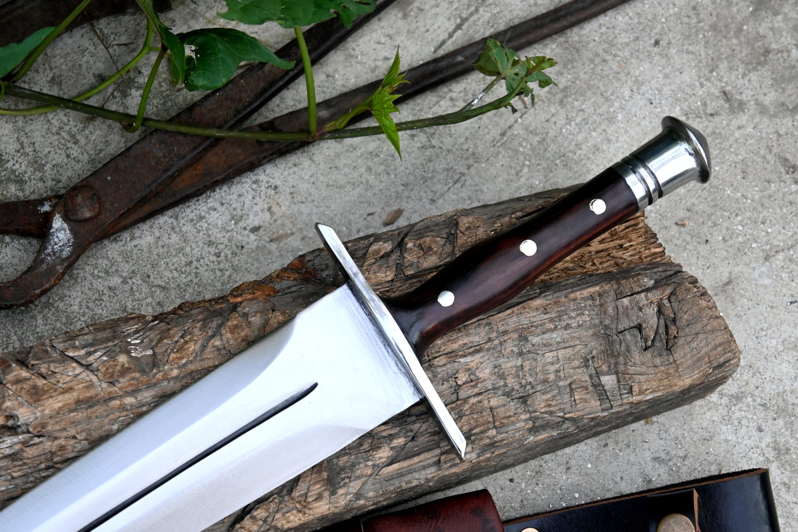 A custom leather scabbard accompanies the dagger, complete with a belt button on the handle for easy and secure carriage.