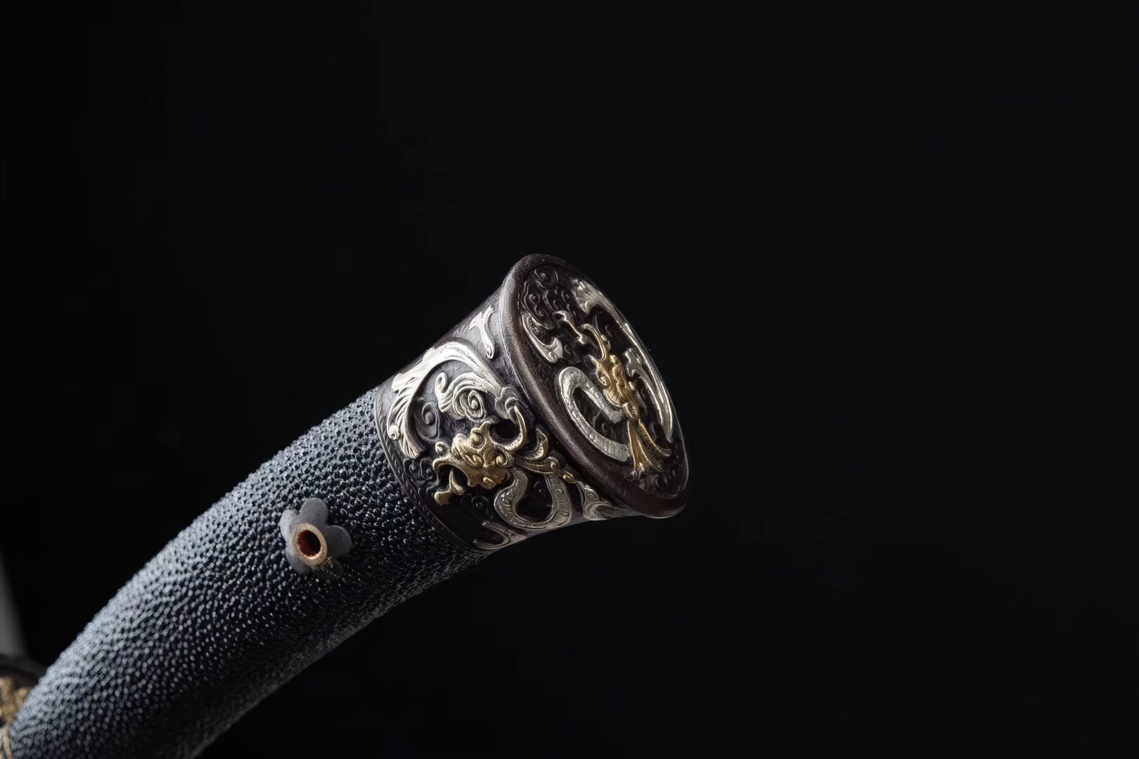 The distinctive hamon patterns are highly noticeable, and the blade contains a groove to lighten its weight, enhancing its handling qualities. All the fittings are crafted from brass, reflecting a prevailing dragon theme design. The scabbard and handle are constructed from wood and are covered with genuine rayskin material. Ideal for cutting practice, the sword comes with a complimentary sword bag for storage purposes.