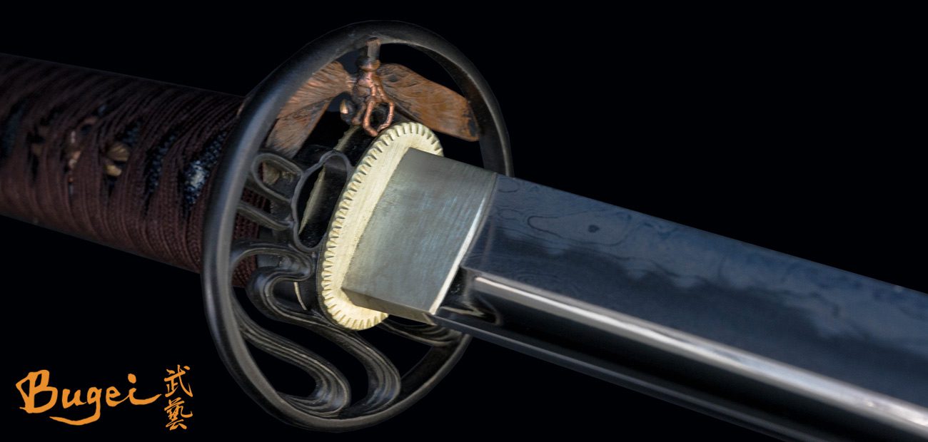The fittings are designed to look like aged iron. The tsuba is made of iron with a copper-inlaid dragonfly that really stands out.