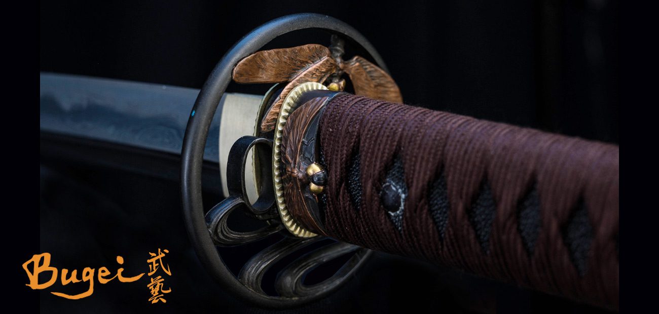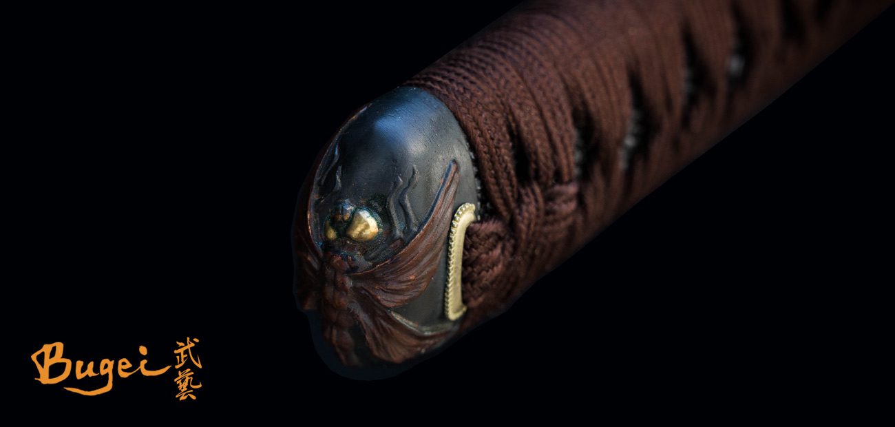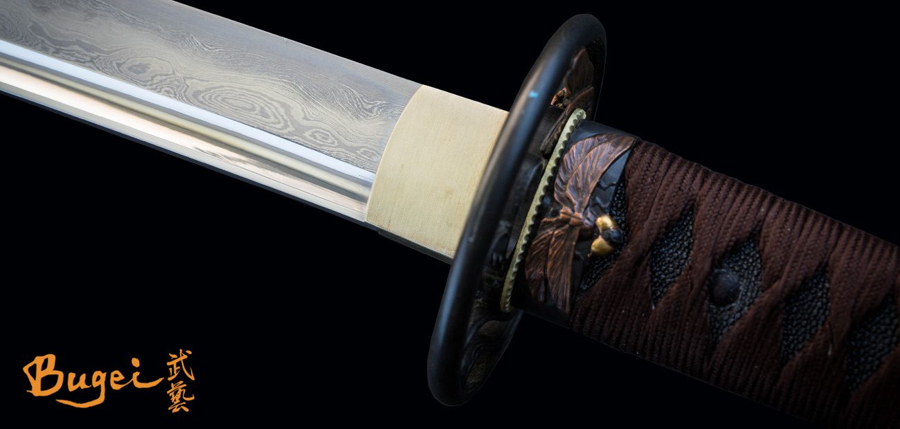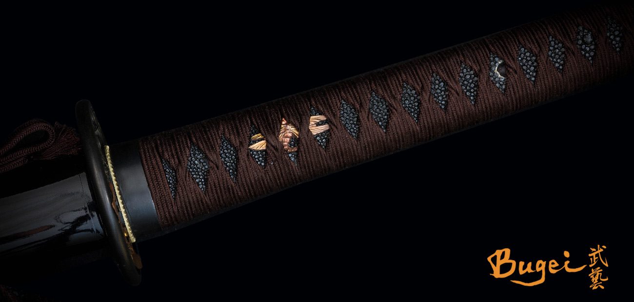 The handle is wrapped in dark brown silk ito over black rayskin, using the traditional hineri-maki style for grip. It also has a slight curve in the middle (called ryugo), which feels great in the hands and is popular among sword users.