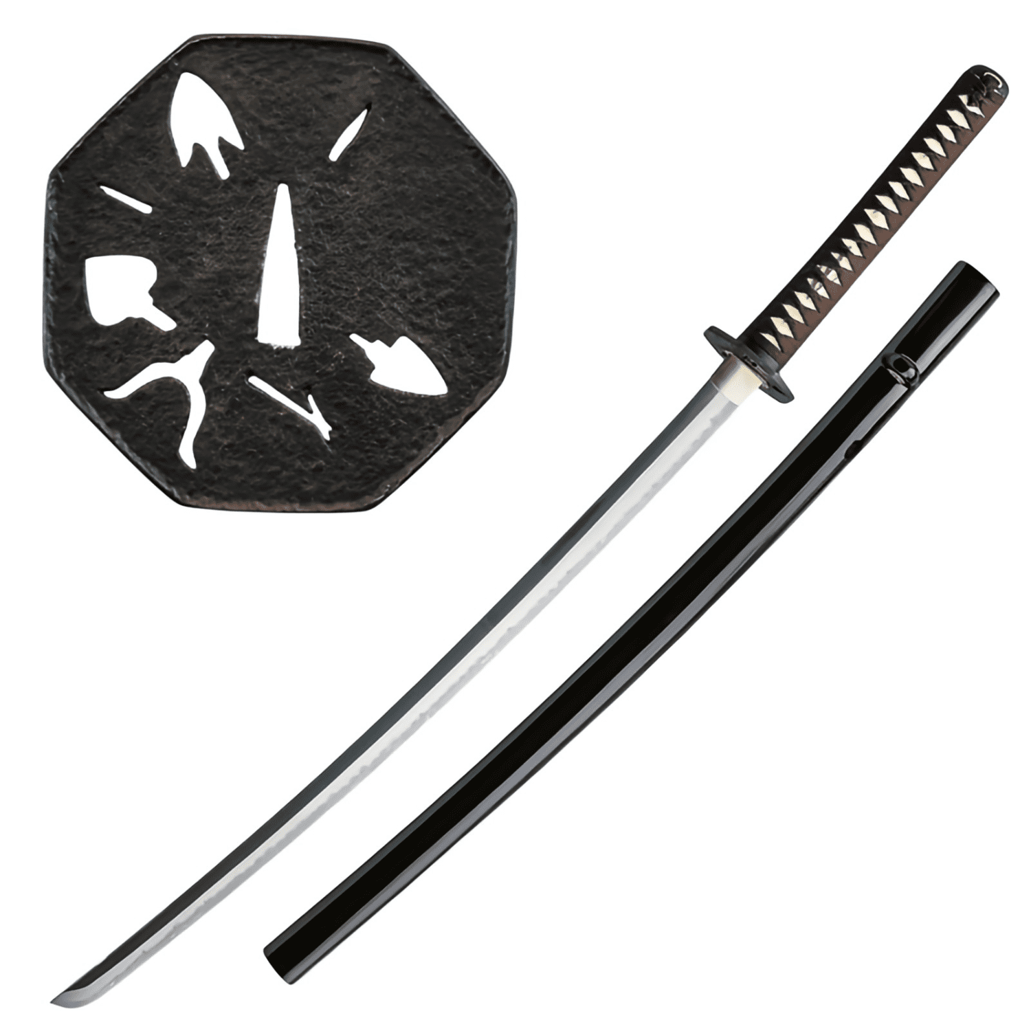 The Armorer's Katana is made of real high-carbon steel, folded in traditional Japanese style using a mixture of T10 tool steel and 1055 carbon steel—striking a balance between flexibility and toughness. This process also creates an interesting grain pattern across the blade. It has been traditionally clay-tempered to produce a real O-Choji hamon, hardening the edge.