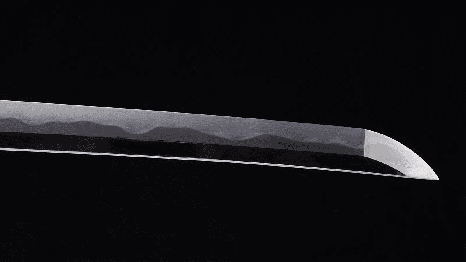 The blade itself is made from real tamahagane steel, the same material used in historical Japanese swords. It’s hand-forged and folded in the traditional way, then clay-tempered to create a genuine hamon—an undulating temper line that not only looks stunning but also hardens the edge for better cutting performance. This version doesn’t have a bohi groove, which gives it more weight and impact when cutting through targets like tatami mats or water bottles. The blade is brought to life with a Sashikomi A++ polish—a long process that takes months to complete and delivers unmatched visual depth and definition in the steel.