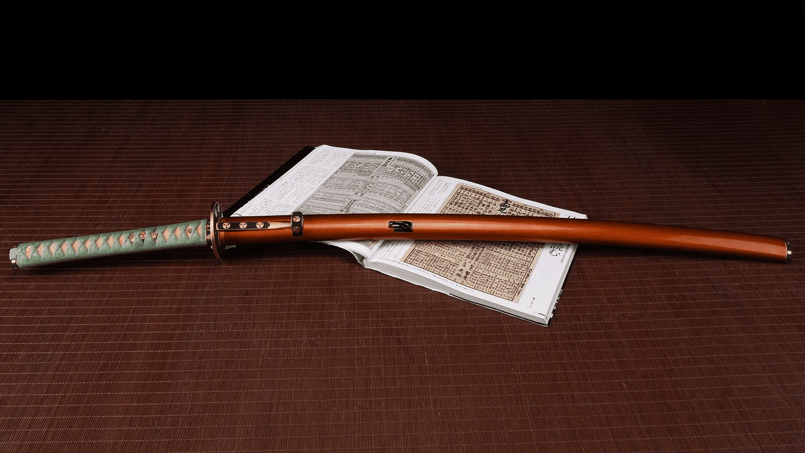 The scabbard is fitted with real horn at key contact points—a traditional material used by samurai for its lightweight strength. It’s polished to a gleaming, golden shine that catches the light beautifully.