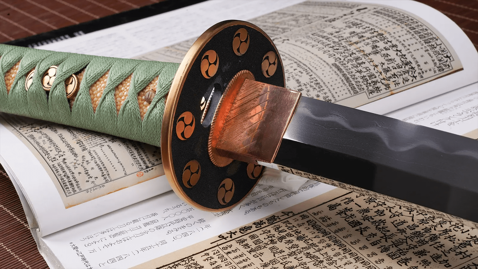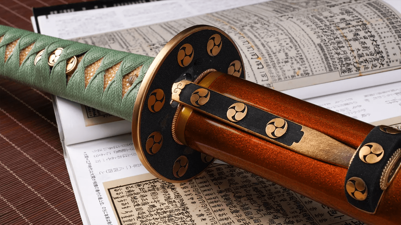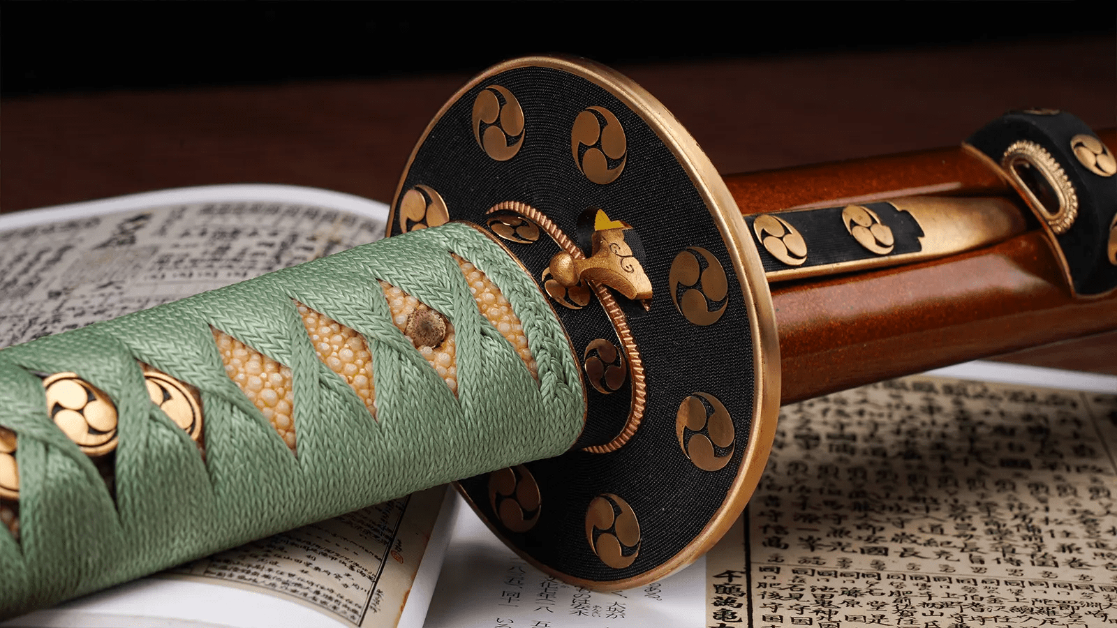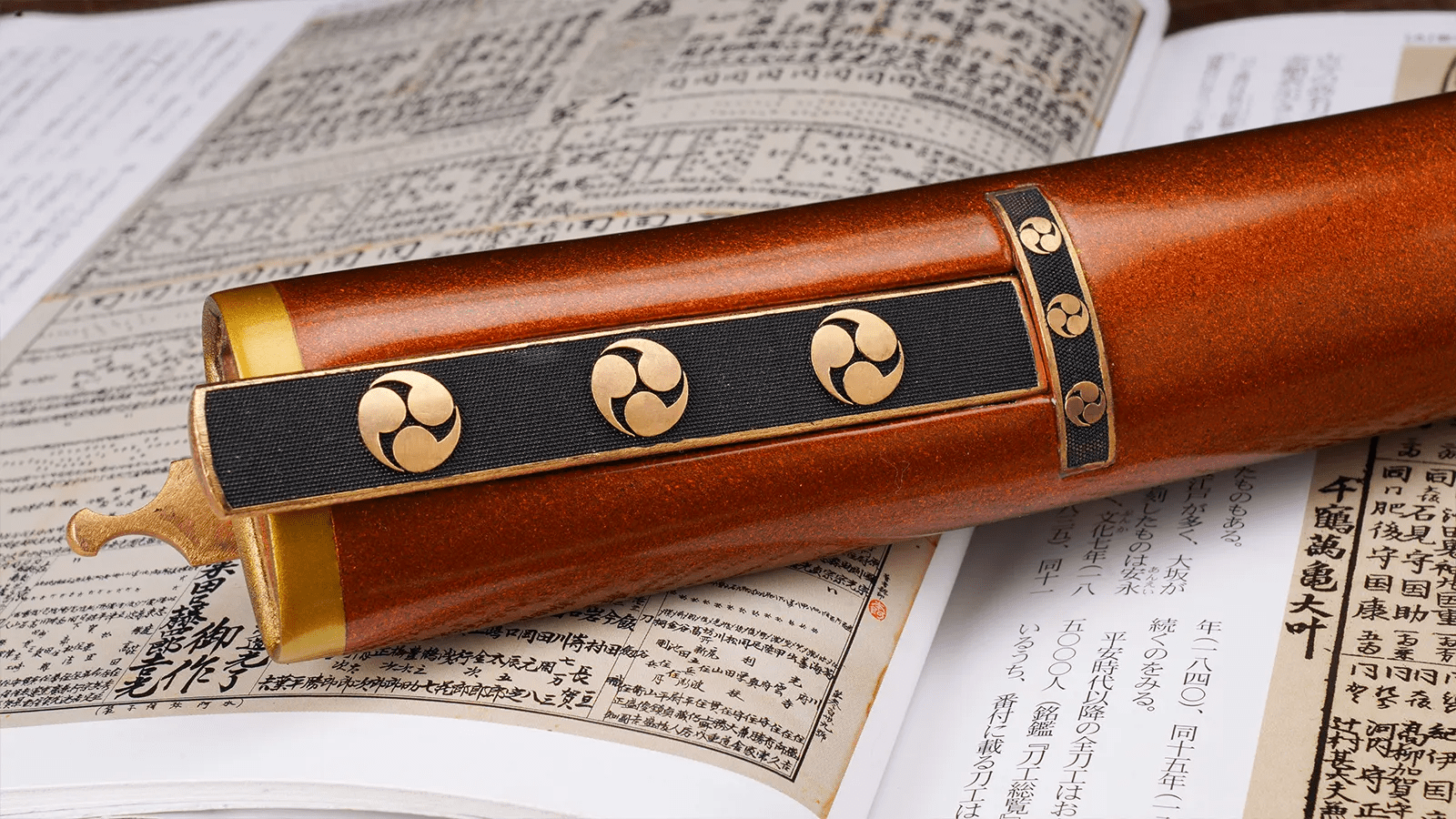 Kinriko refers to a golden style of swords once reserved for the nobility—gold not just in color, but in symbolism. In the samurai world, gold-toned blades were seen as marks of prestige. Mitsudomoe is the triple-comma motif carved into the fittings—an ancient symbol that represents the balance and eternal struggle between heaven, earth, and humanity. Koshirae means “fittings,” referring to every individual piece that brings the sword together. Believe it or not, the entire structure is held by a single bamboo mekugi peg inside the handle—just as it was done for centuries.