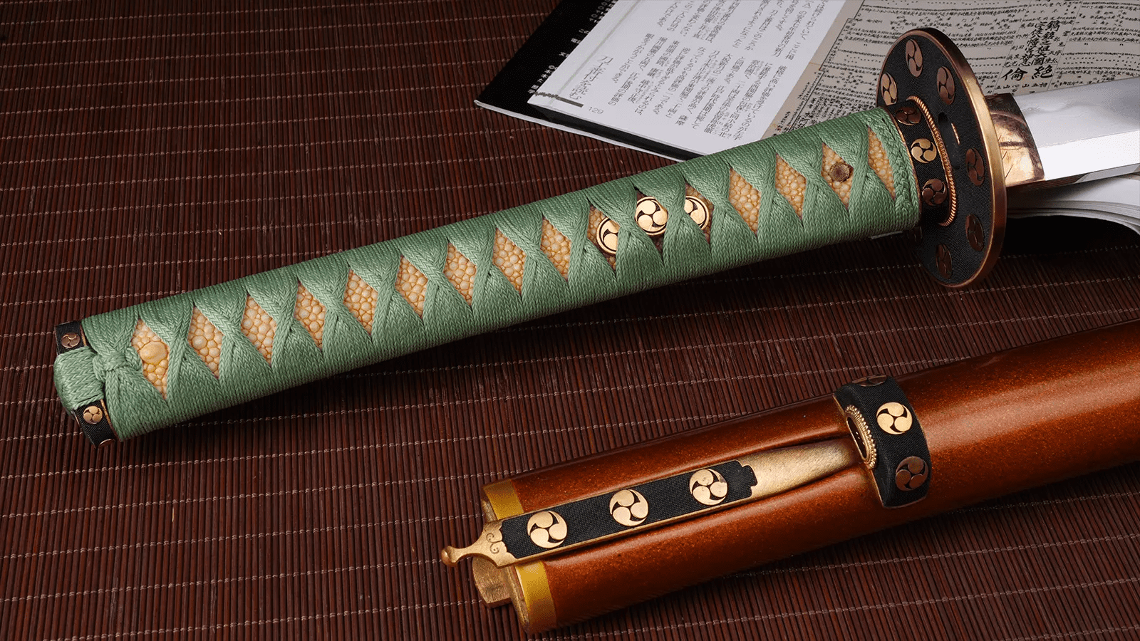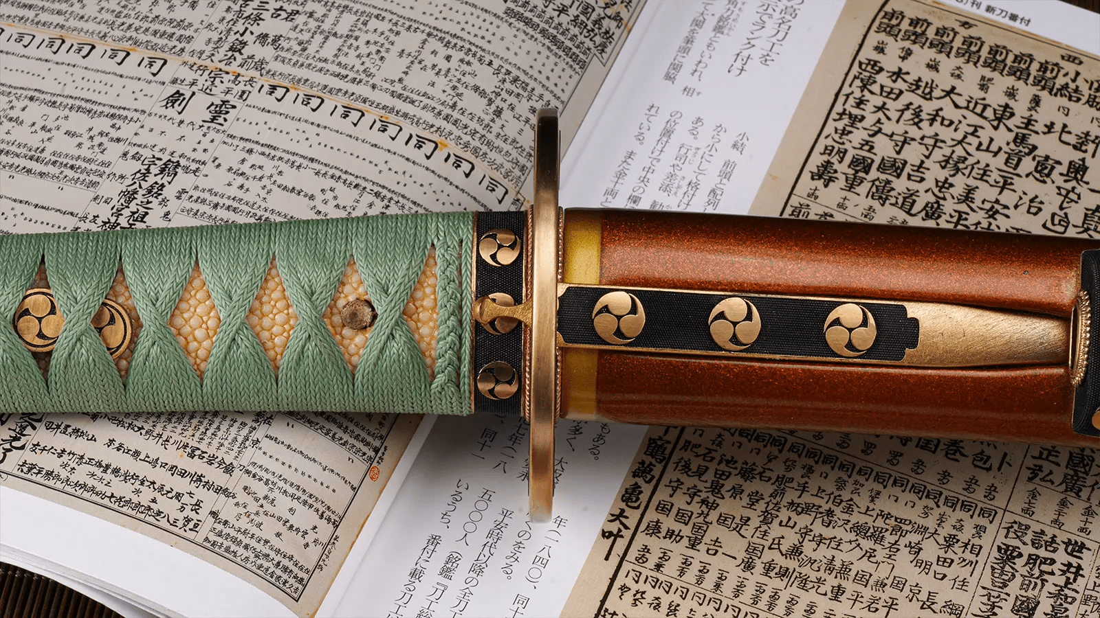 The handle is made in the jabara-maki style, using real silk tightly wrapped over authentic antique rayskin, complete with prominent emperor nodes near the kashira (pommel). All fittings are crafted from brass and decorated with the Kinriko Mitsudomoe motif.