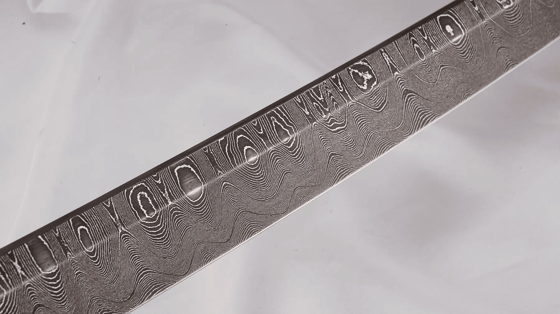 The steel is pattern-welded, meaning multiple types of steel are folded together repeatedly until the flowing Damascus lines appear. This version has no bohi groove, which adds weight and makes it more durable when using it for cutting through practice targets.