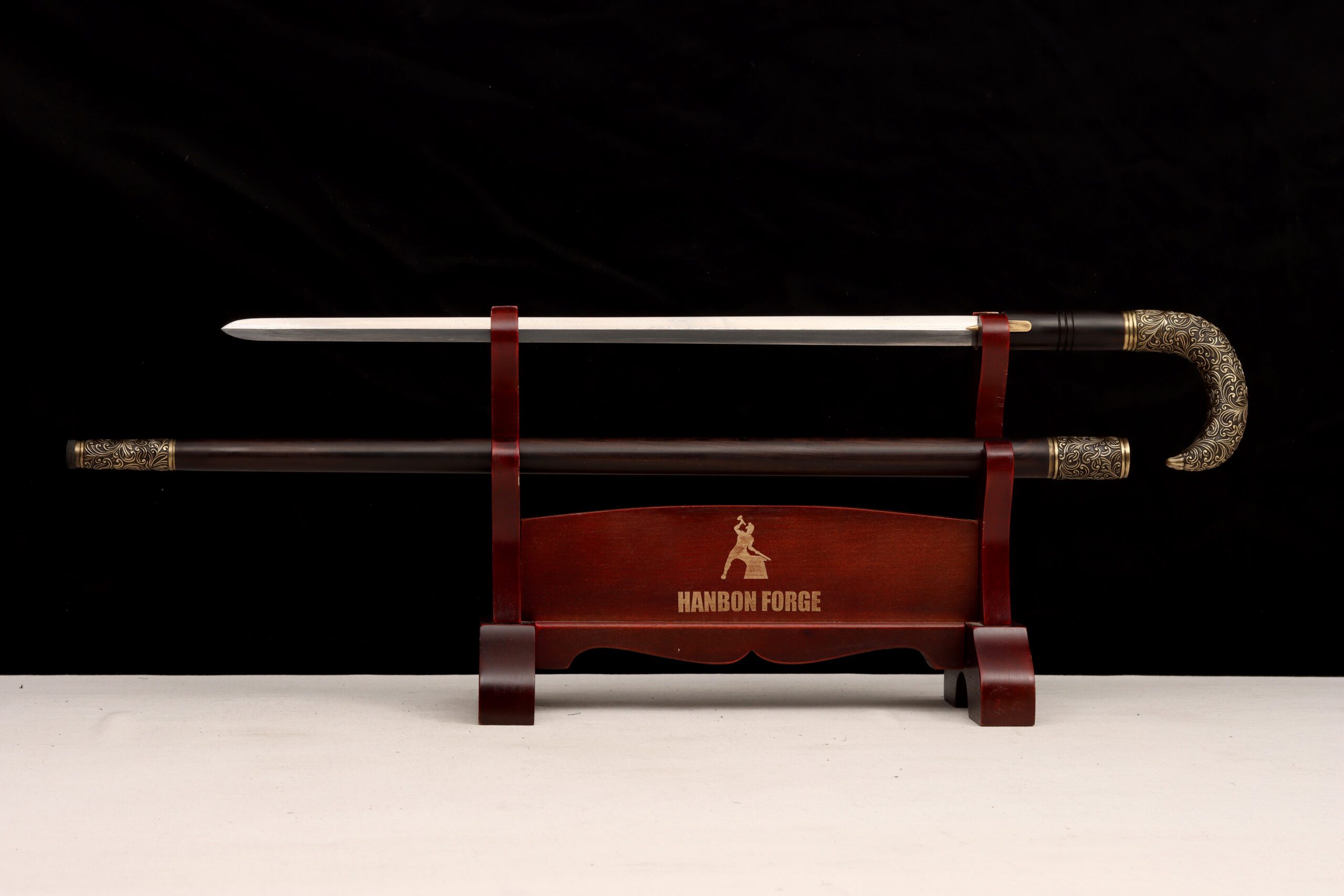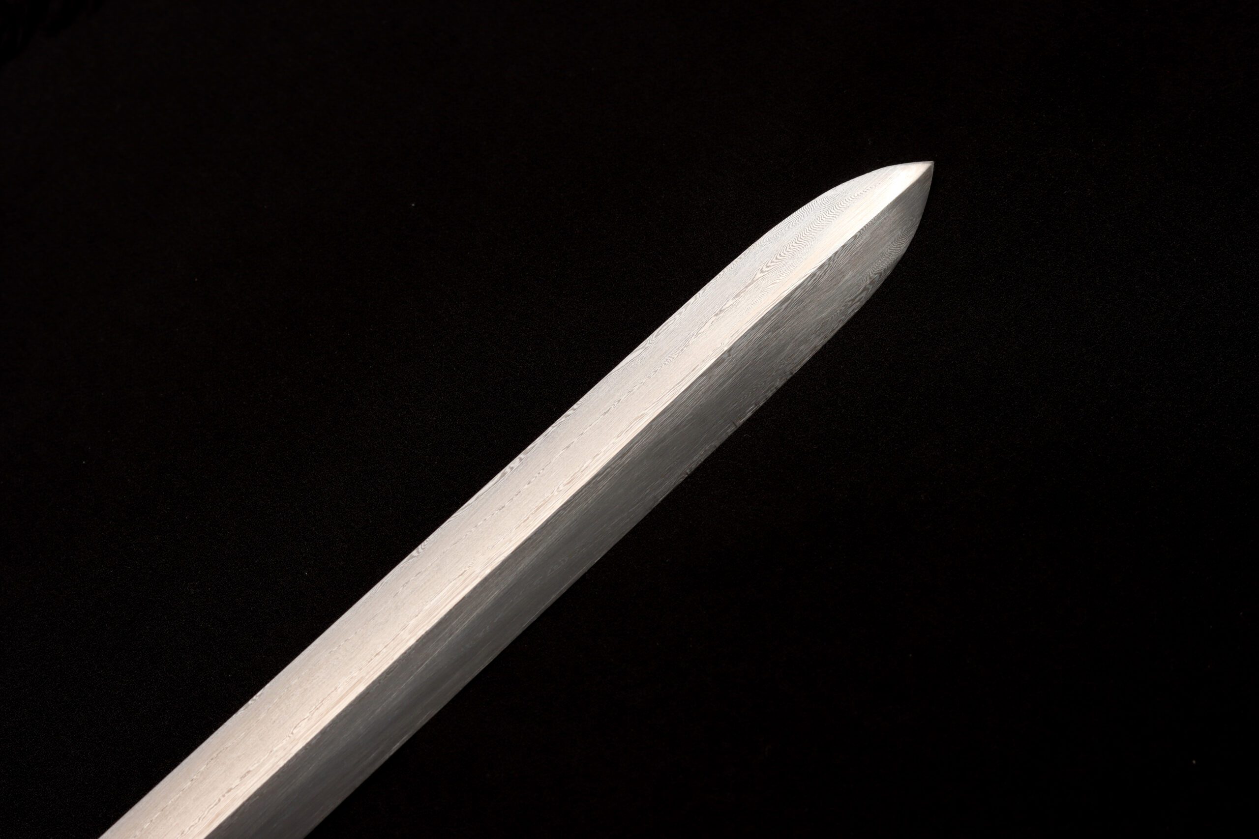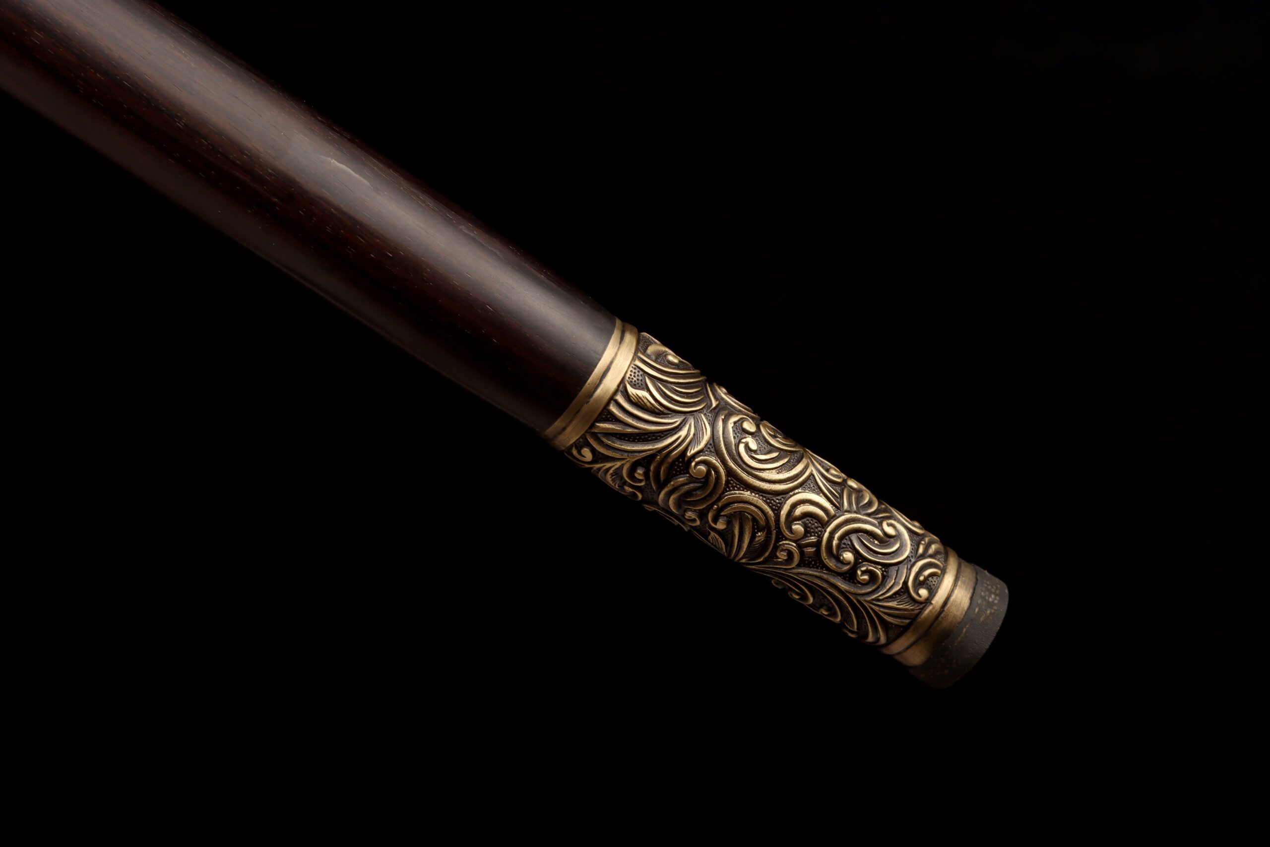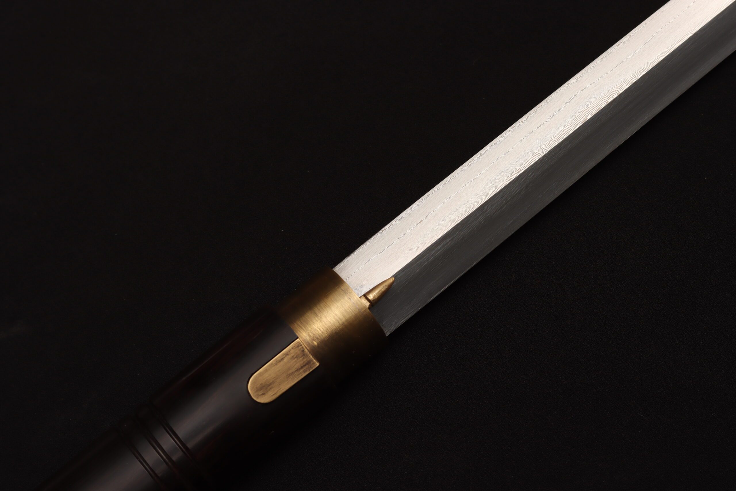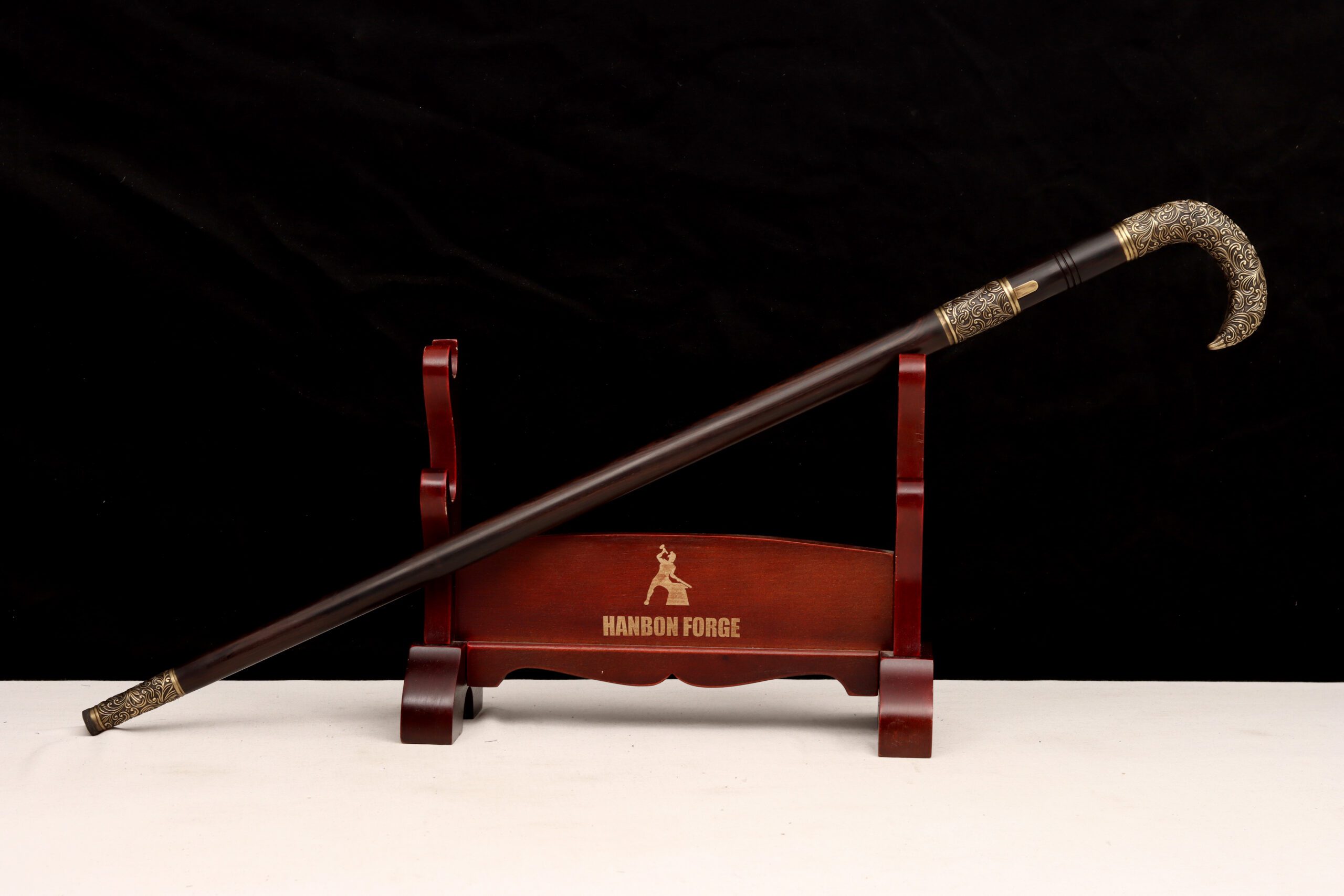 This cane sword carries that same spirit. It features a real high carbon steel blade, folded using traditional East Asian methods to create flowing, ripple-like patterns across the surface. It can be ordered sharpened or blunt depending on your preference.