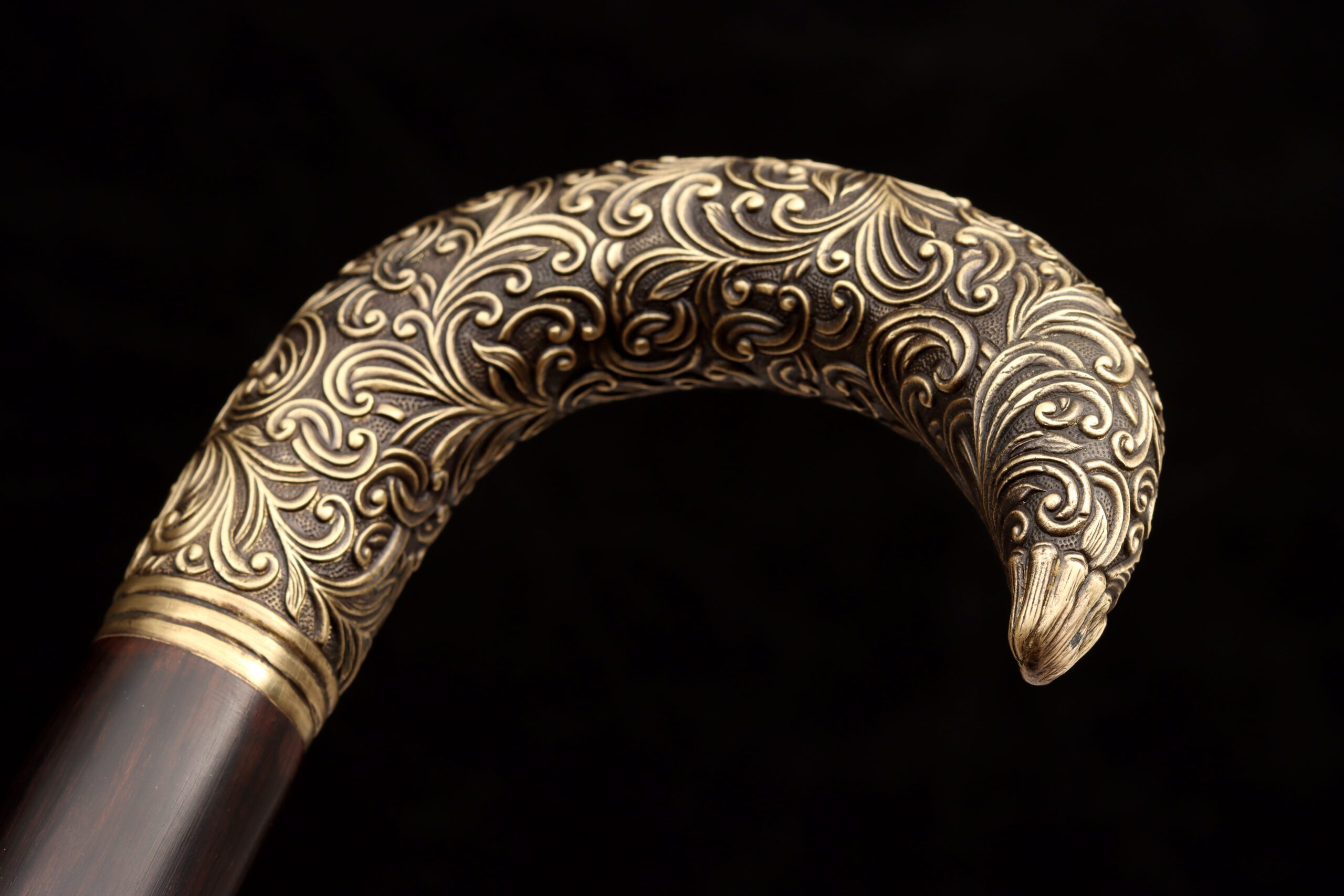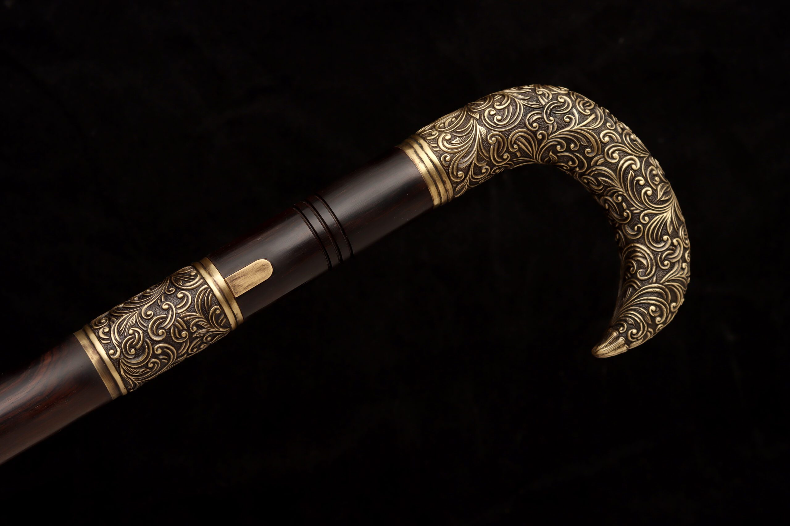 The shaft and hook-style handle are crafted from polished wood, giving it both a smooth feel and a reflective shine. Brass fittings, including the locking mechanism, add to its detailed finish decorated to reflect a sense of elegance and nobility.