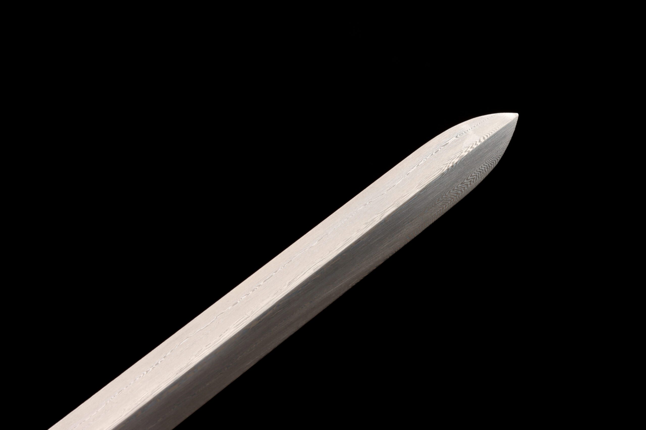 It features a carbon steel blade that has been folded multiple times to reveal visible layered patterns dancing across the surface. The blade can be ordered sharpened or unsharpened, depending on your preference.