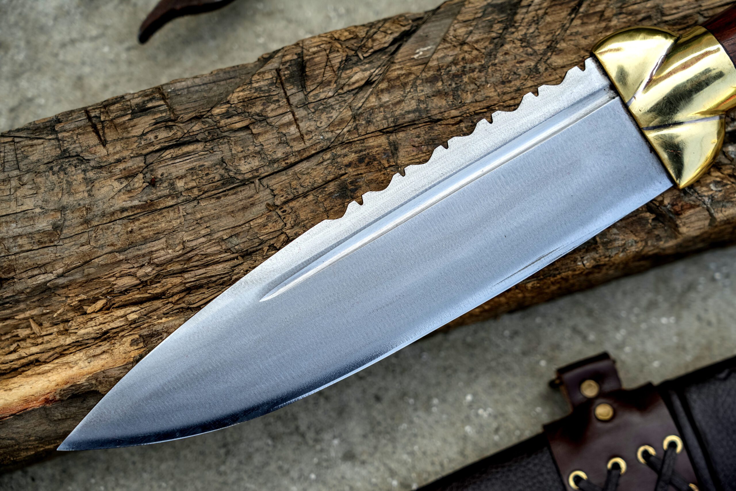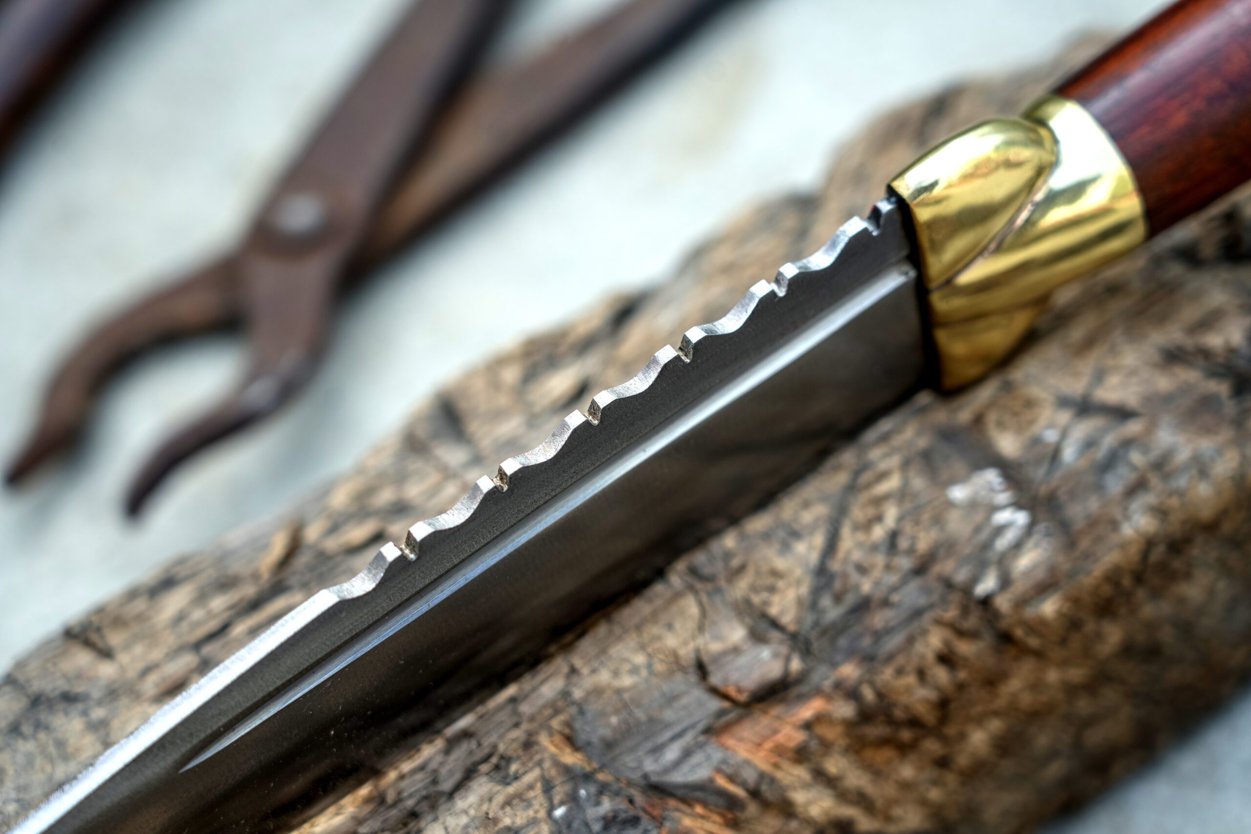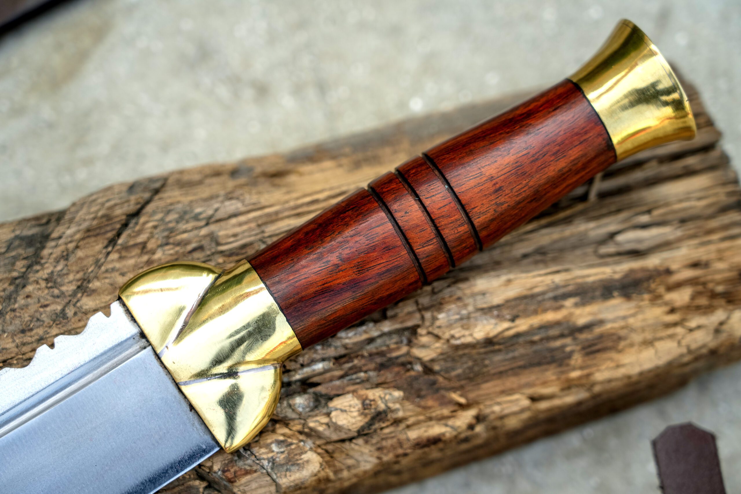 Forged from durable 5160 spring steel and sharpened for immediate light cutting practice, the blade boasts a slim and short fuller running near the spine to enhance both balance and visual appeal.