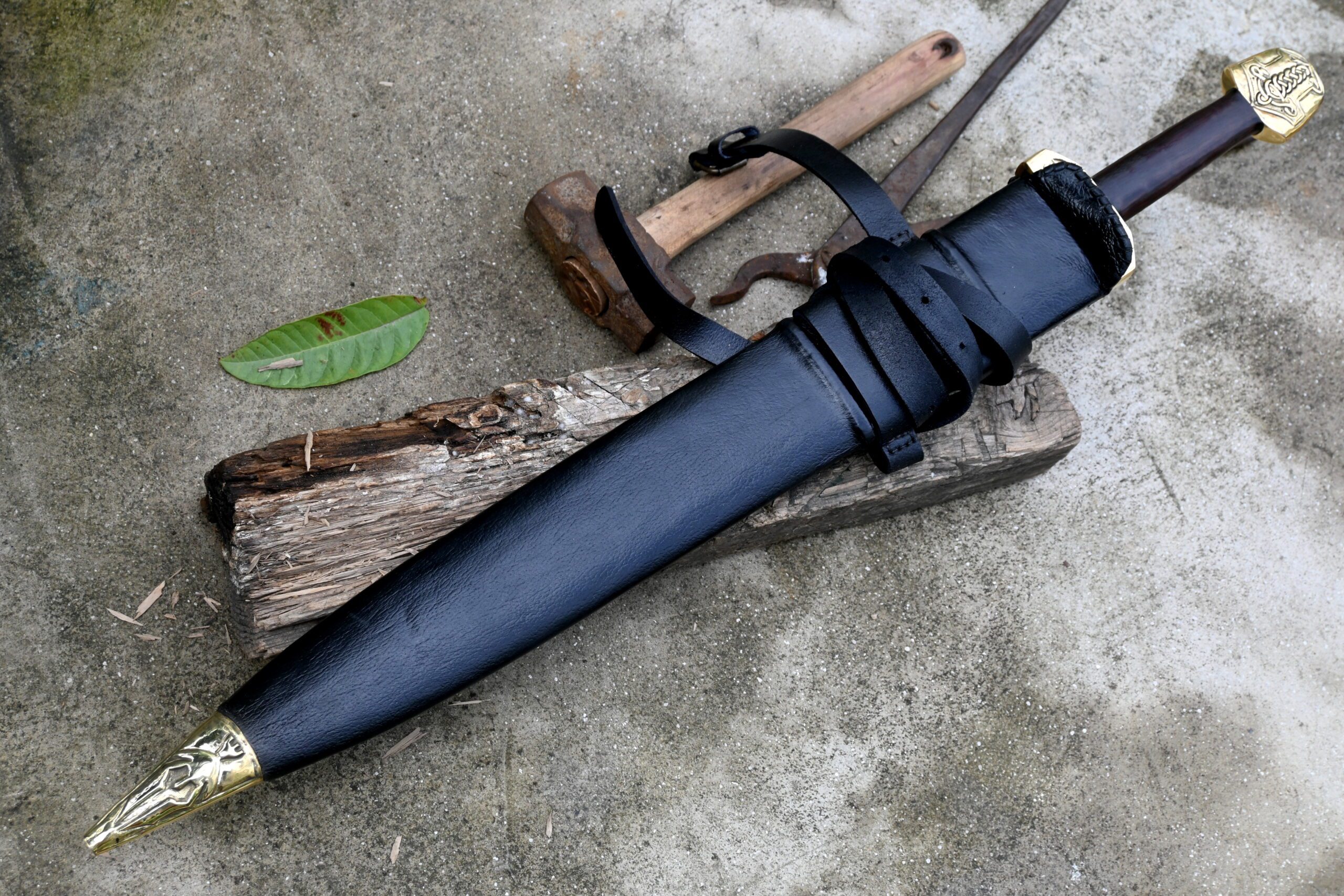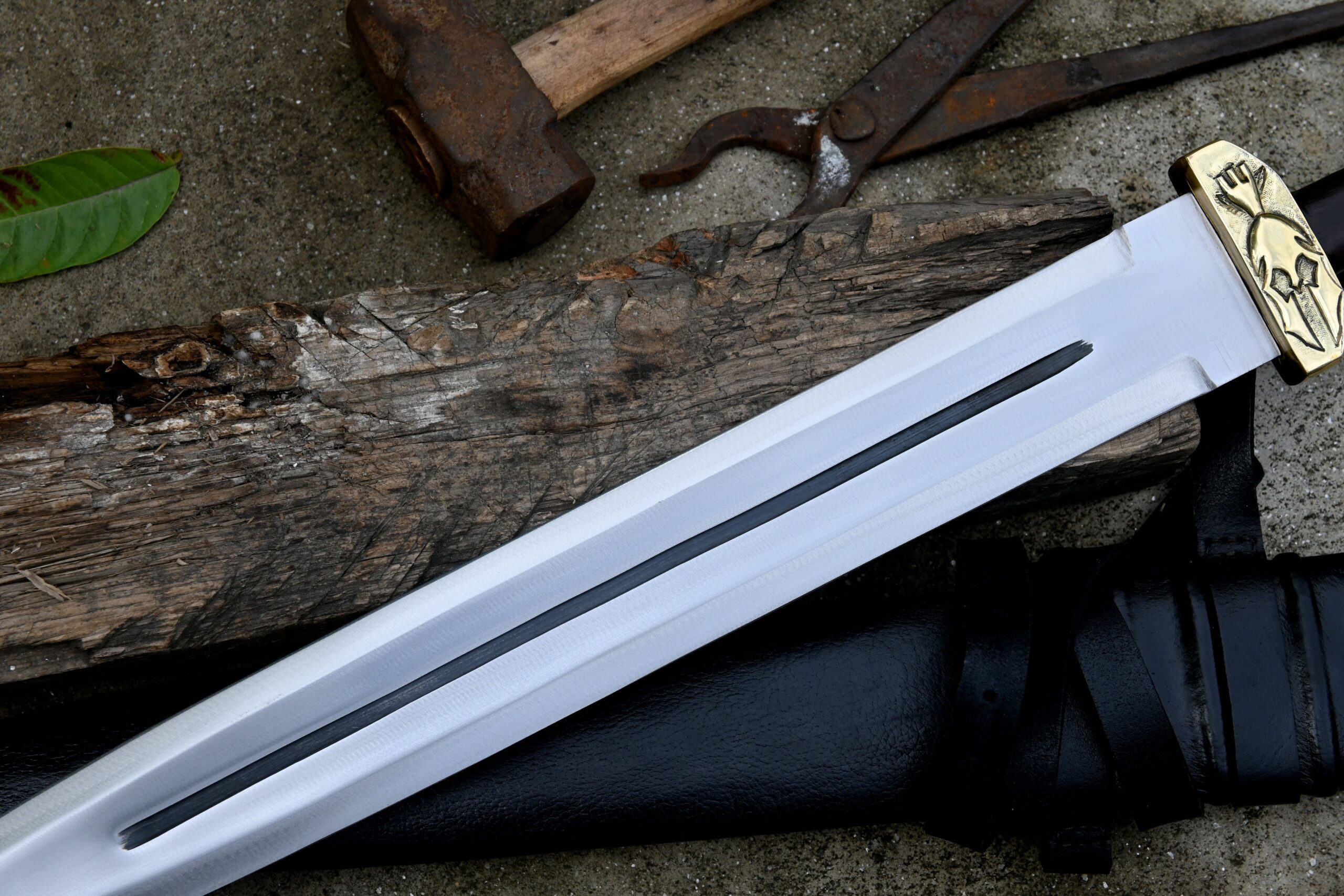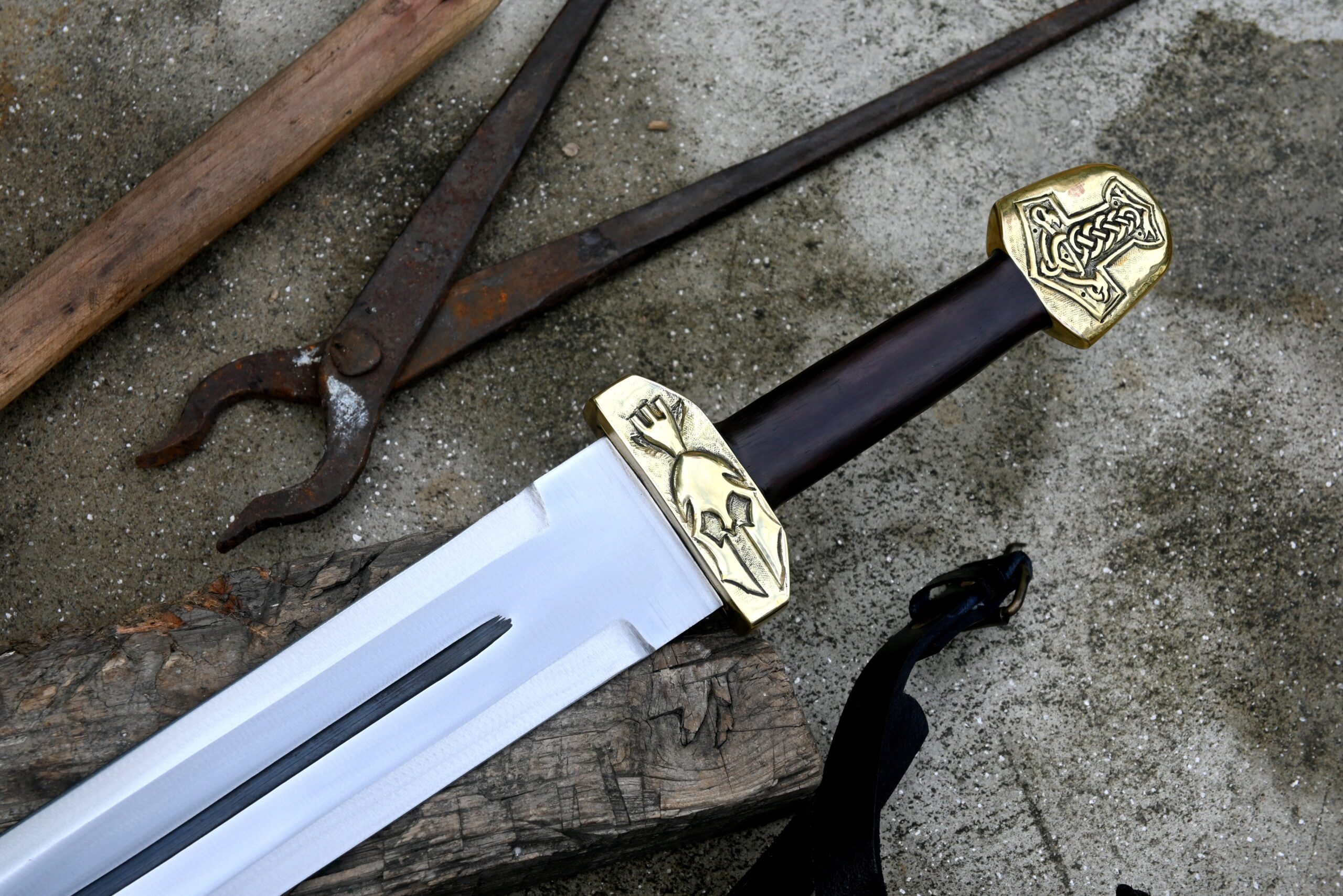 Crafted from polished and hardened 5160 spring steel, the blade features a central fuller enhancing its appearance. Its rosewood handle includes engraved metal fittings showcasing symbols from ancient Greek hoplite helmets and Viking runes, reflecting a blend of historical influences.
