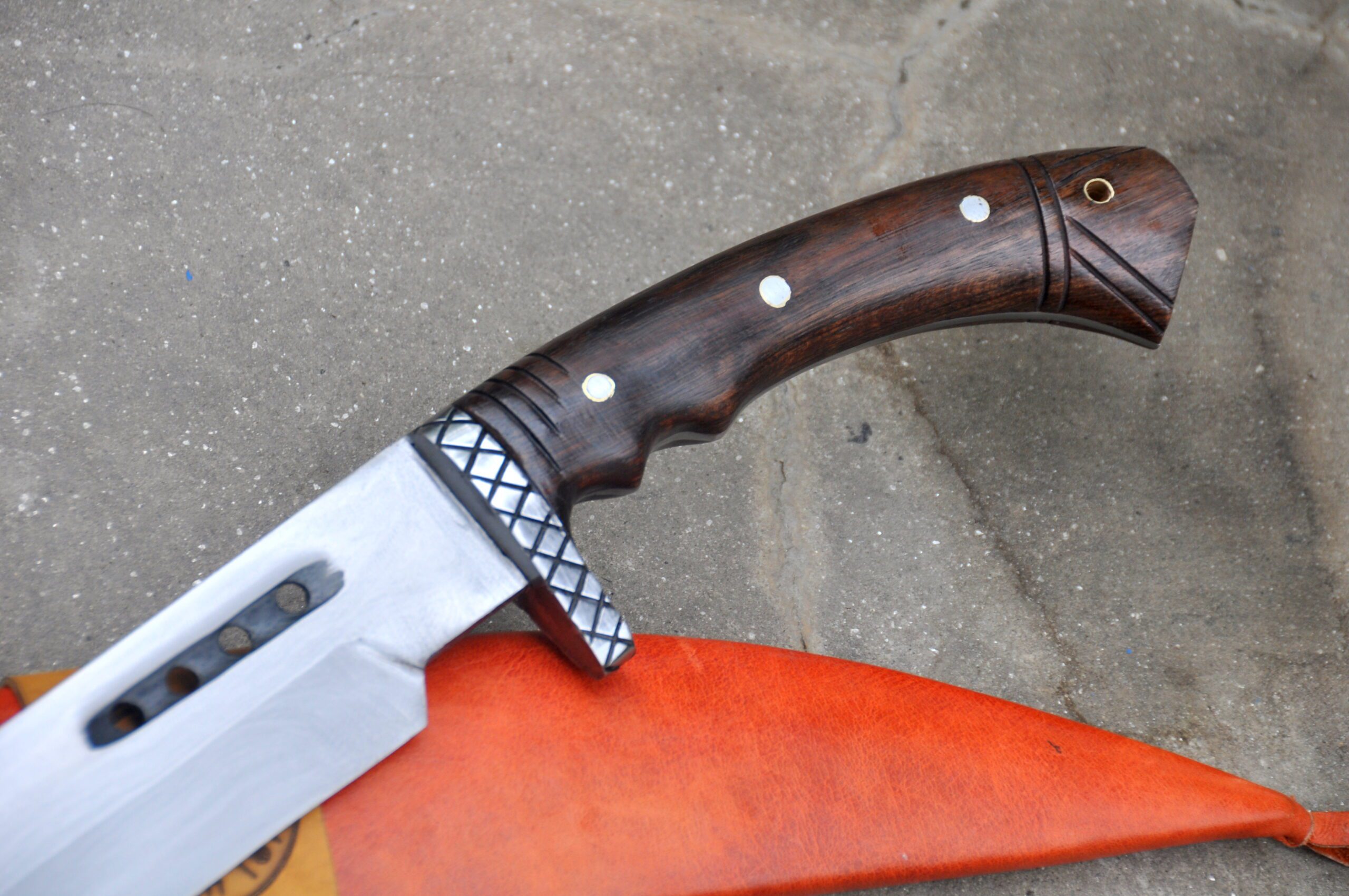 The distinctive curved handle, thoughtfully carved with ergonomic finger notches, is made from genuine rosewood, providing a comfortable and secure grip.