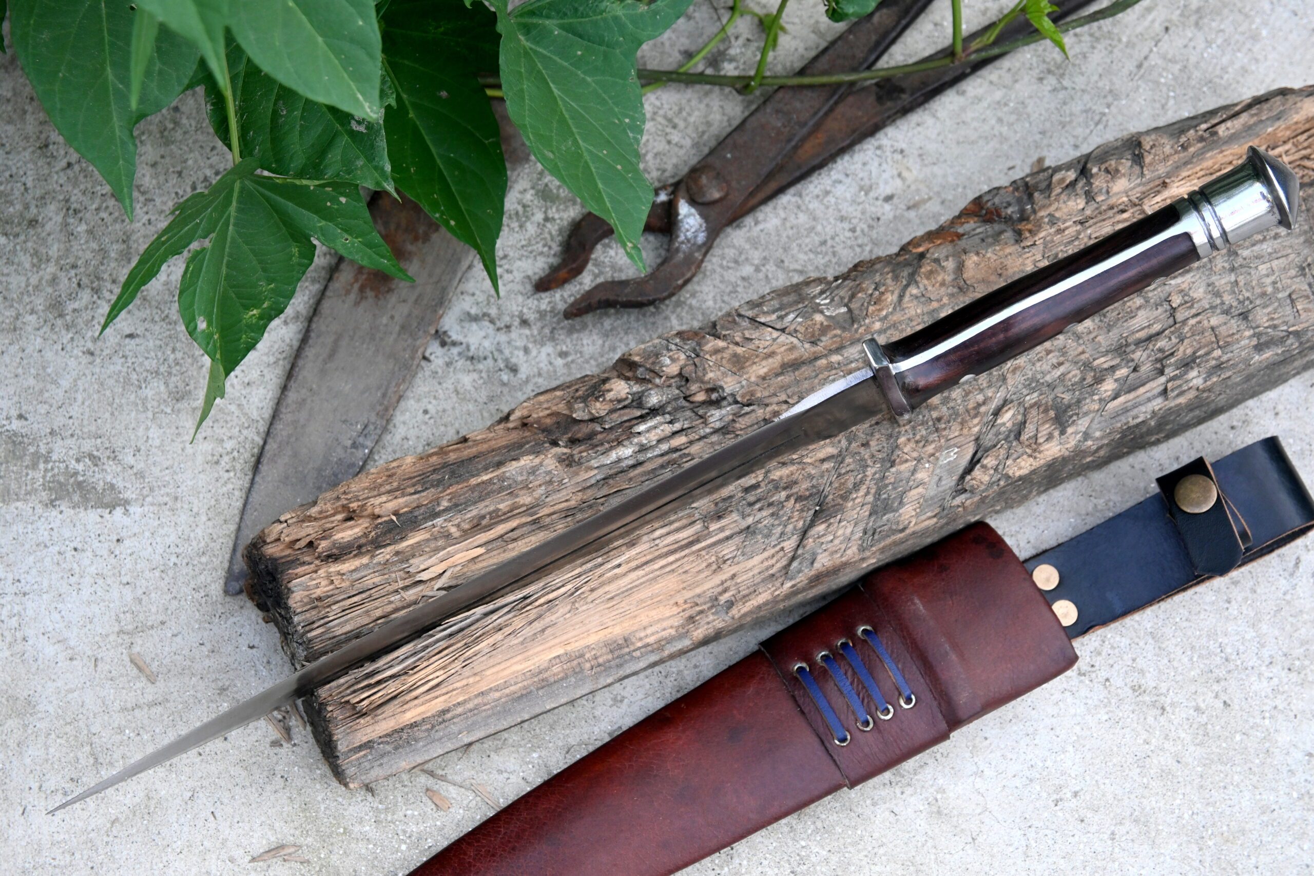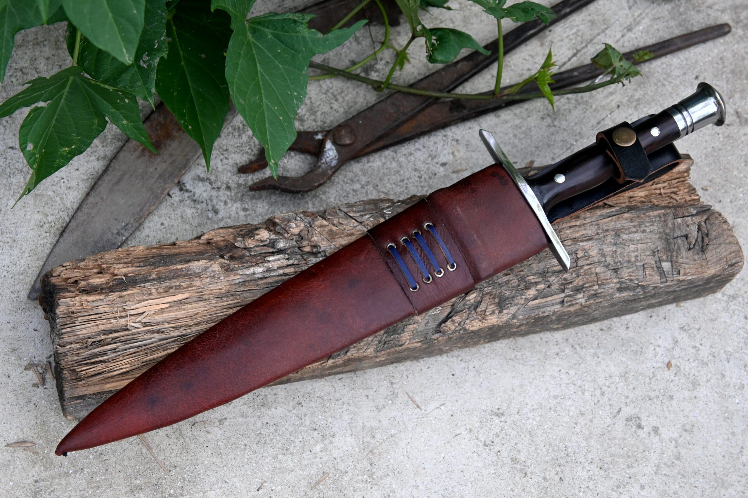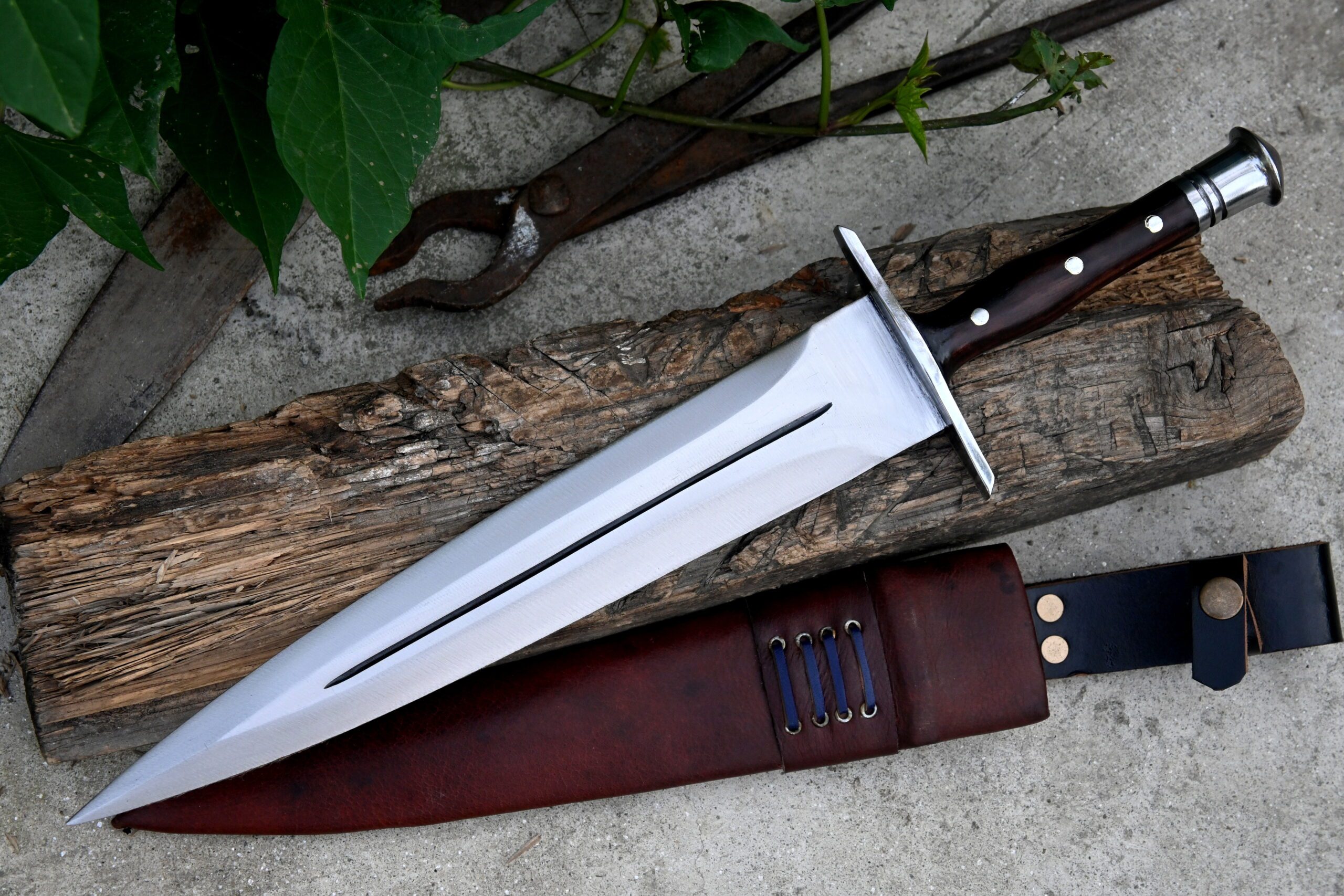 A custom leather scabbard accompanies the dagger, complete with a belt button on the handle for easy and secure carriage.