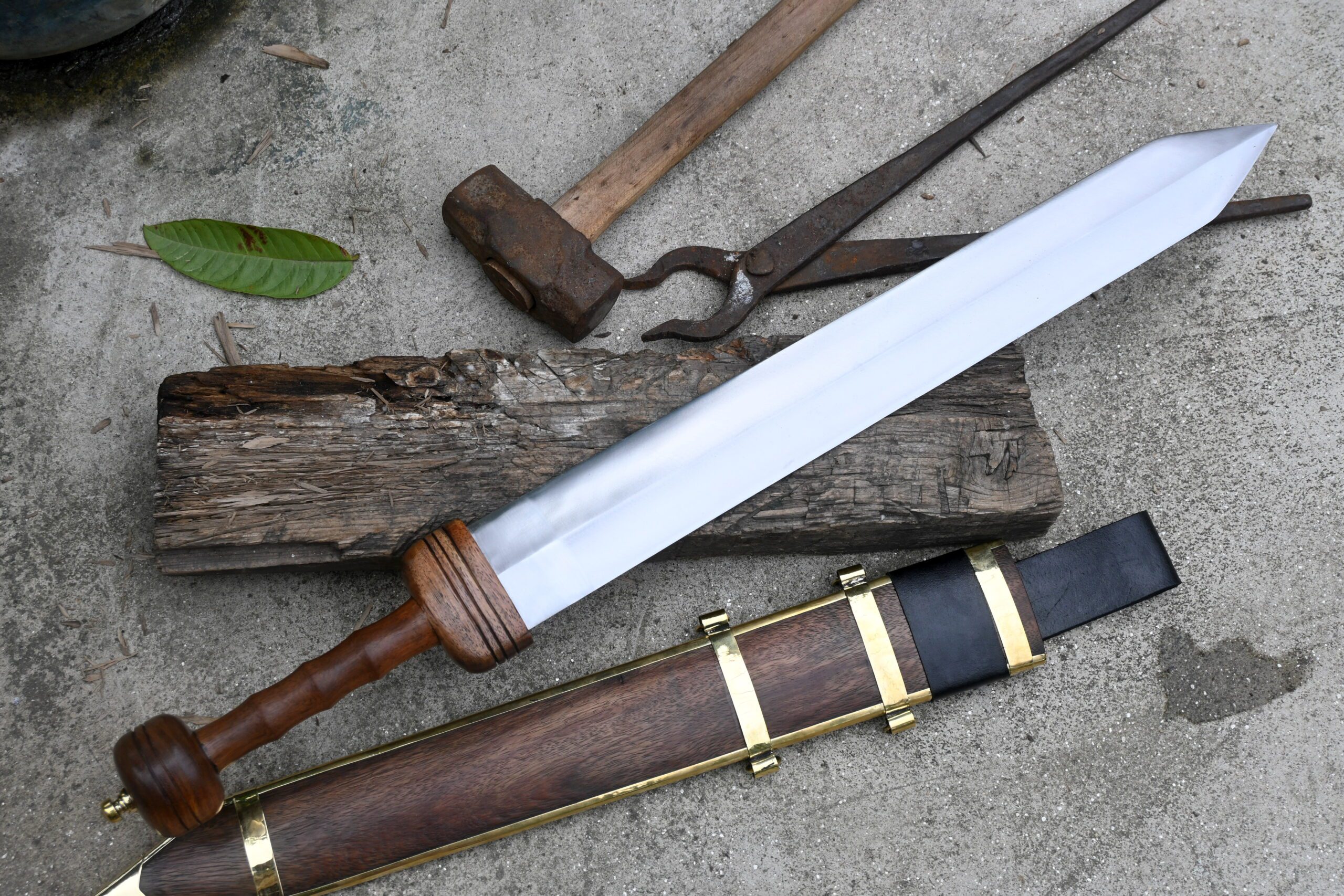 The included scabbard, reinforced with metal fittings, aligns with the design typically favored by higher-ranking Roman officers.