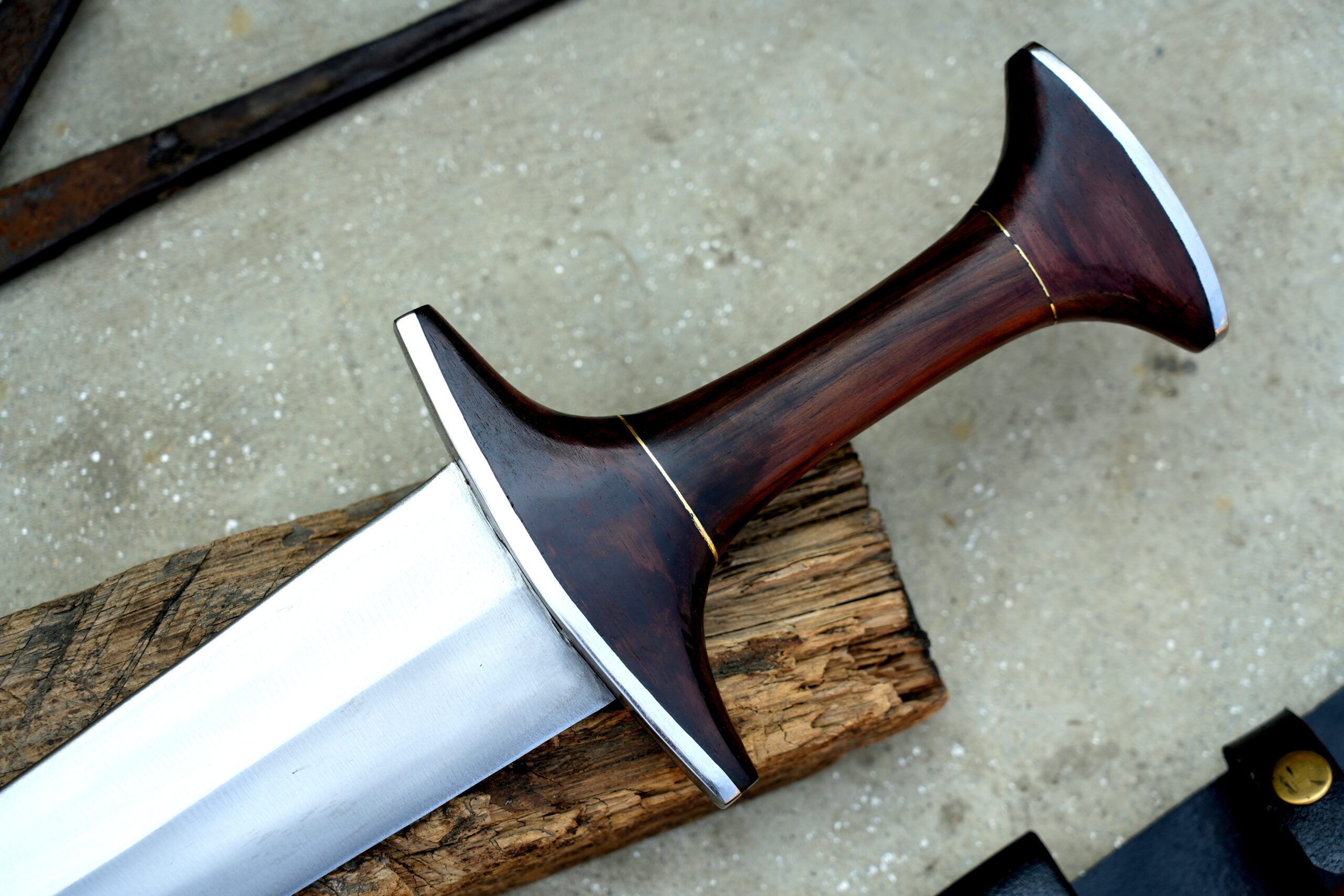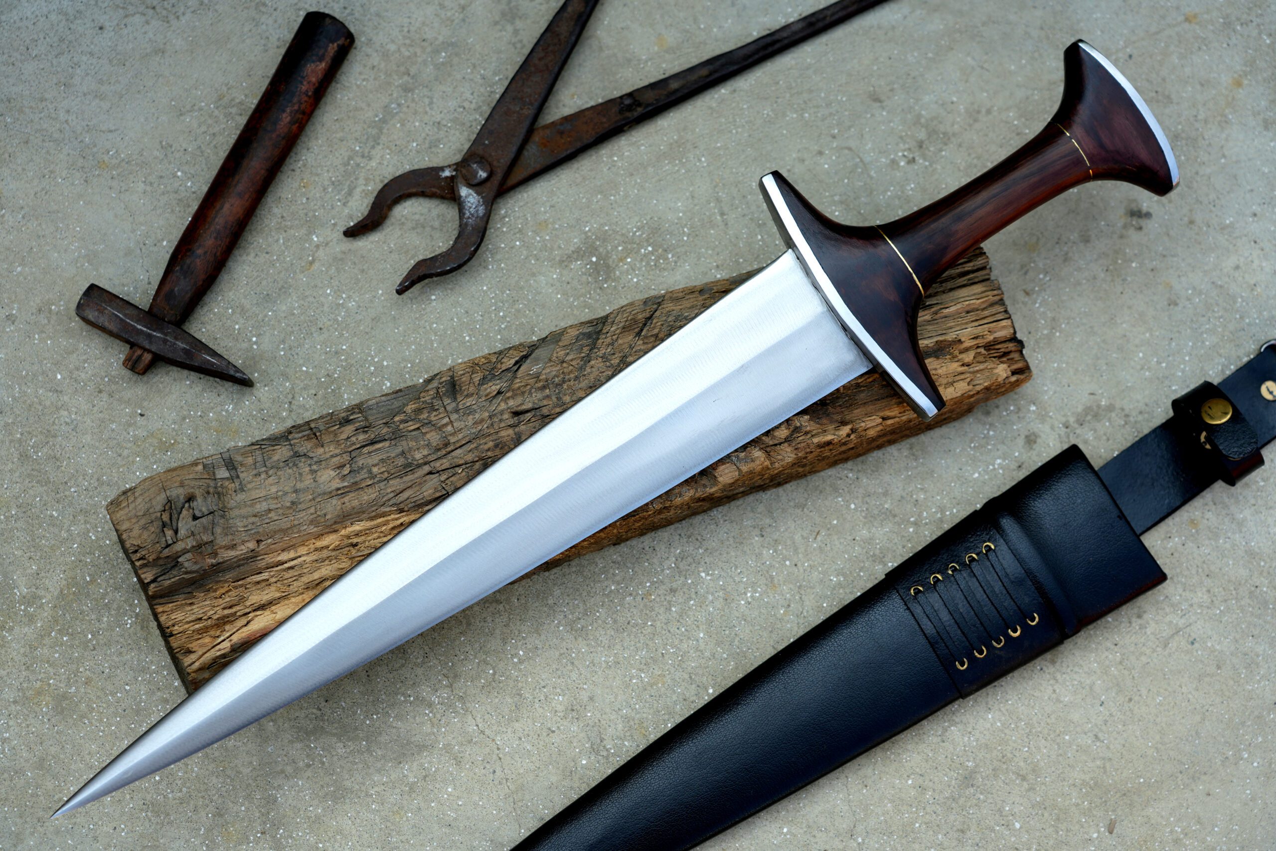 The blade is forged from durable 5160 spring steel, double-edged, sharpened, and reinforced with a central mid-rib to provide strength and stiffness, making it suitable for light cutting practice.