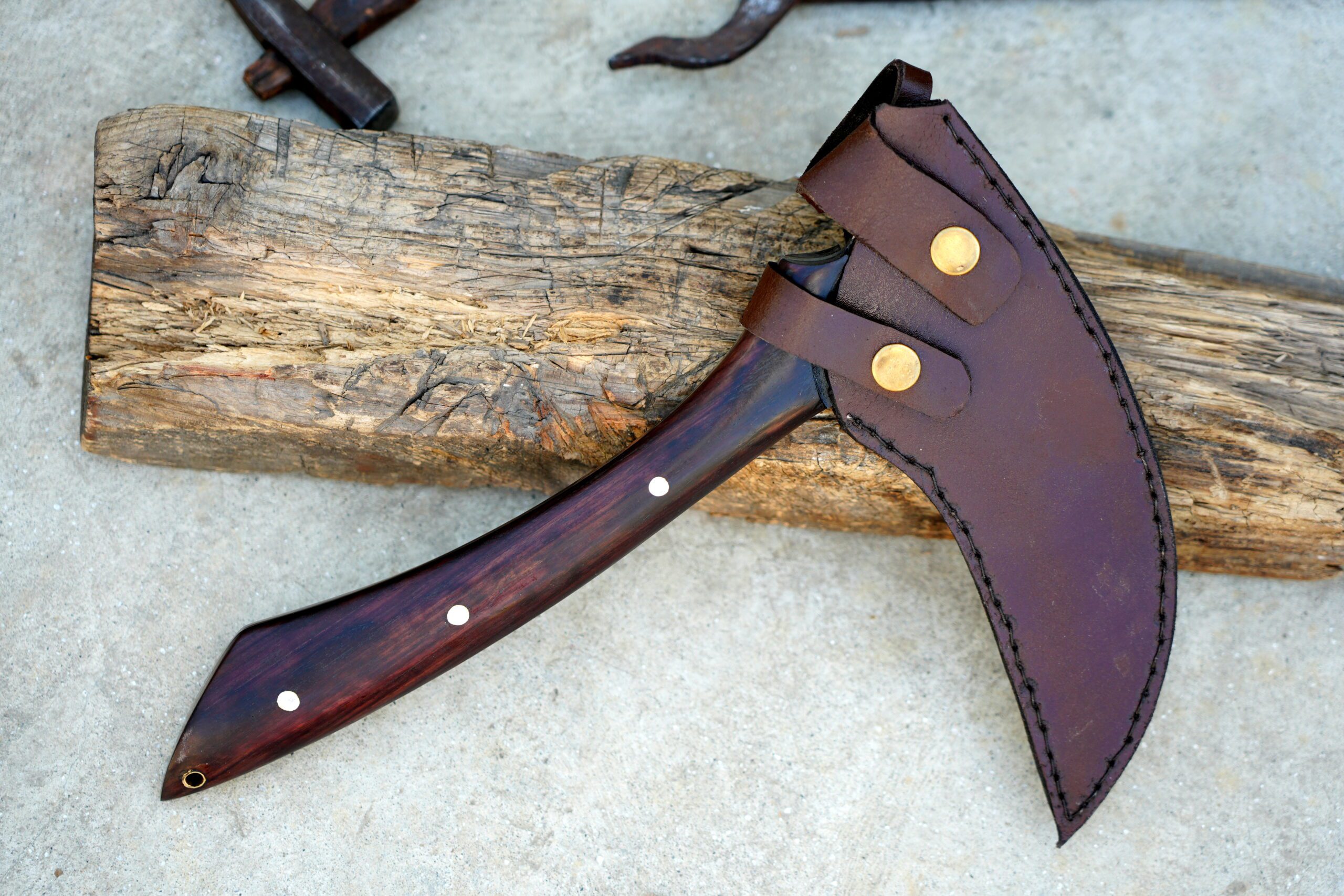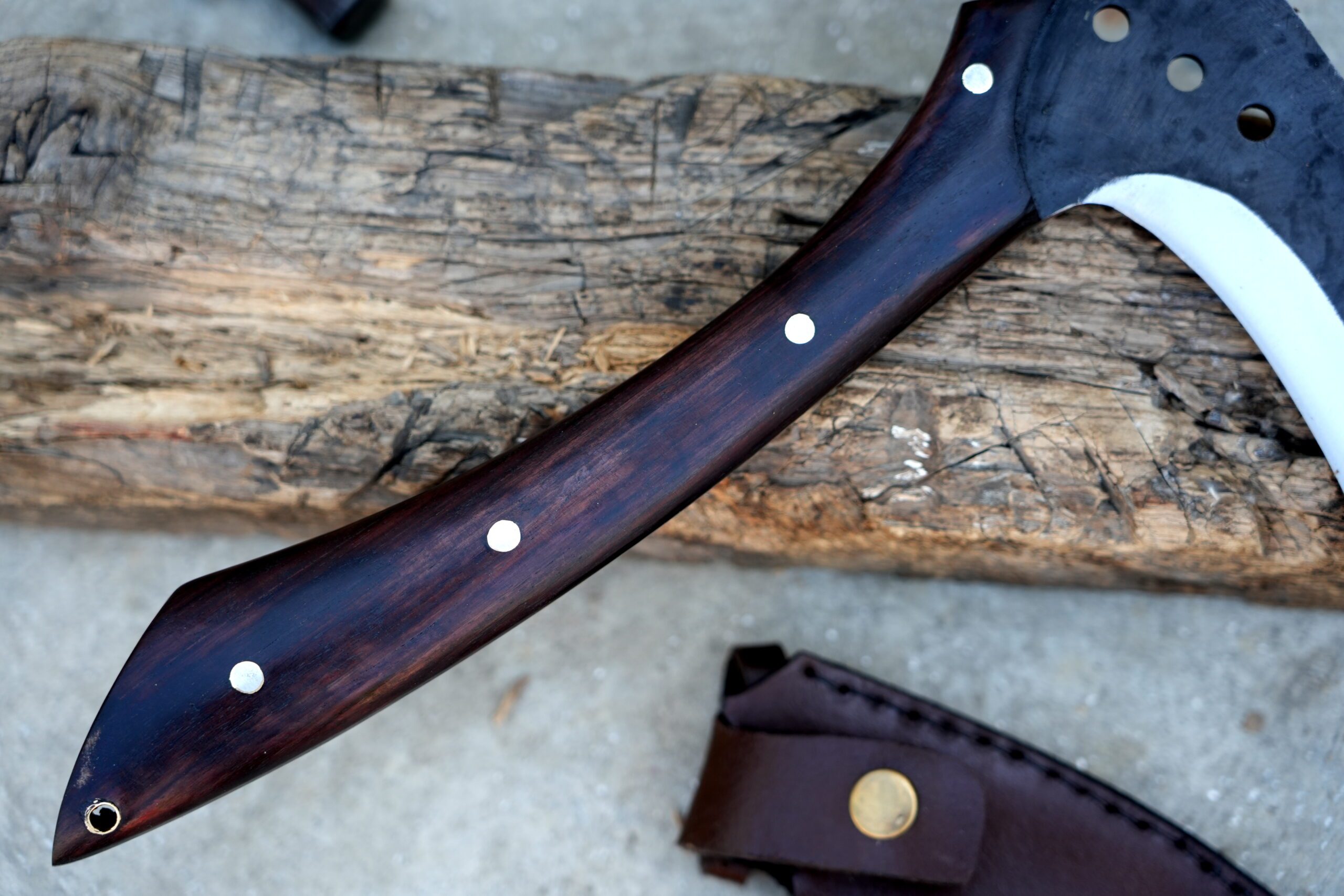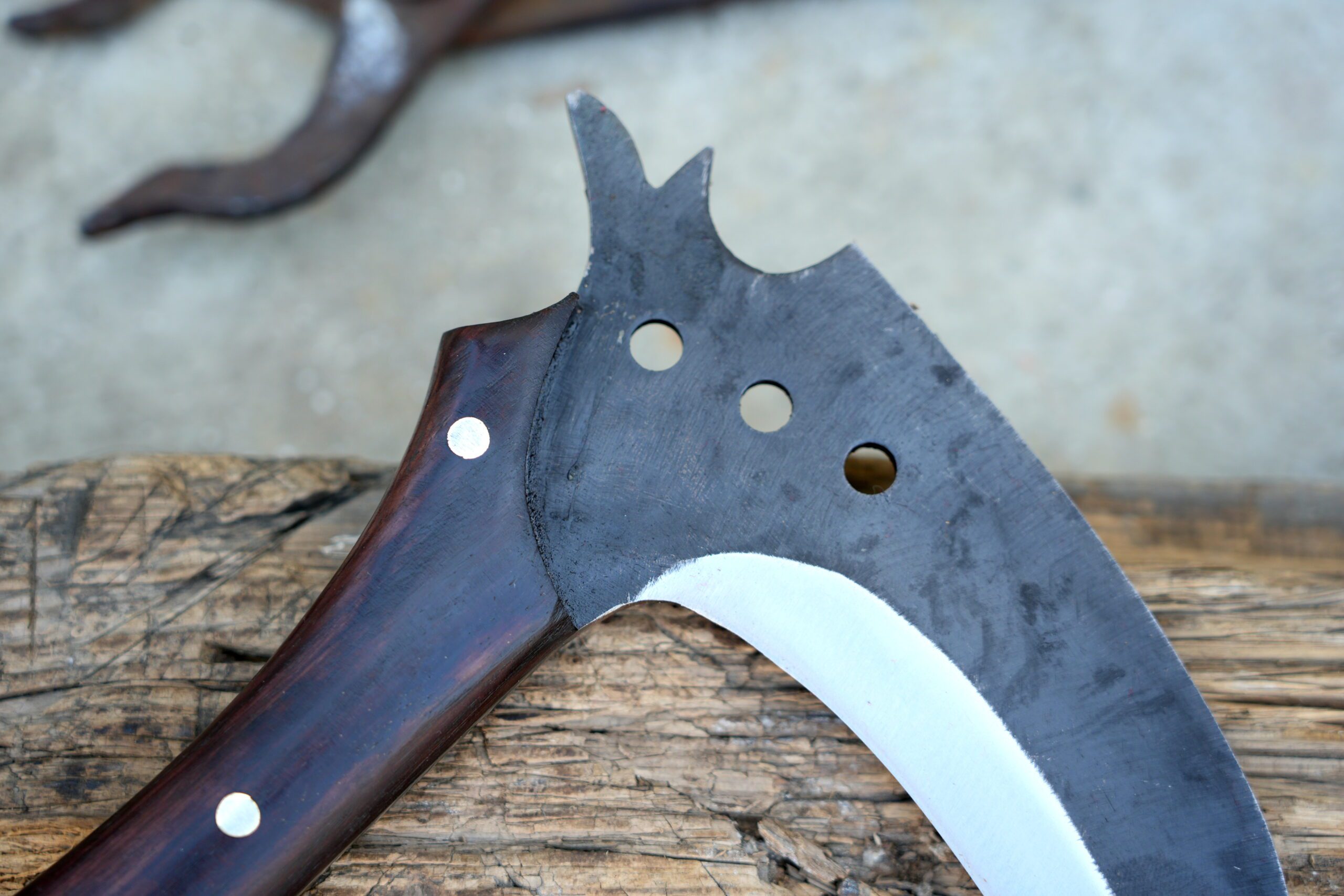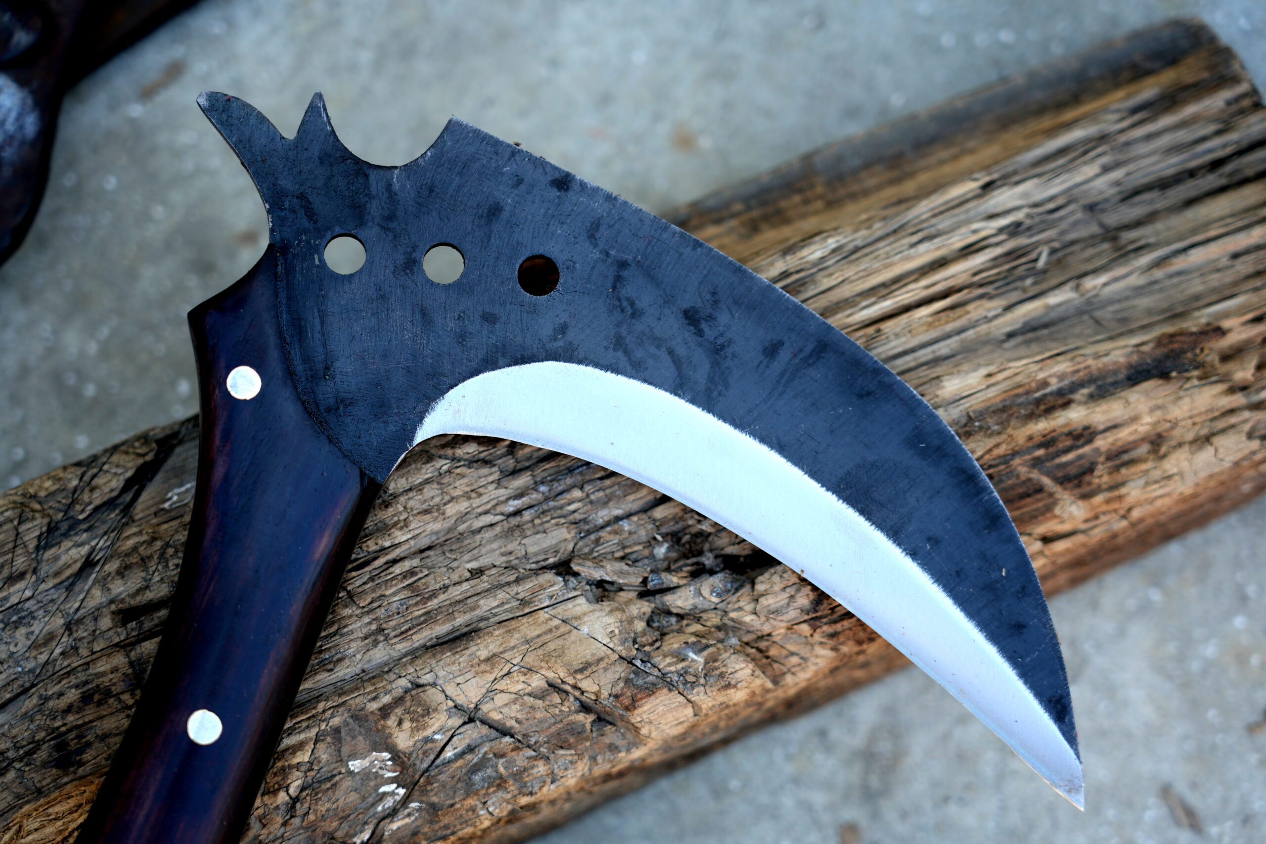 The curved hook blade is hand-forged from resilient 5160 spring steel, darkened for a stealthy appearance while leaving the sharpened edge whitened for striking contrast and functionality. A pointed spike at the butt of the weapon provides an additional option for bashing techniques in close combat.