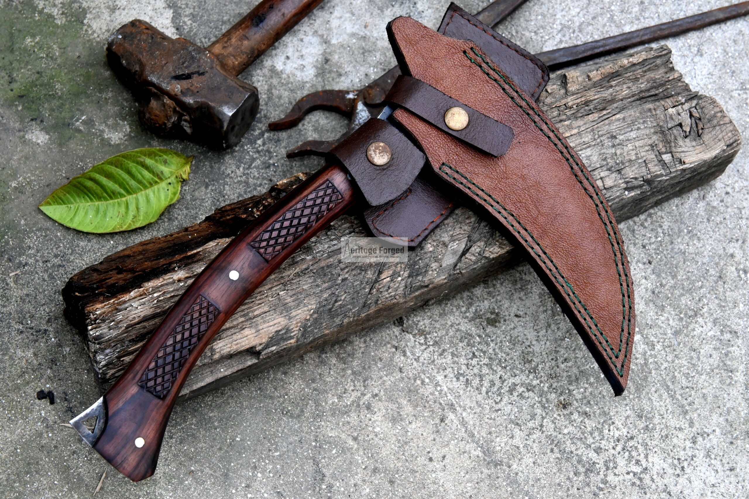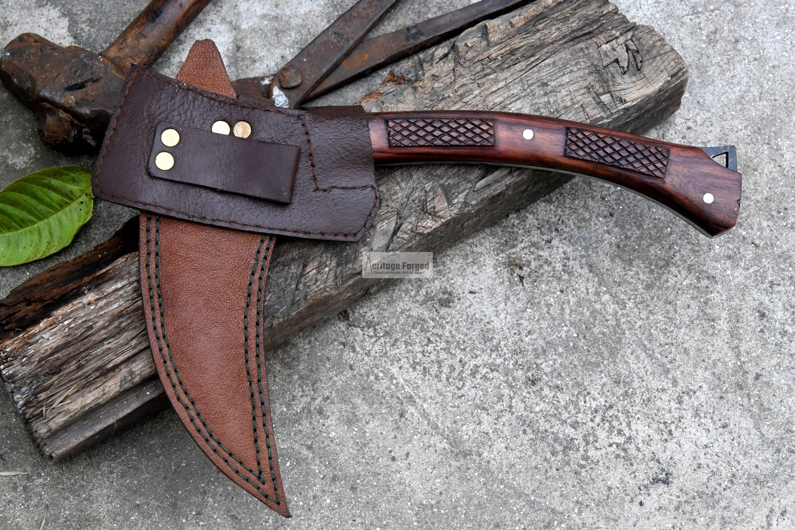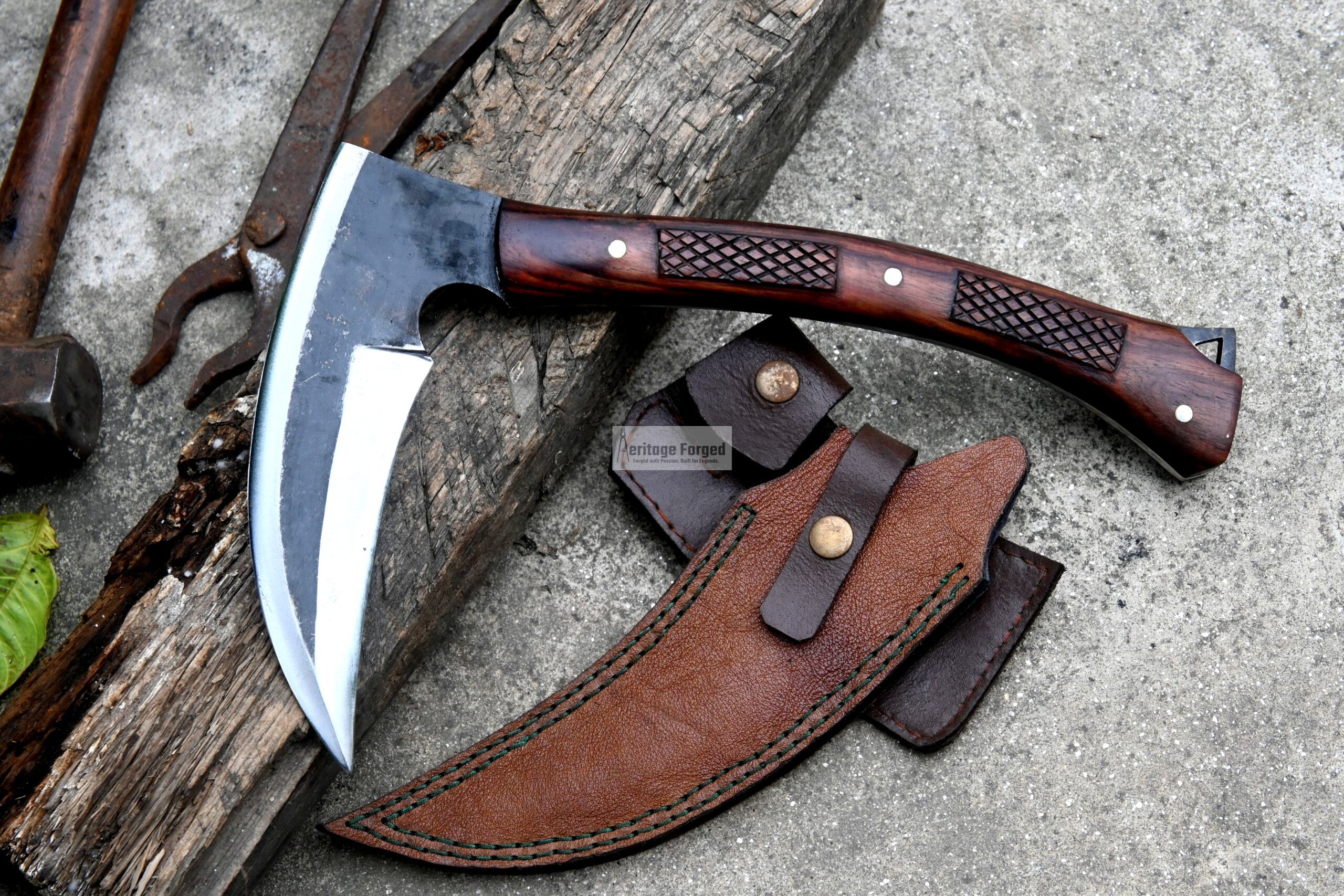 The blade is hand-forged from resilient 5160 spring steel, sharpened straight out of the box. Its darkened body offers a striking visual contrast, with the hooked, single-edged blade left whitened along the edge for a sharpened, refined finish.