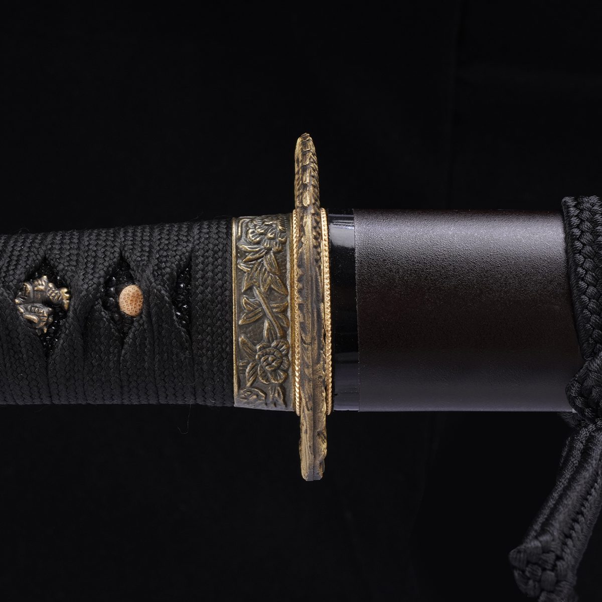 The tsuka (handle) follows the traditional build: real rayskin beneath a tight cord wrap in a diamond pattern. It’s all held together with a single wooden mekugi peg, locking the tang in place with no looseness.