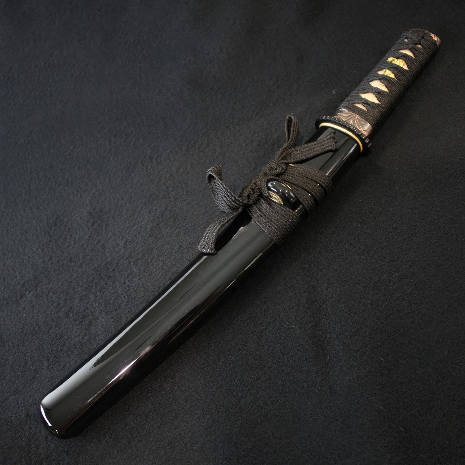 The tsuka (handle) of this tanto is covered in white same (rayskin) and held in place with black ito (handle wrap). The blade comes sheathed in a simple black glossy saya (scabbard) that has been lacquered. A sageo (carrying cord) is also attached to the kurigata (knob for sageo) so the tanto can be secured to one's obi (belt).