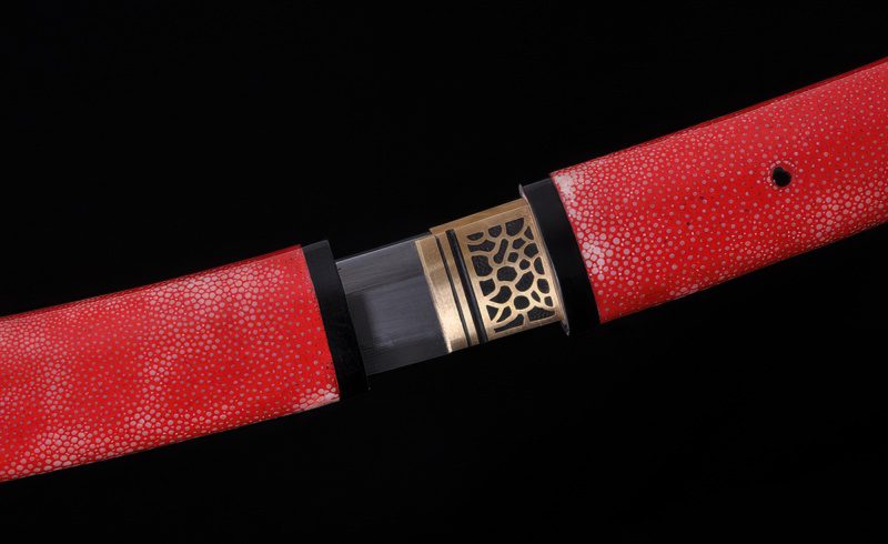 The handle and scabbard are made from wood, adorned with smooth rayskin and a shiny gloss finish. The scabbard fittings feature authentic bull horn, while the brass handle fittings can be fully disassembled.