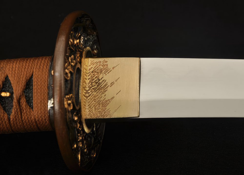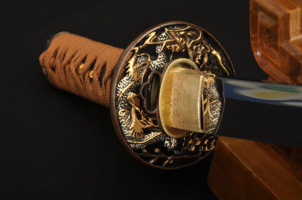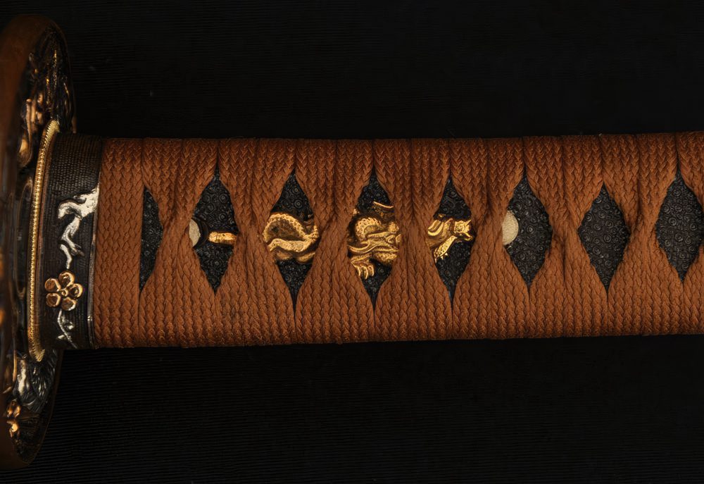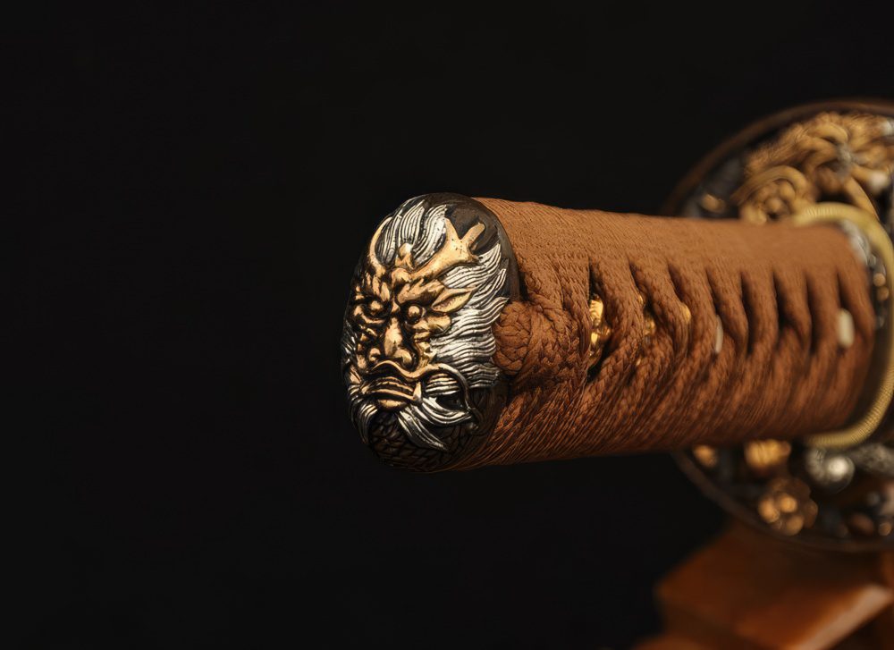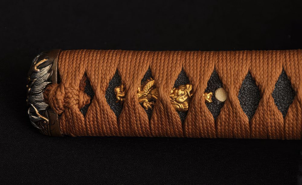 Its double-pegged full tang handle is tightly wrapped with rayskin under tsuka-maki. The scabbard is made of hardwood and given a robust matte finish. The fittings, forged out of alloy and brass, follow a Japanese dragon motif symbolizing bravery and courage.