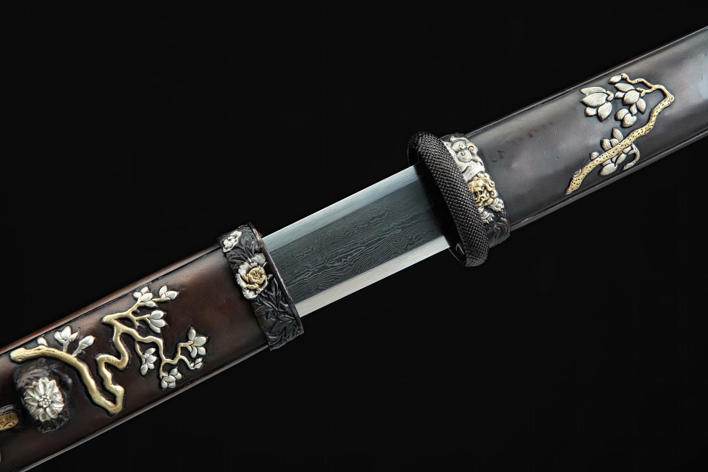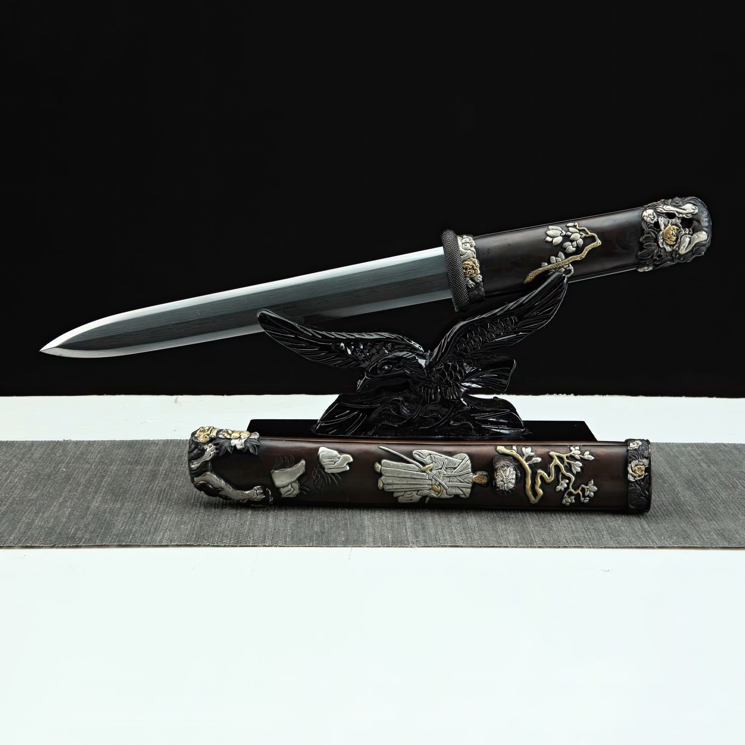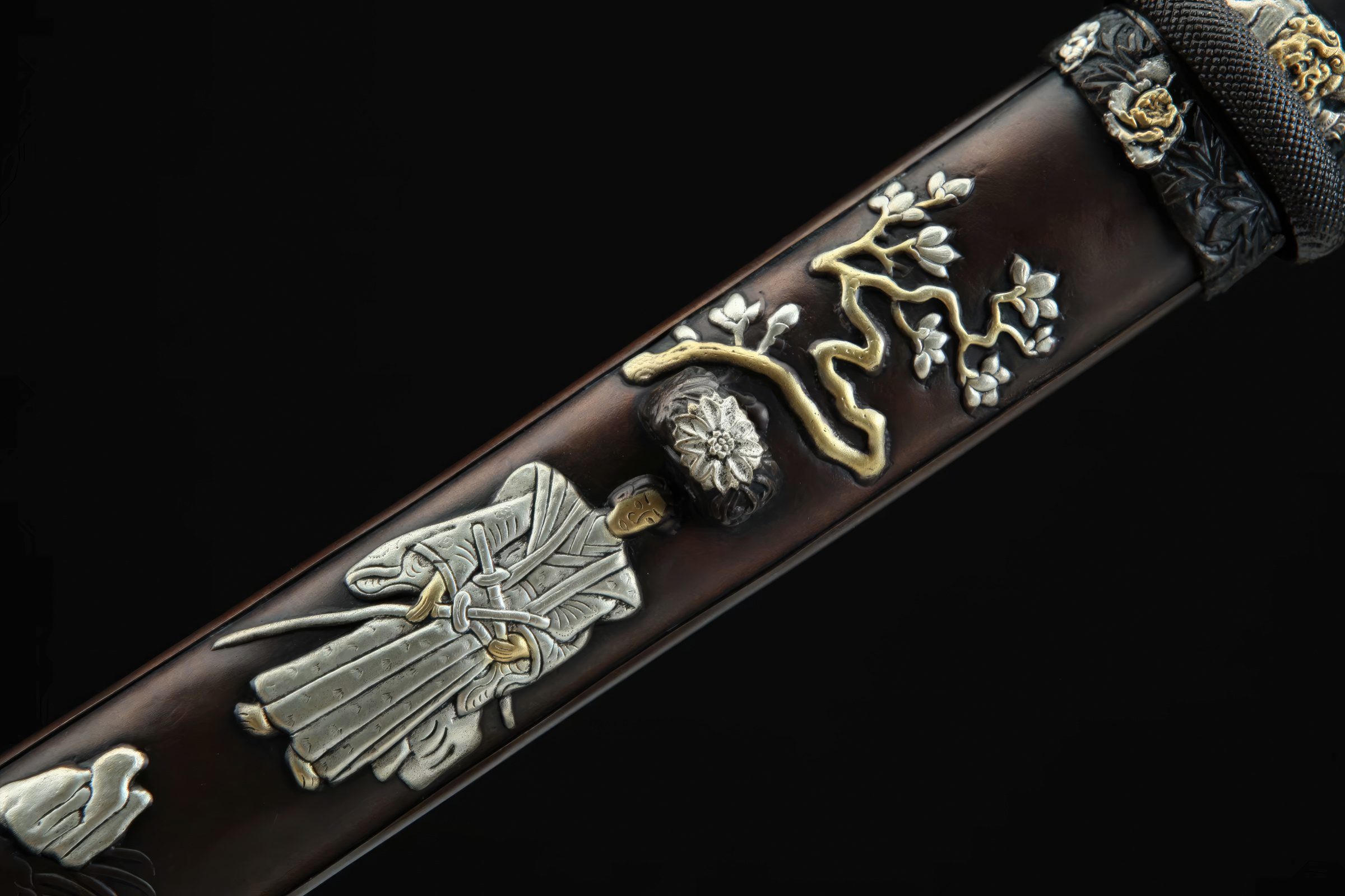 The fittings, constructed of brass, grace the wooden handle and the scabbard, featuring carvings of Japanese samurai with sheathed Katana swords and cherry blossoms above them. As perfect home decor blending Chinese and Japanese swordsmanship, this short sword is ideal for any collection and can even be sharpened for functional cutting practice tests.