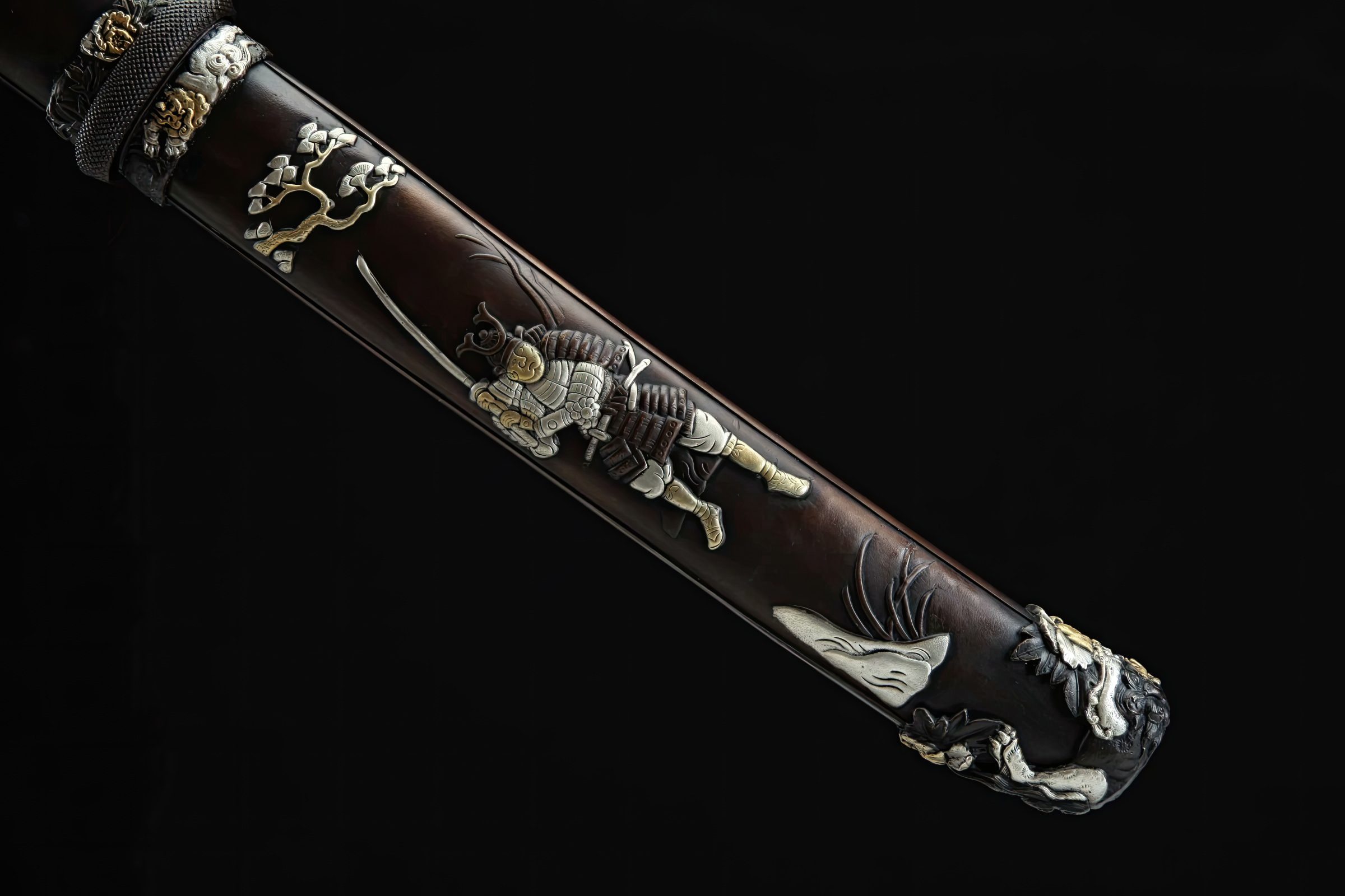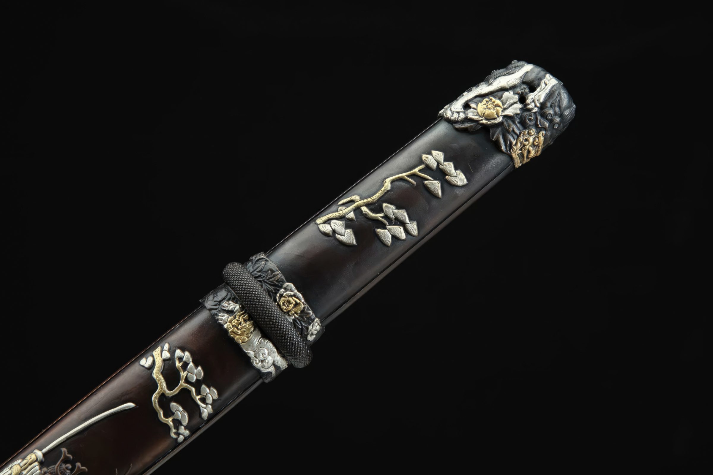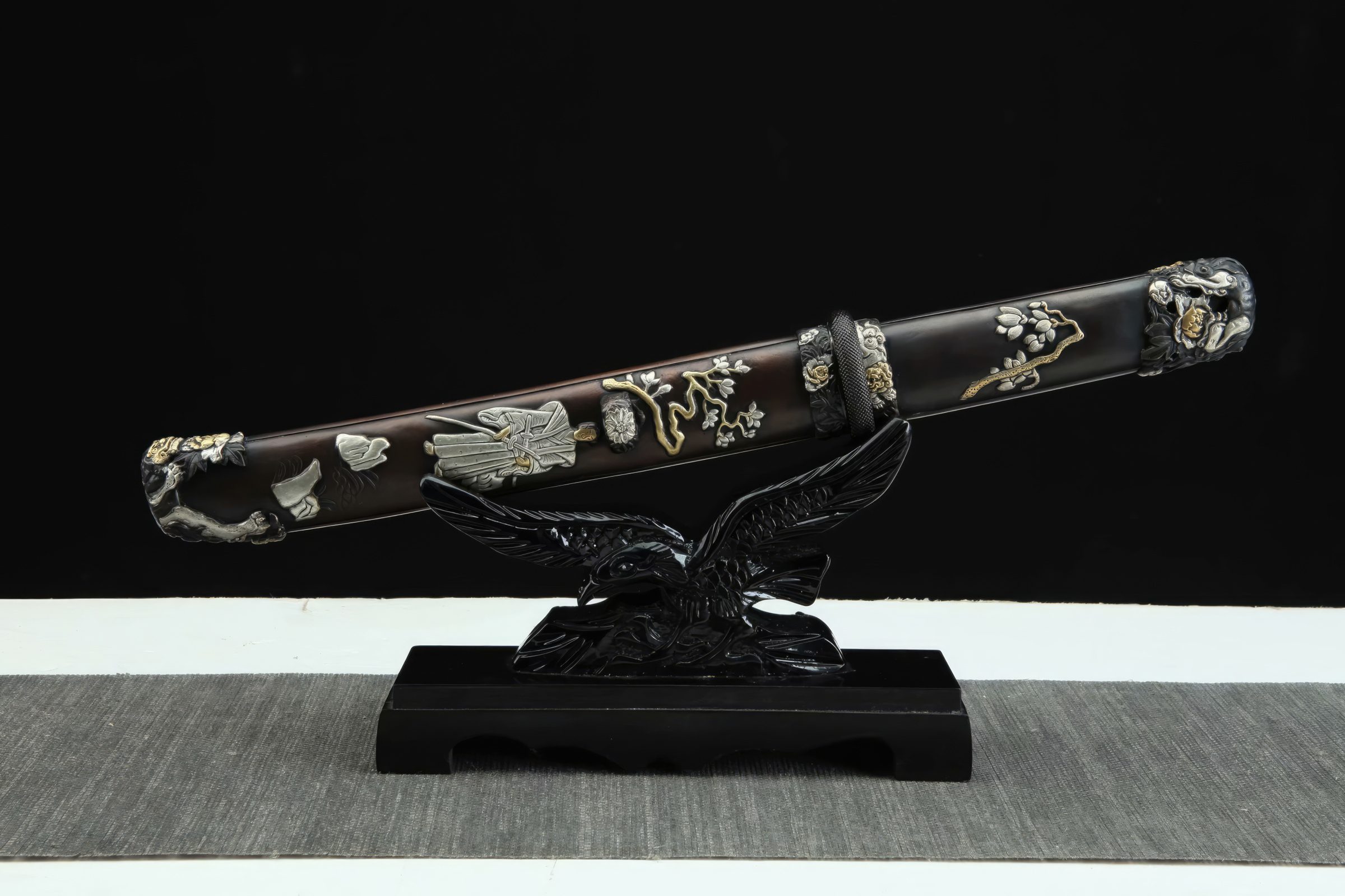 The fittings, constructed of brass, grace the wooden handle and the scabbard, featuring carvings of Japanese samurai with sheathed Katana swords and cherry blossoms above them. As perfect home decor blending Chinese and Japanese swordsmanship, this short sword is ideal for any collection and can even be sharpened for functional cutting practice tests.