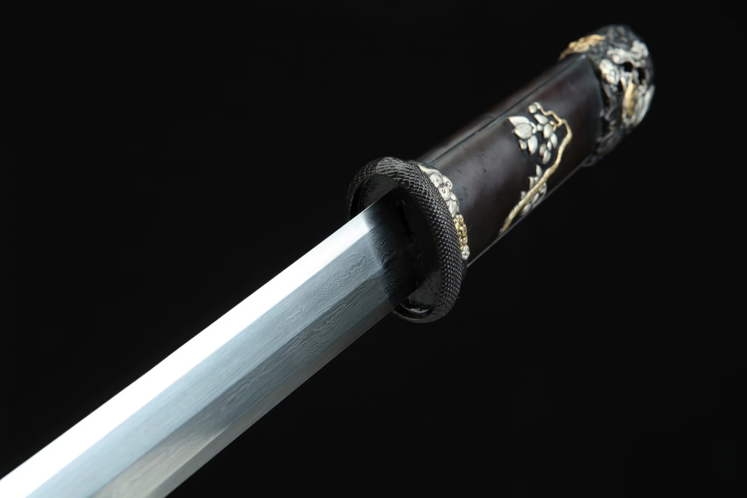 This is a short, dagger-like, double-edged Chinese Jian, blended with elements of the Japanese samurai Tanto-sword. It's named the "God Tang Dynasty Dao", referring to the influential Tang Dynasty (618-907) swords that inspired later Japanese samurai swords. This sword is crafted from pattern steel, folded multiple times to create Damascus-like blade patterns.