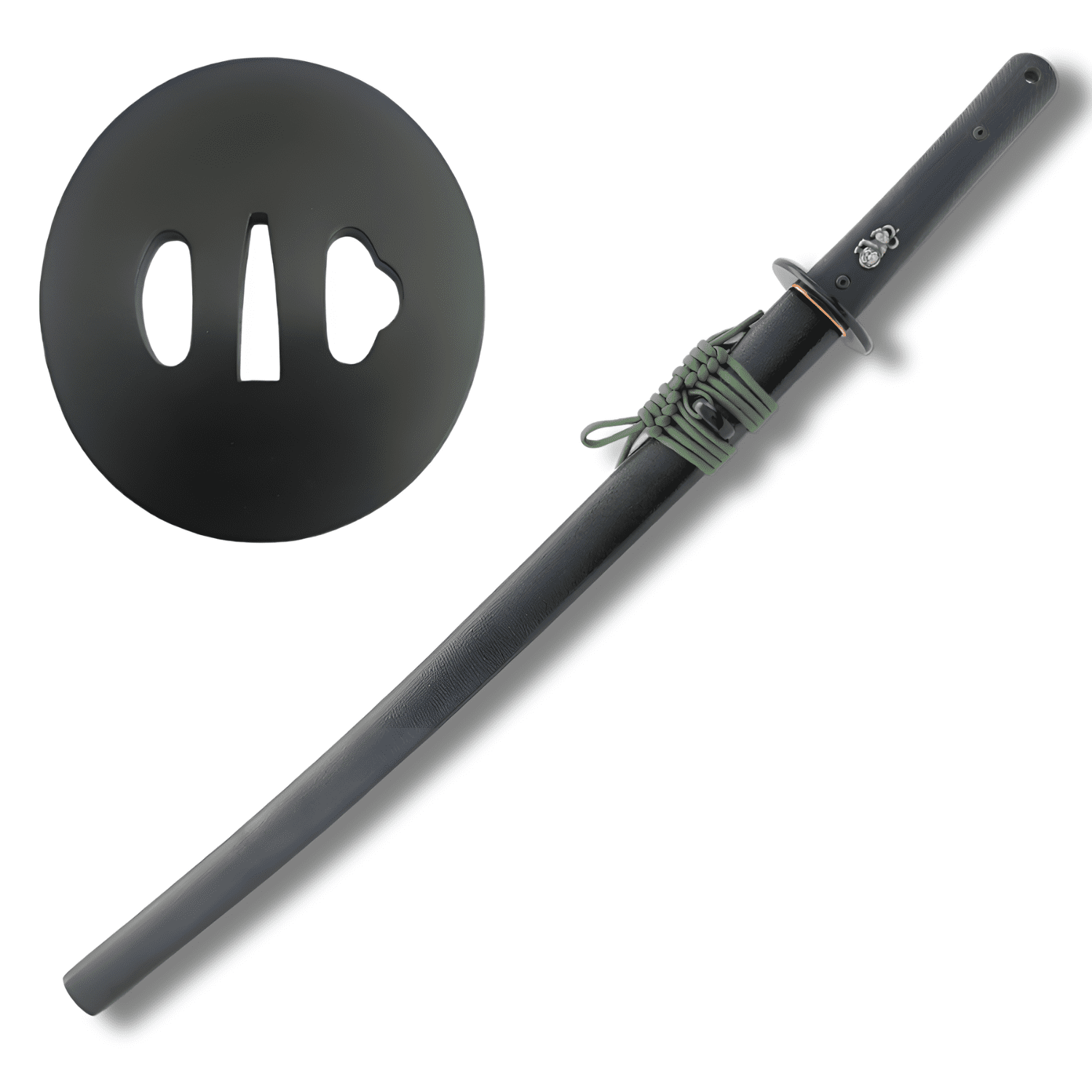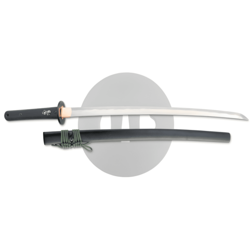 Completing this wakizashi is a textured black saya fitted with polymer kurigata and kojiri, along with an olive paradors sageo. This design is also available as a tanto.