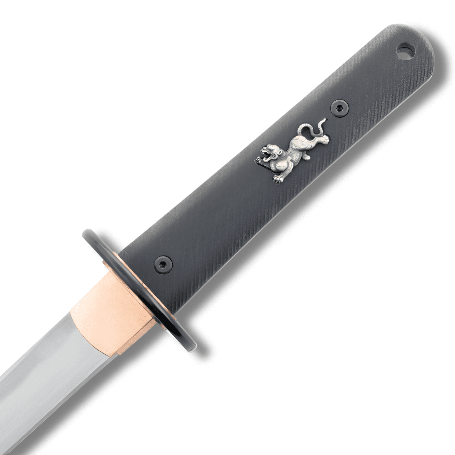 Unlike traditional wakizashi, the textured tsuka for this sword that encapsulates the tang is made of G10, a high pressure fiberglass laminate known for being lightweight, strong, and durable. Two unremovable pins further secure the blade to the tsuka.