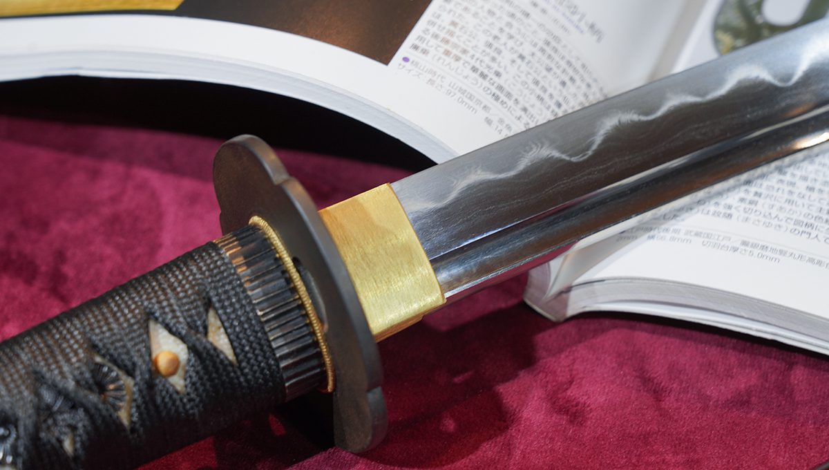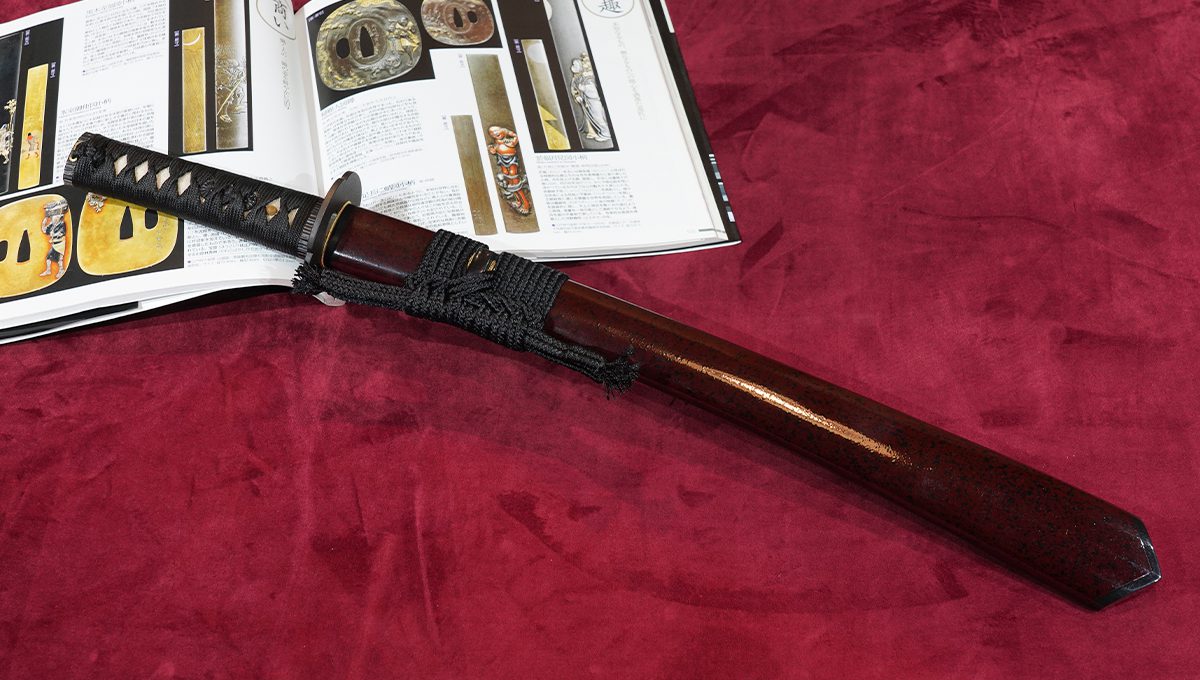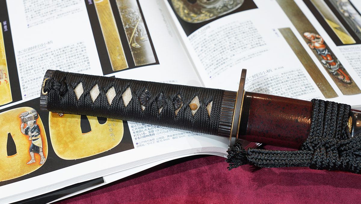 The handle includes hishigami, small folded paper triangles placed under the tsuka-maki wrap to uphold its shape and provide a firmer grip.