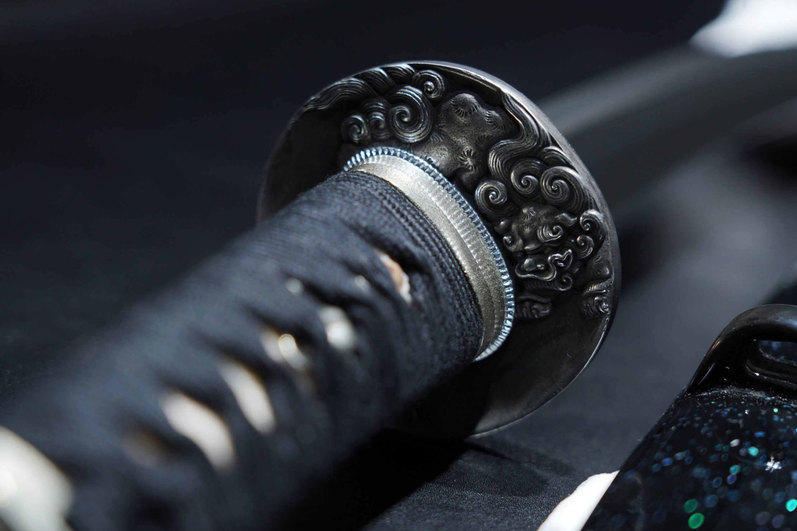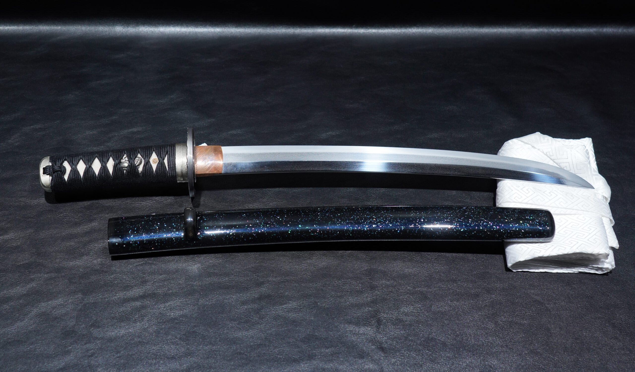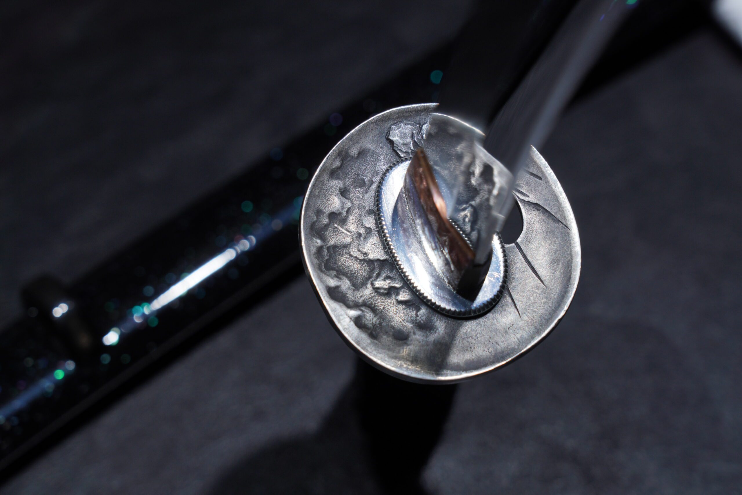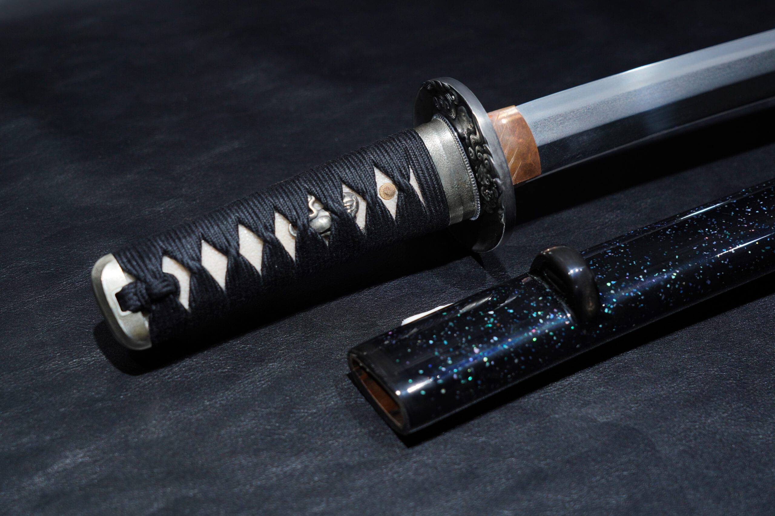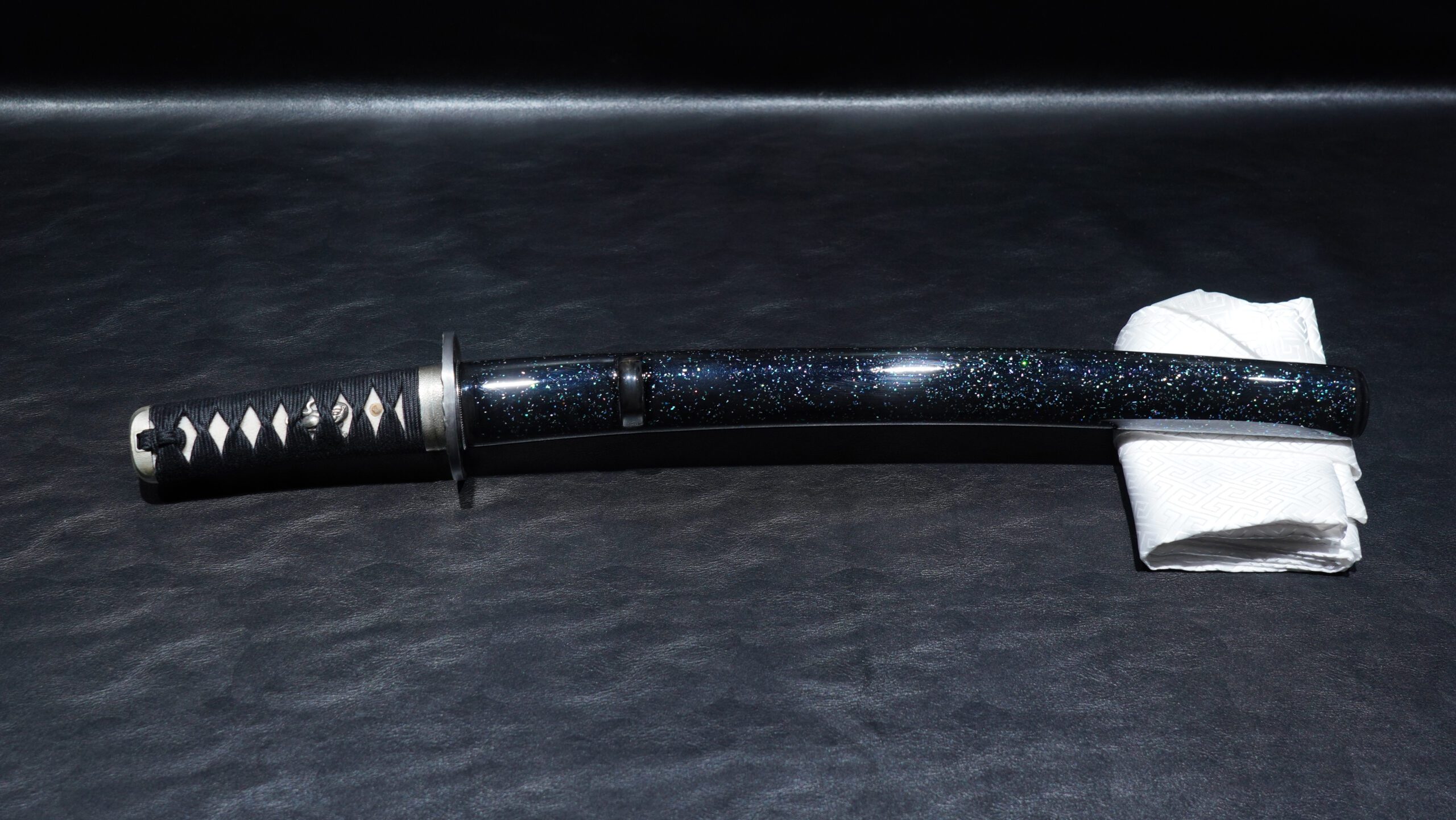 One mekugi secures the blade to the wooden Haichi style tsuka covered in white samegawa and wrapped in Japanese imported kapok tsuka ito. The blade is sheathed in a saya with high hardness piano paint and gives the appearance of a starry night. The scabbard is also fitted with cupronickel shitodome with an antique finish.