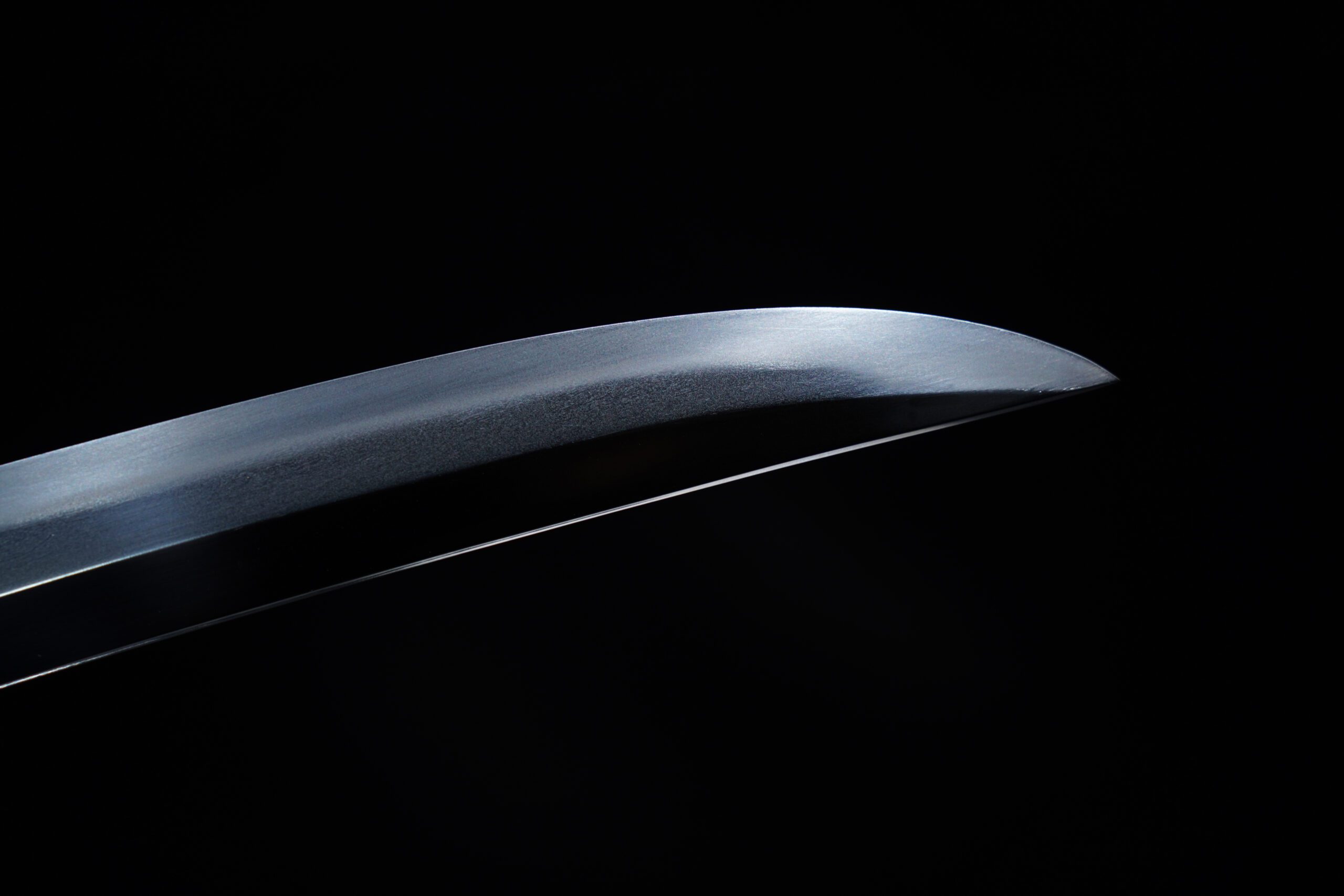 Shadow Dancer's Shishi Shobu Zukuri Wakizashi is a subtly sophisticated piece with a shobu zukuri (curved blade with shinogi close to the mune, but without yokote) blade forged from crucible steel and differentially heat treated to become strong and resilient while retaining its edge remarkably well. Due to the clay tempering process, the blade also has a suguha (relatively straight) hamon accentuated through Sashikomi polishing.