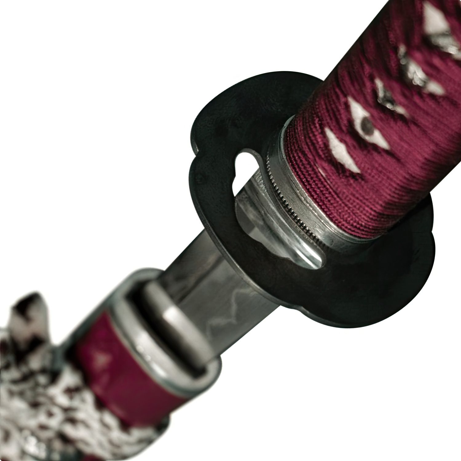 The saya, painted with a dark red hand-rubbed lacquer, gives the sword a medium gloss finish. This is beautifully accented by silver elements and the handle is tastefully wrapped with a maroon and white-wine sageo. Silver elements such as the kurikata, koikuchi, and sayajiri complete the design, making the ORASAKU ZUKURI HONSANMAI WAKISASHI (S05W) a symbol of tradition and artistry.