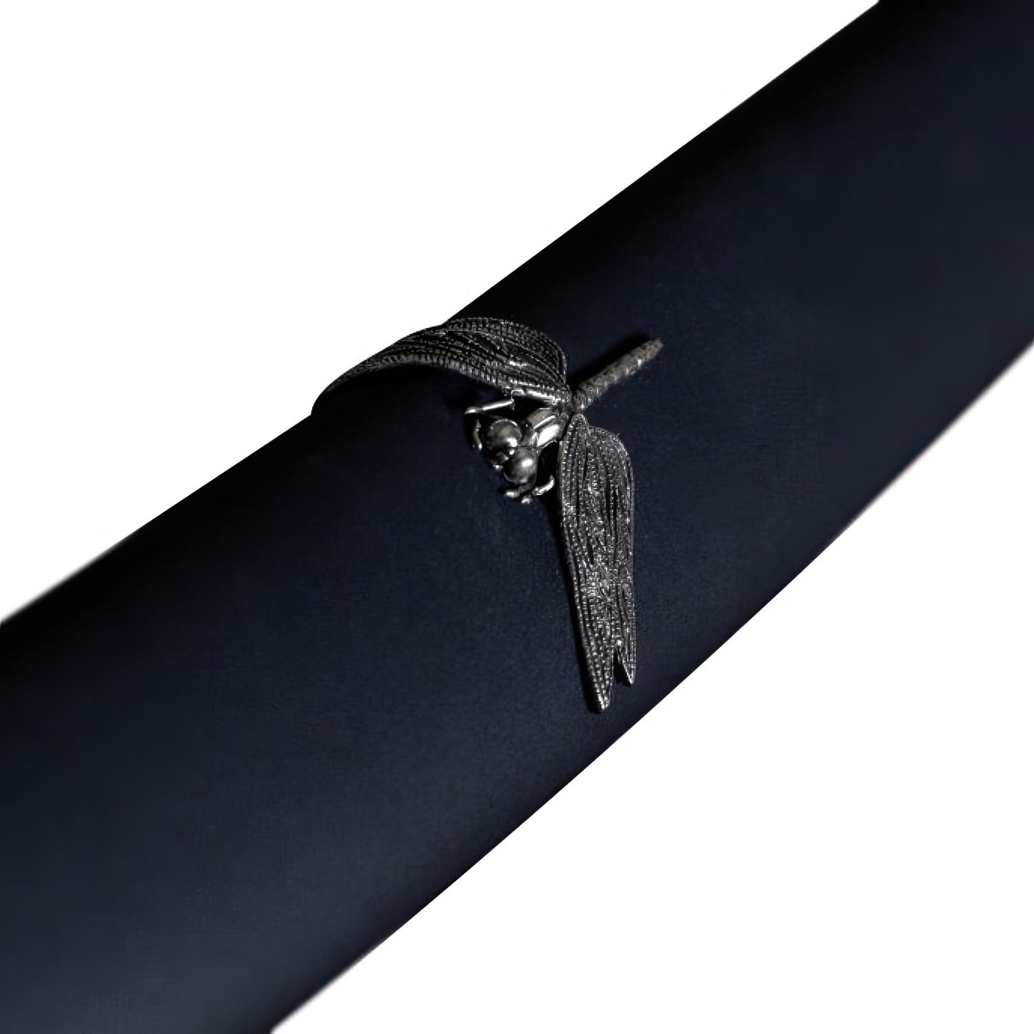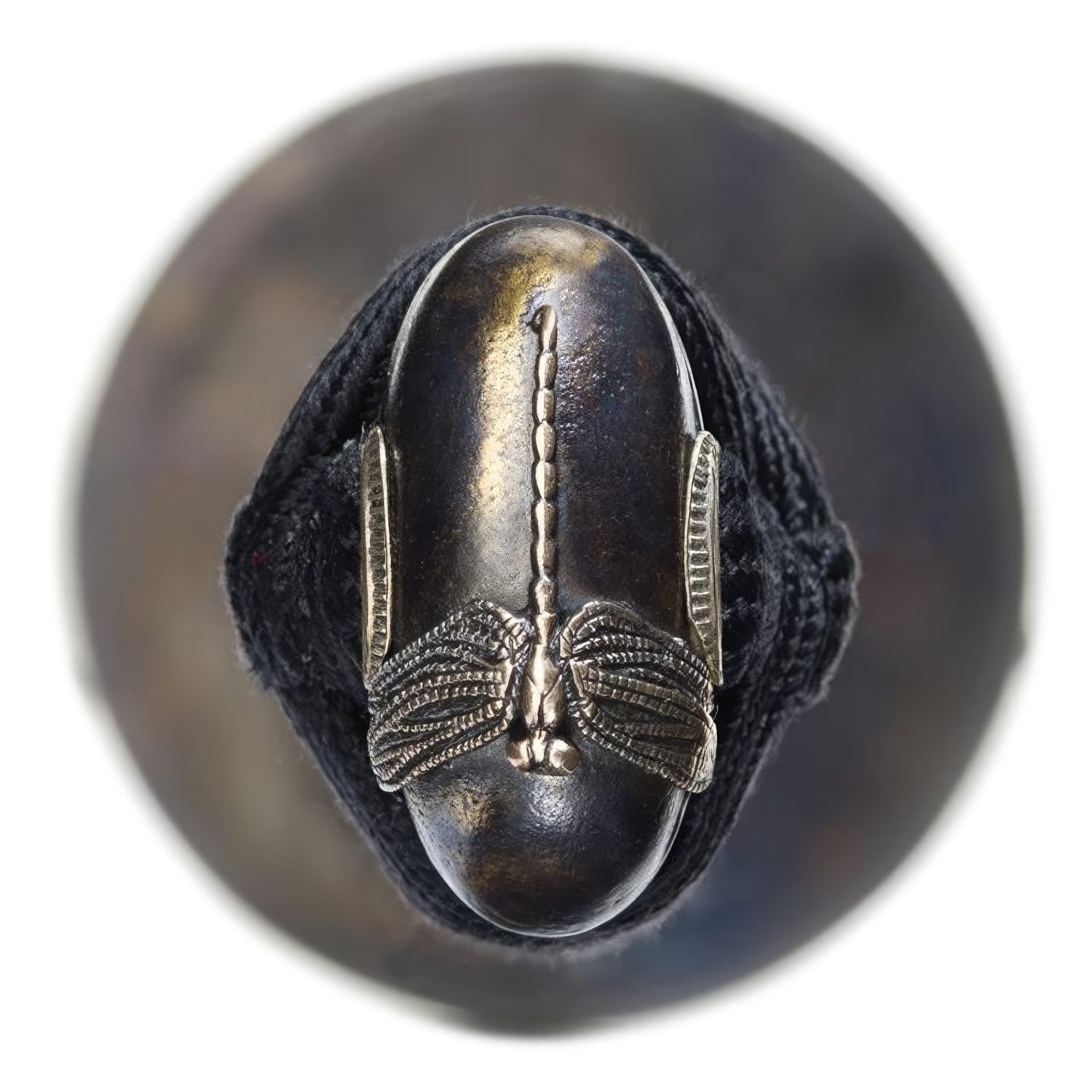 This sword is equipped with high quality fittings with tondo (dragonfly) motif, as seen in the blackened copper maru gata (round) tsuba, copper fuchi and kashira, along with the silver menuki. The seppa and habaki are plain silver. Securing the blade's tang to the rikko (hourglass) tsuka is two mekugi for added stability.