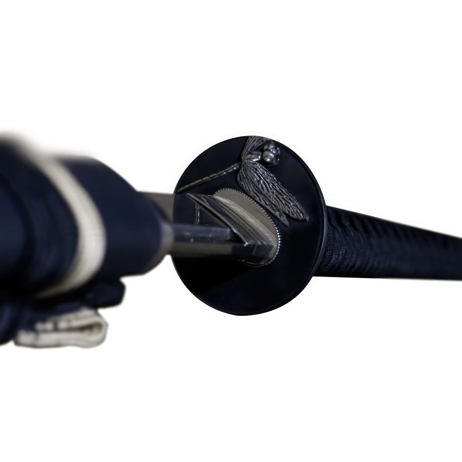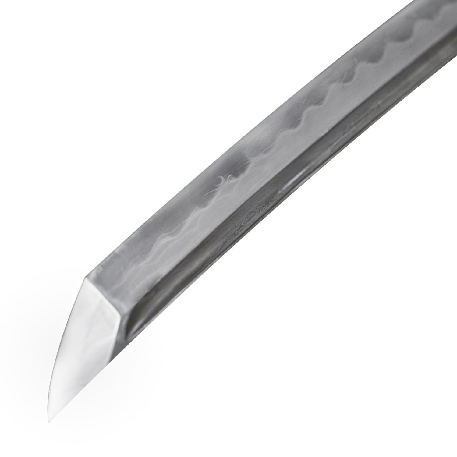 Clay tempered and water quenched, this results in a hardness of 60 HRC for the edge and 35 HRC for the blade along with a distinctive notare hamon that adds to the overall aesthetics of the blade. This exquisite shinogi zukuri (with yokote and shinogi close to the mune) is then hand polished with excellent hada and hand sharpened as well. The blade also has a bohi that helps to decrease the wakizashi's weight and improve its point of balance.