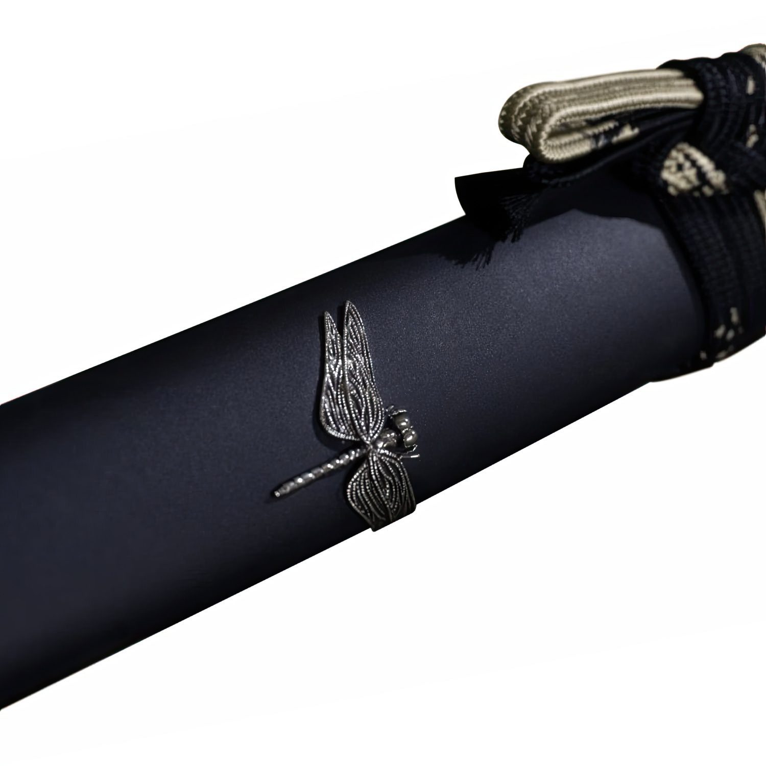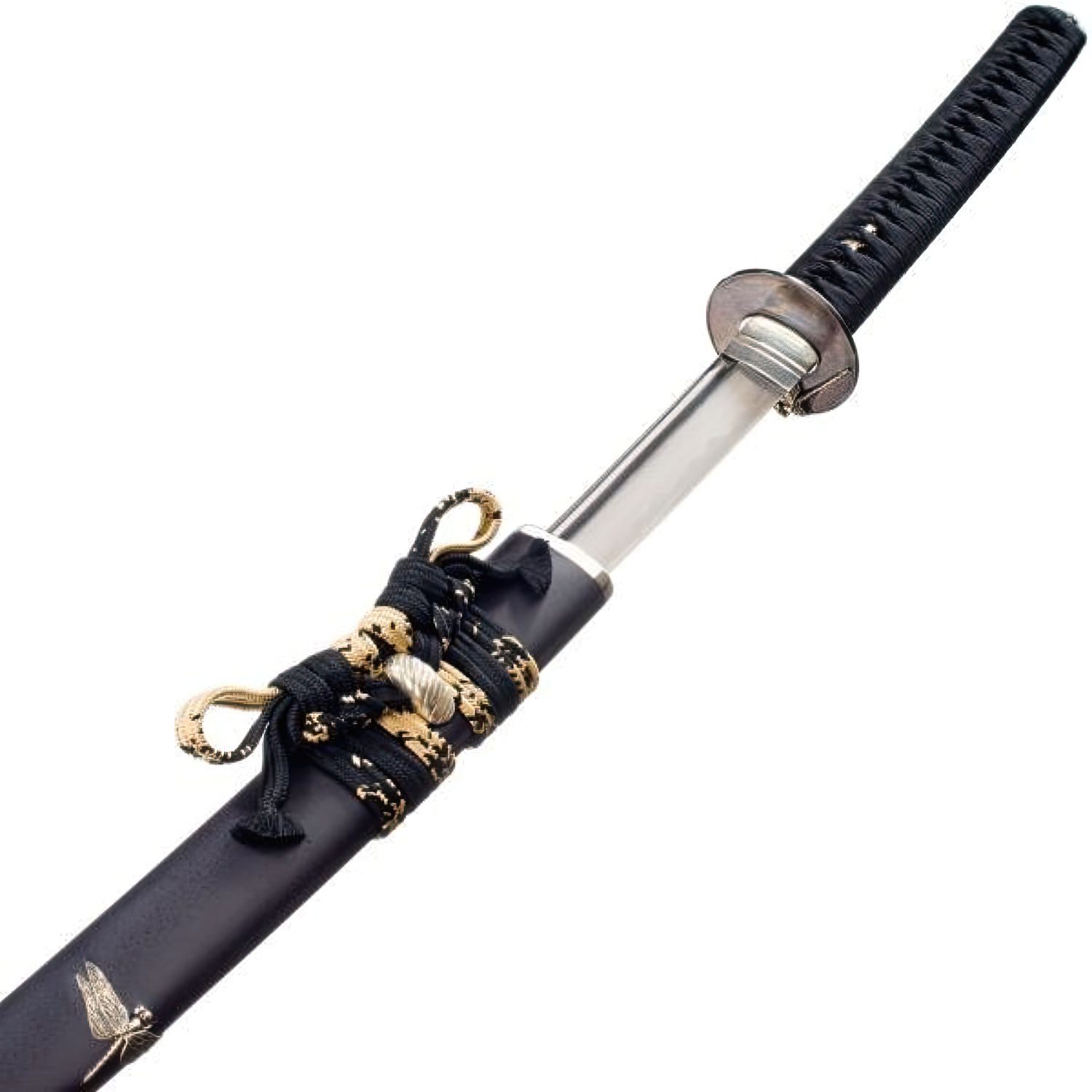 This graceful looking Tonbo Sanmai Wakizashi from Thaitsuki has a triple steel structure blade hand forged from folded 1060 high carbon steel (to 1024 layers) for the body of the blade and the harder 1095 high carbon steel for the edge.