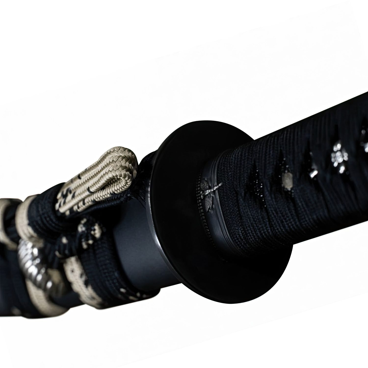 The wooden handle is then covered with genuine black same and wrapped tightly with black silk tsuka Ito in the hinerimaki style. It comes with a dark purple saya with a matte finish fitted with silver kurigata, koiguchi, and kojiri, along with a silk sageo in brown and black. This wakizashi's design is also available as a katana, making it the perfect Daisho set for any sword enthusiast.