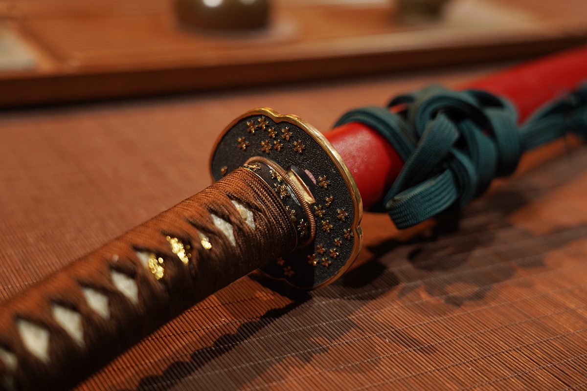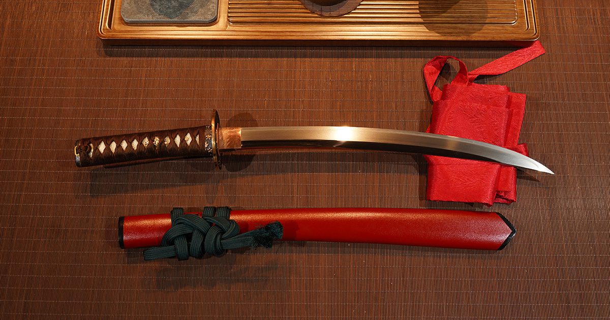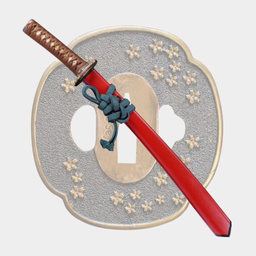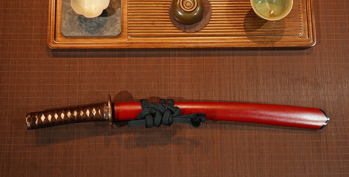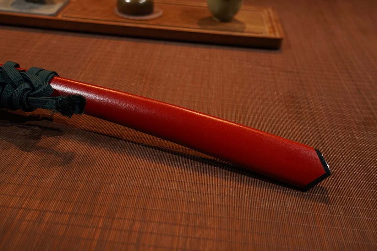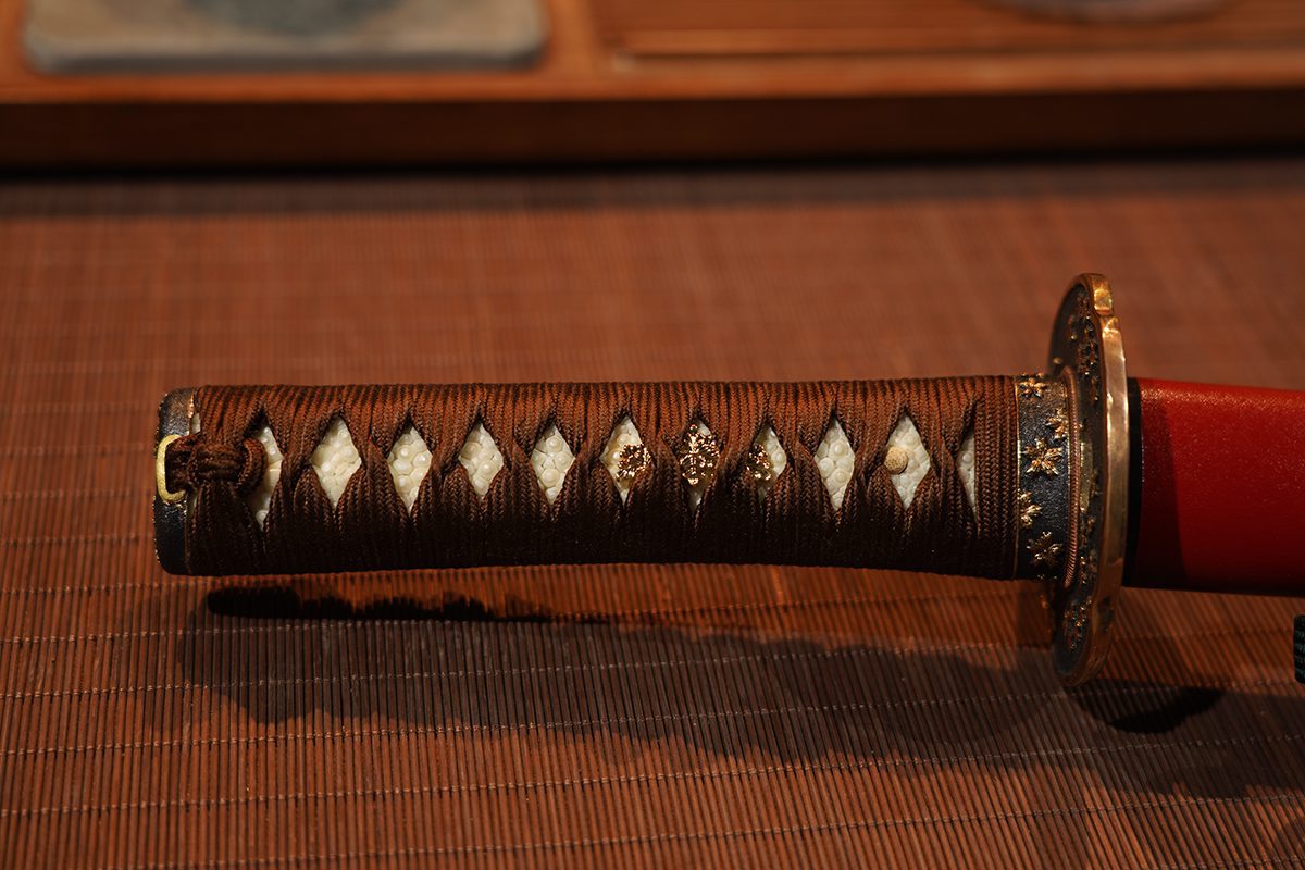 The overall look of this wakizashi is complemented by its handmade Haichi style tsuka (handle) covered in white large emperor node same (rayskin) and wrapped in brown silk ito (handle wrap) from Japan. It comes sheathed in a red oil lacquered saya (scabbard) with horn koiguchi (mouth of scabbard), kurigata (knob for carrying cord), and kojiri (scabbard end cap). The brass shitodome (mounting on kurigata opening) prevents the fraying of the brown silk sageo (carrying cord) from Japan.