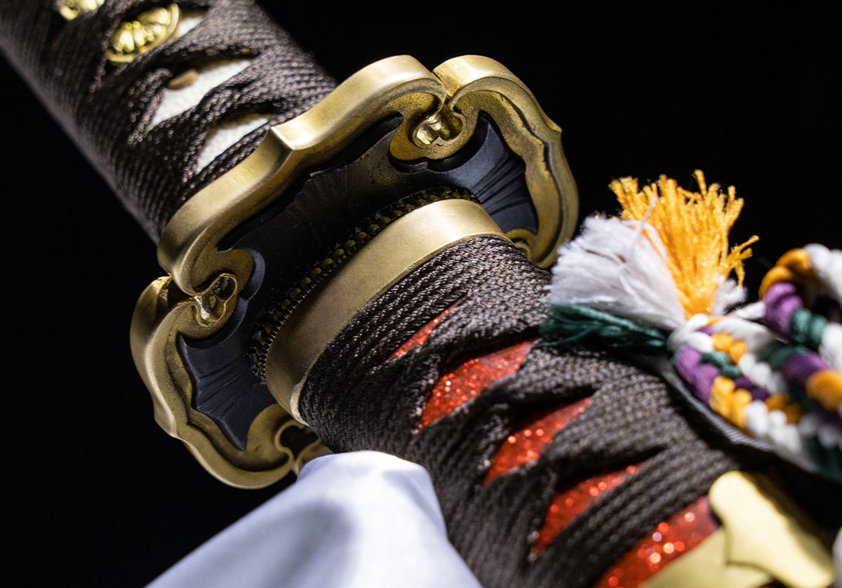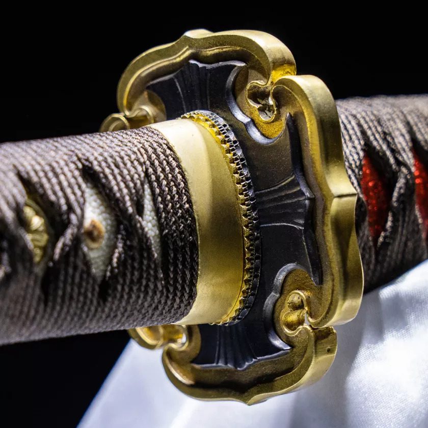 Shadow Dancer's Kinriko Muji Tachi is an ornate and masterpiece that reminds us of the beauty of Japanese sword art. Featuring a shinogi zukuri (curved with yokote and shinogi close to the mune) folded steel blade forged from 1060 high carbon steel and, the differential heat treatment results in a stunning blade where the jihada and suguha hamon are accentuated through Sashikomi polishing.