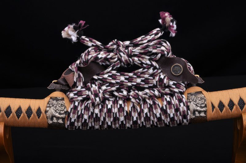 Furthermore, the scabbard is crafted from hardwood and wrapped with rayskin, while the fittings—richly adorned with the Japanese lion symbolizing power—are made of brass.