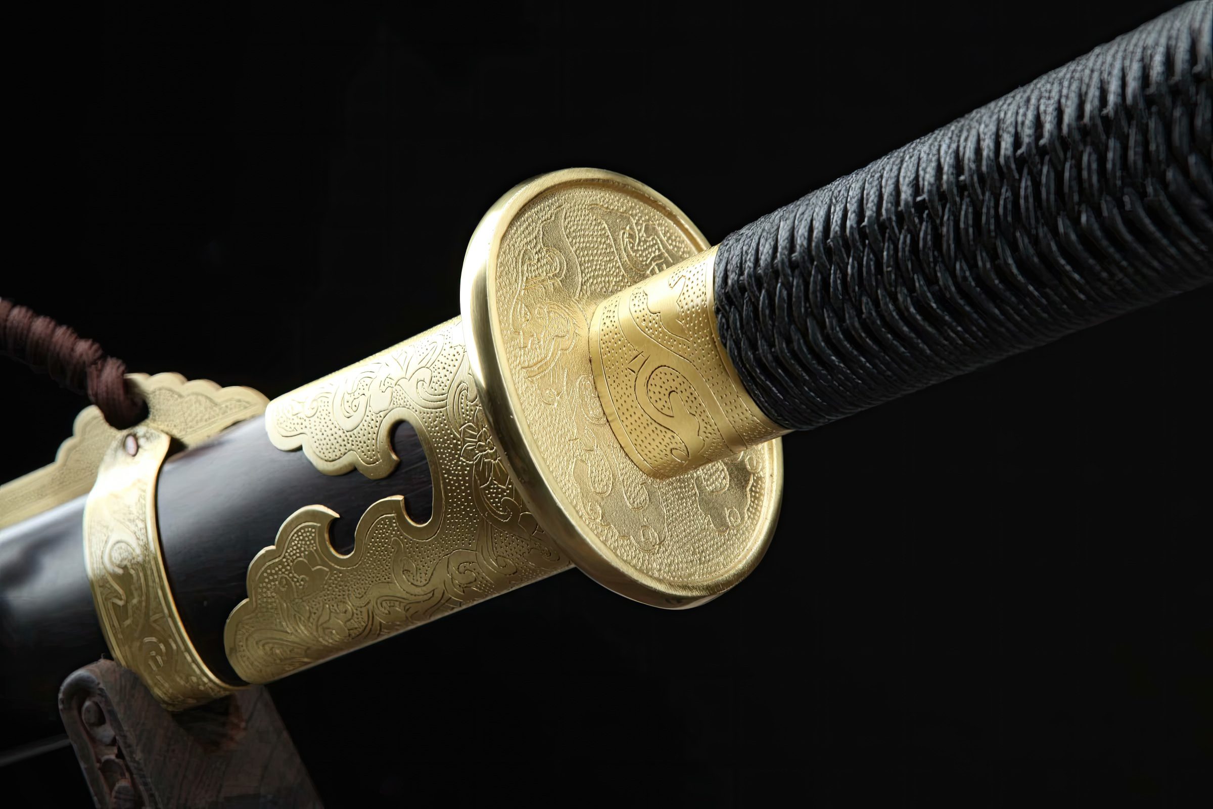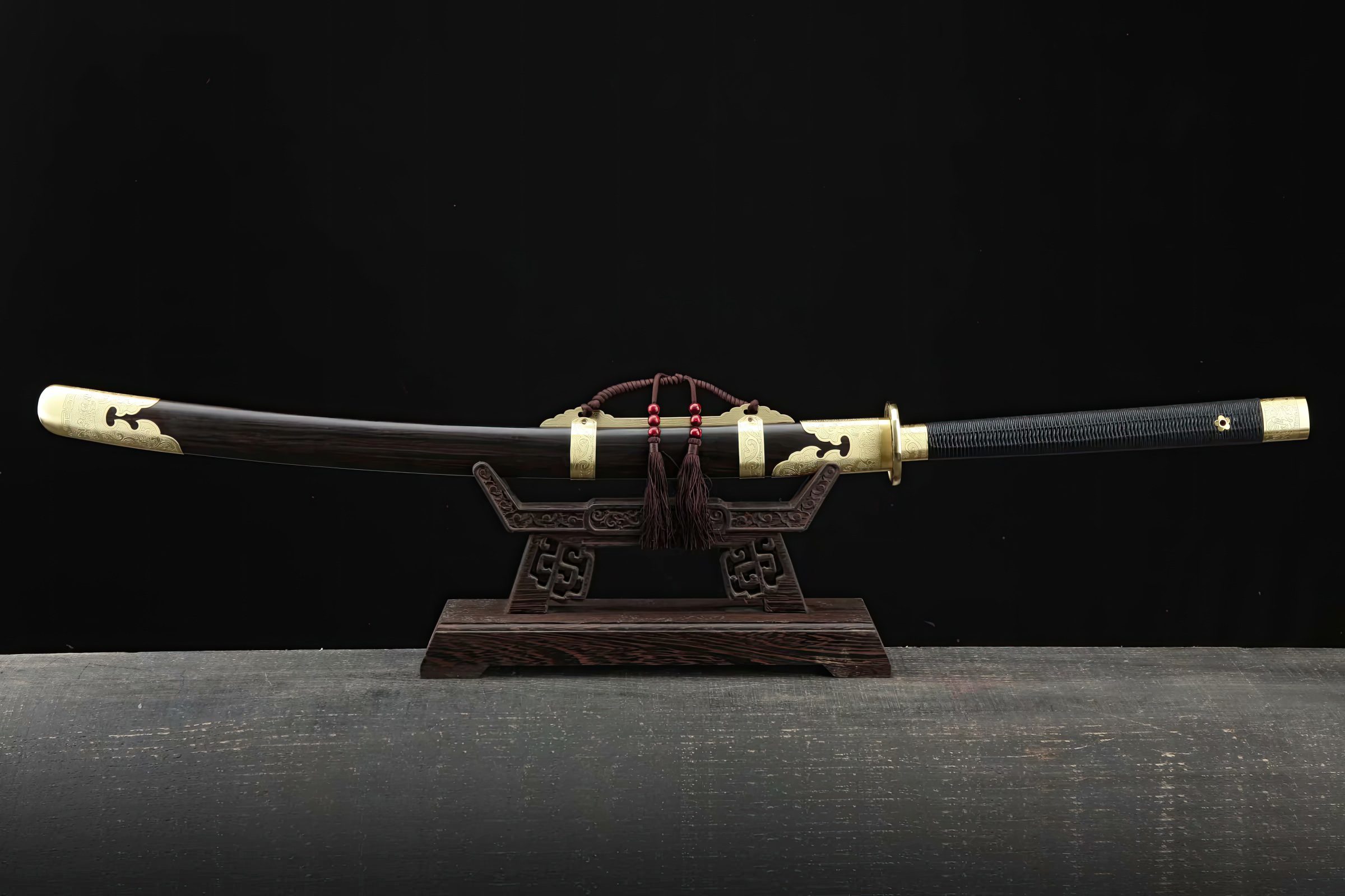 The blade has undergone a traditional hazuya polish to enhance the beauty of the grain lines. Its fittings are pure copper and brass, adorned with golden-like Chinese cloud symbols. The scabbard, made from quality ebony wood, complements the hardwood handle, designed for a two-handed grip. This sword is ideal for powerful and impactful cutting practice on tameshigiri, or as a decorative piece to evoke stories of Chinese two-handed swordsmanship. A free sword bag is included, with optional engraving available.