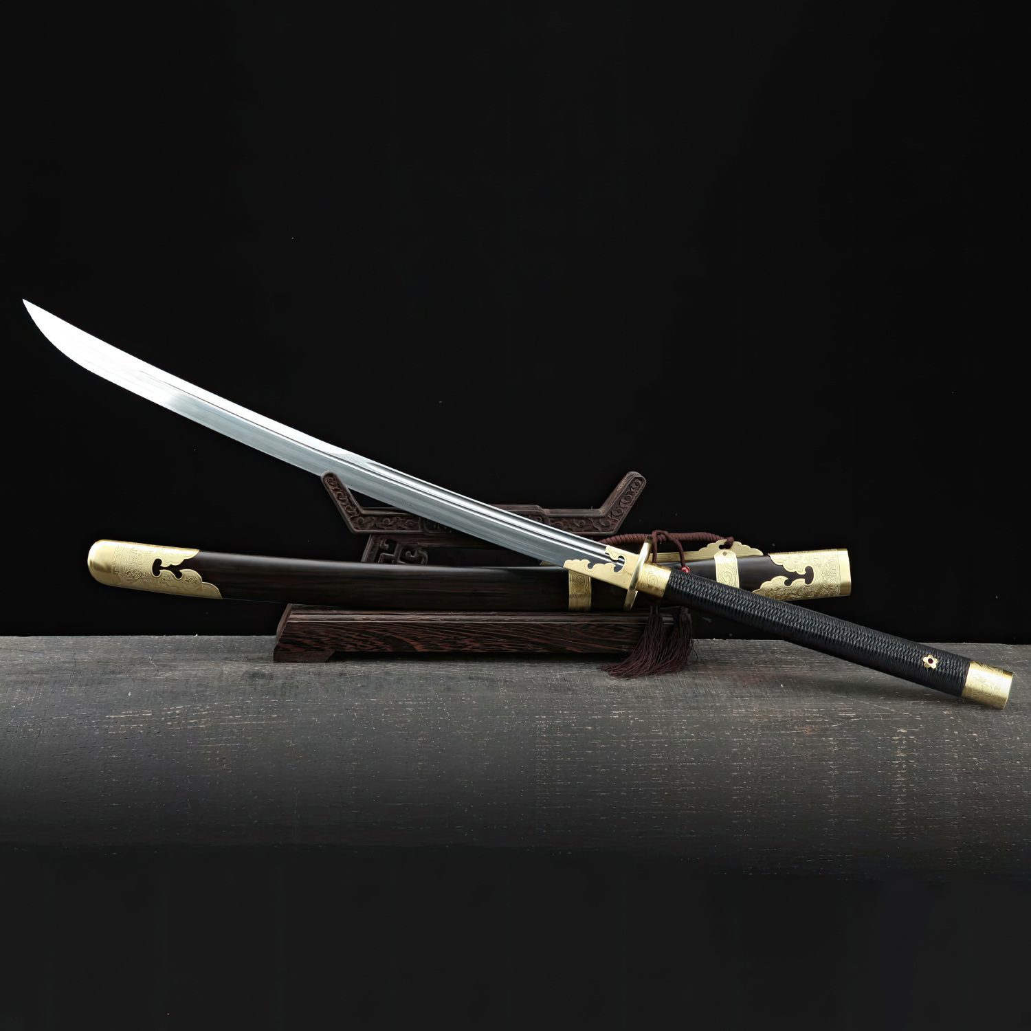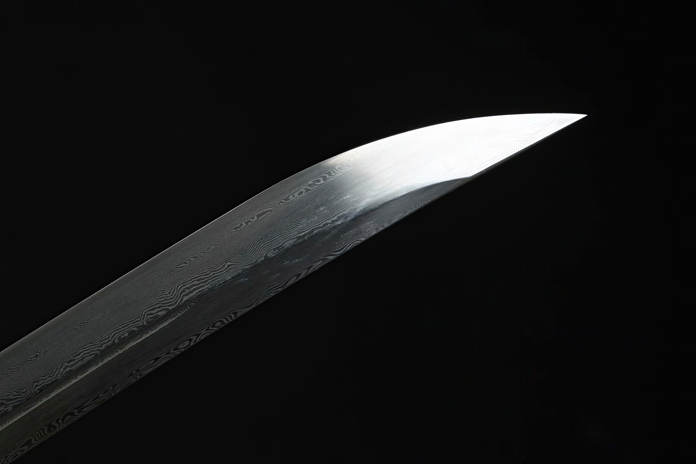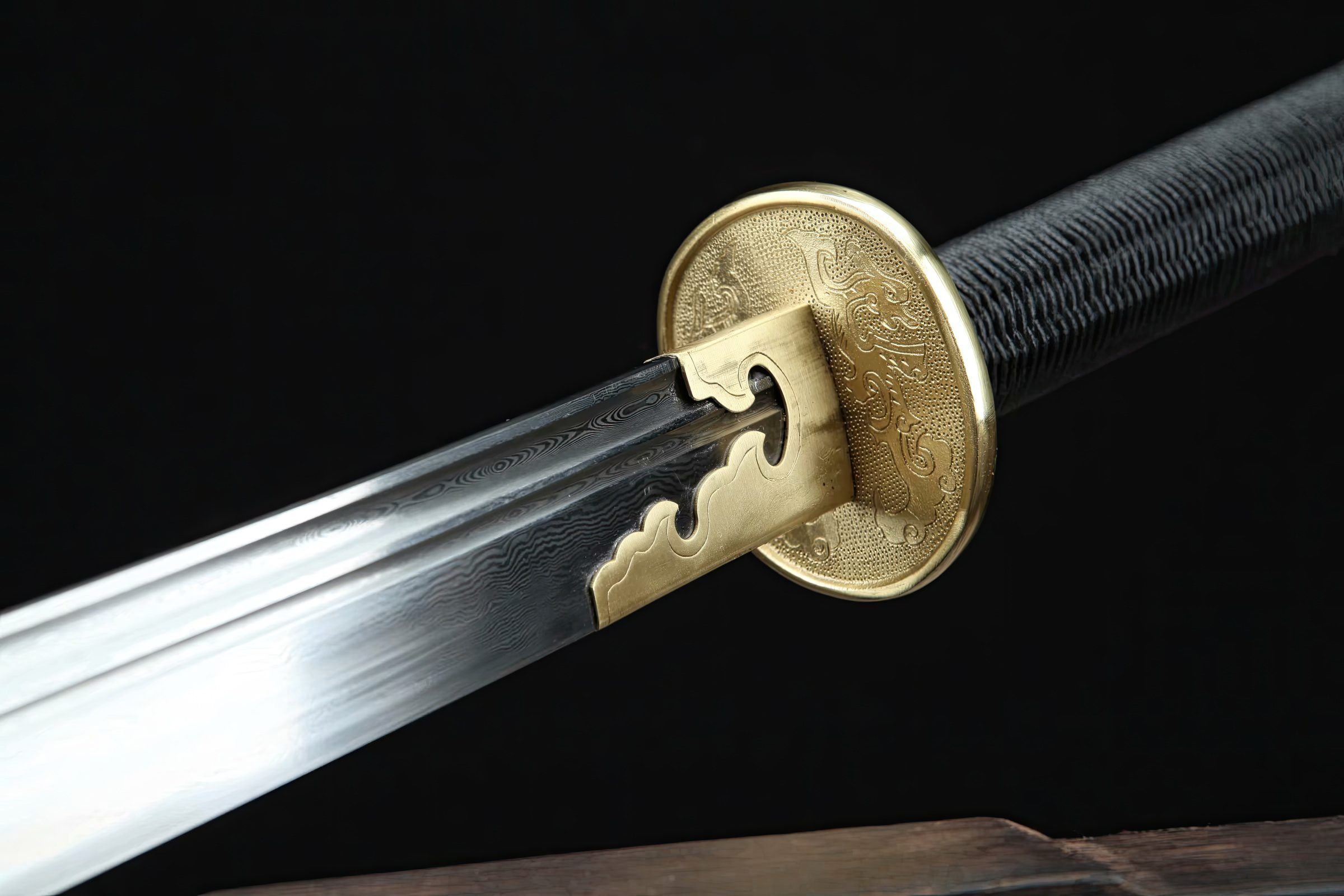 This sword, a take on the Chinese ZhanMaoDao - known as the 'horse-cutter' - was first employed during the Han Dynasty (202 BCE - 220 CE). It further evolved during the Tang and Song Dynasty period (618-1279). Made from pattern steel, the sword has been folded multiple times to create Damascus-like visible layers and patterns.