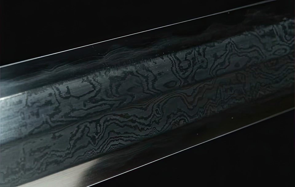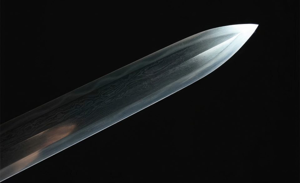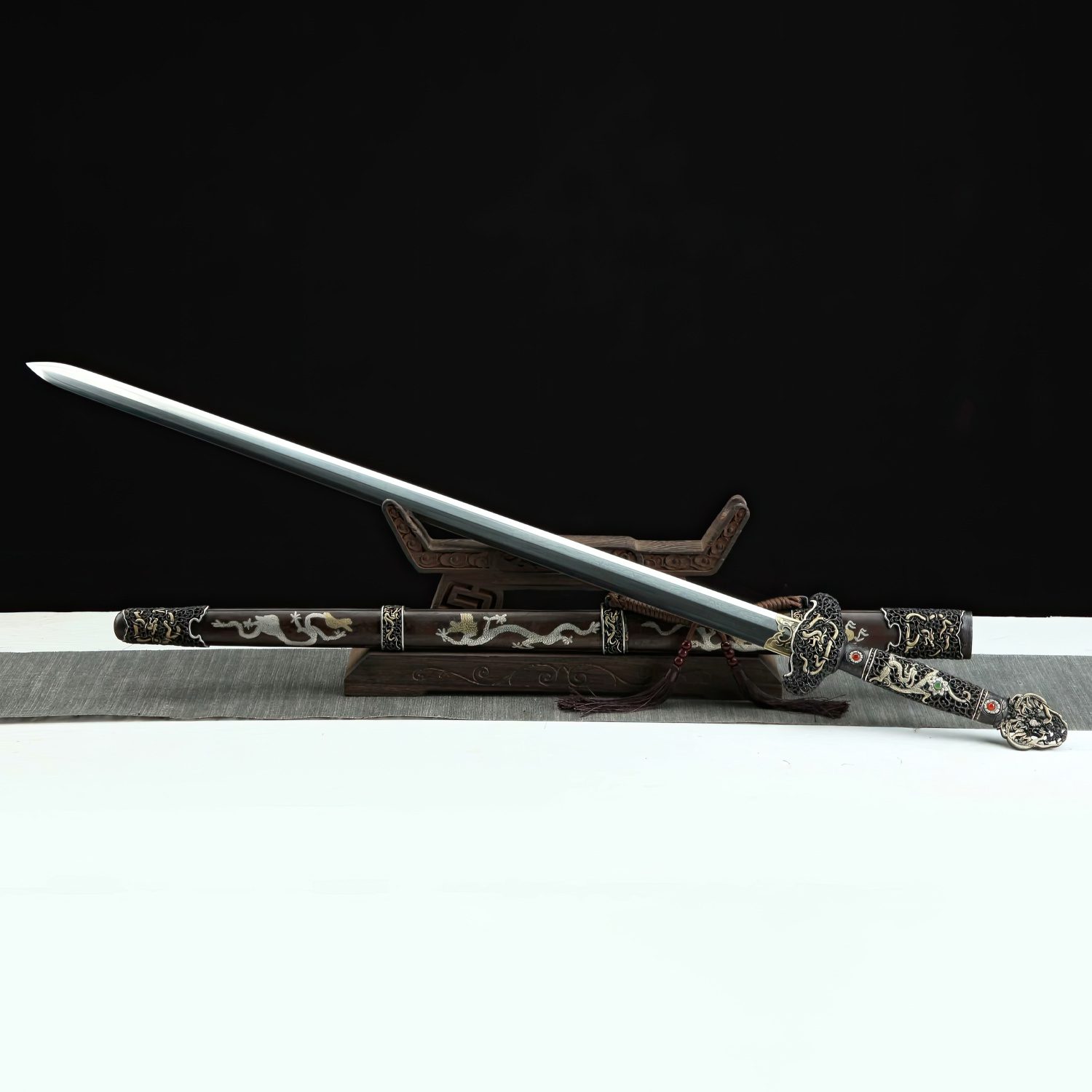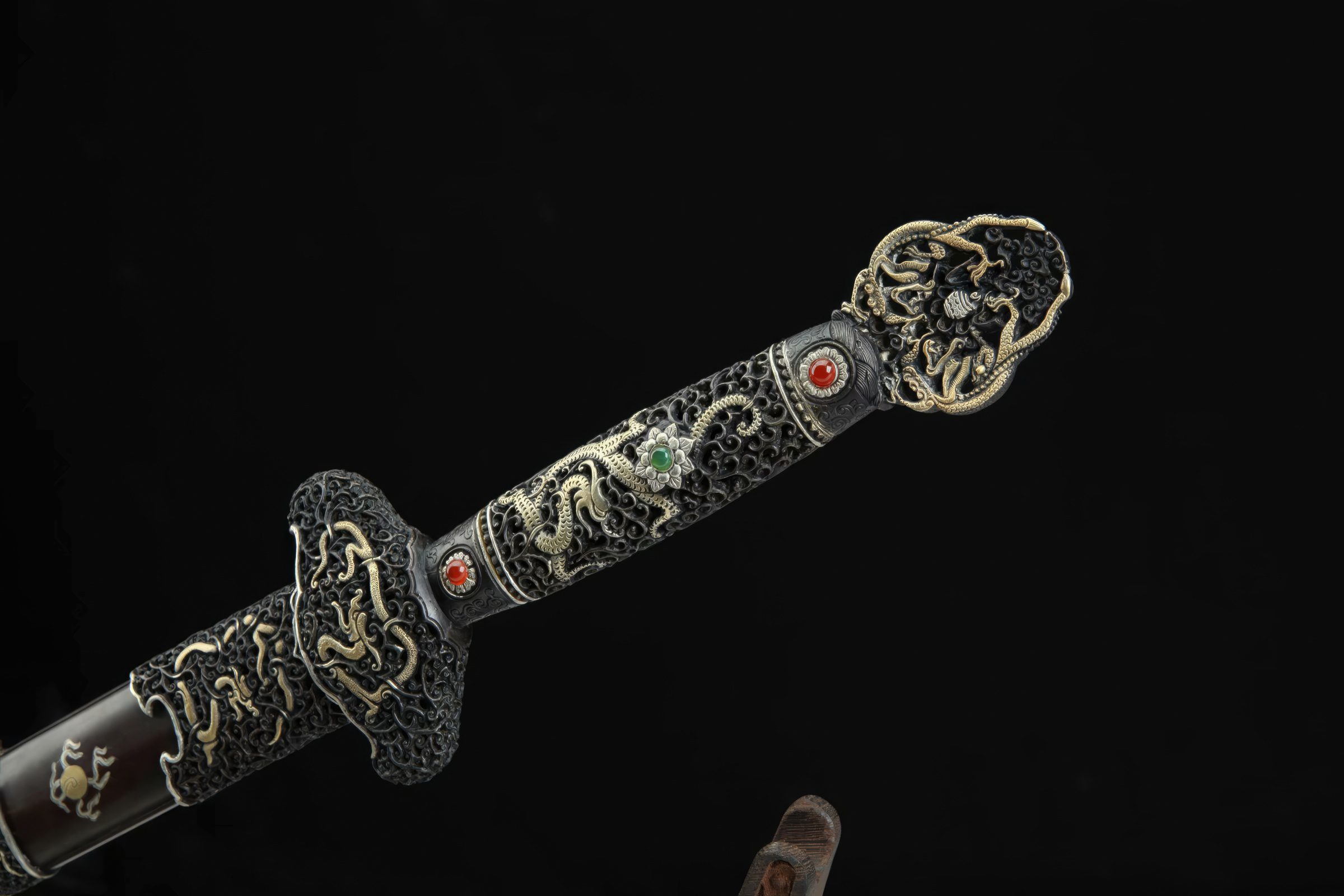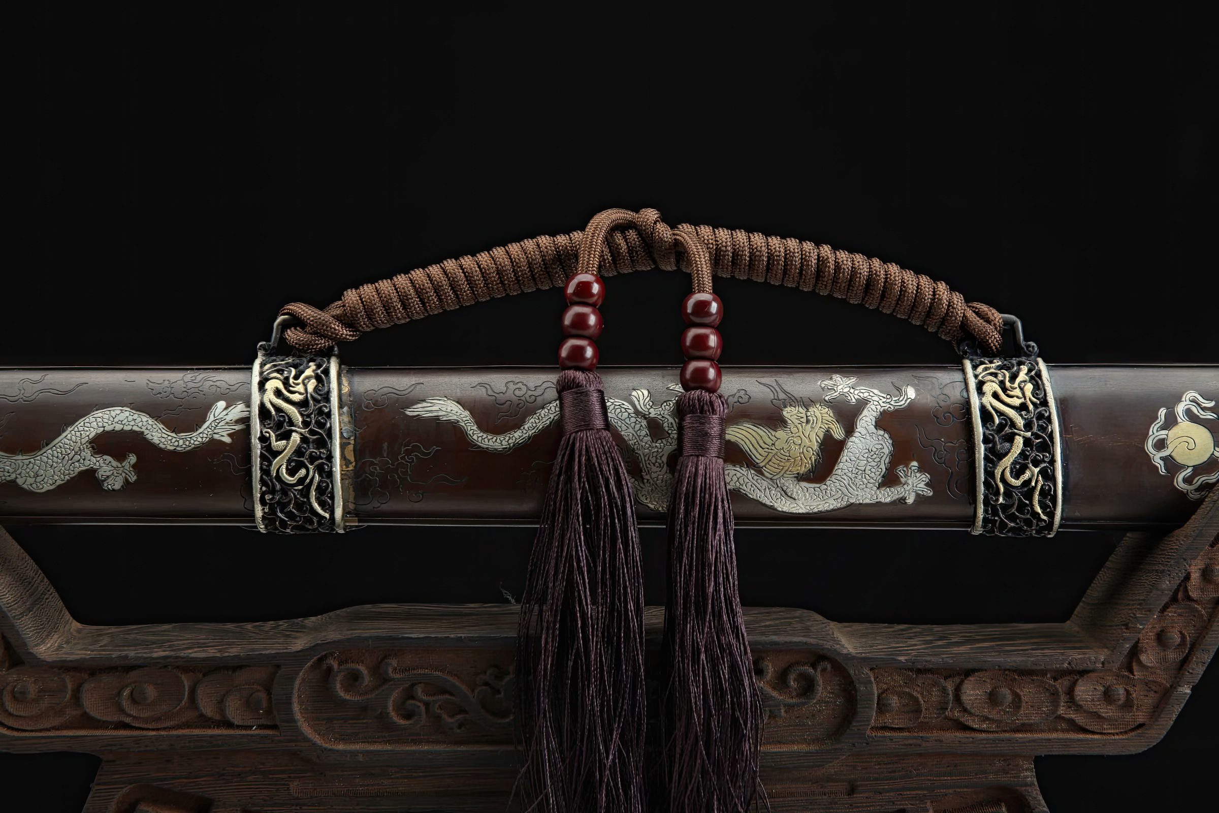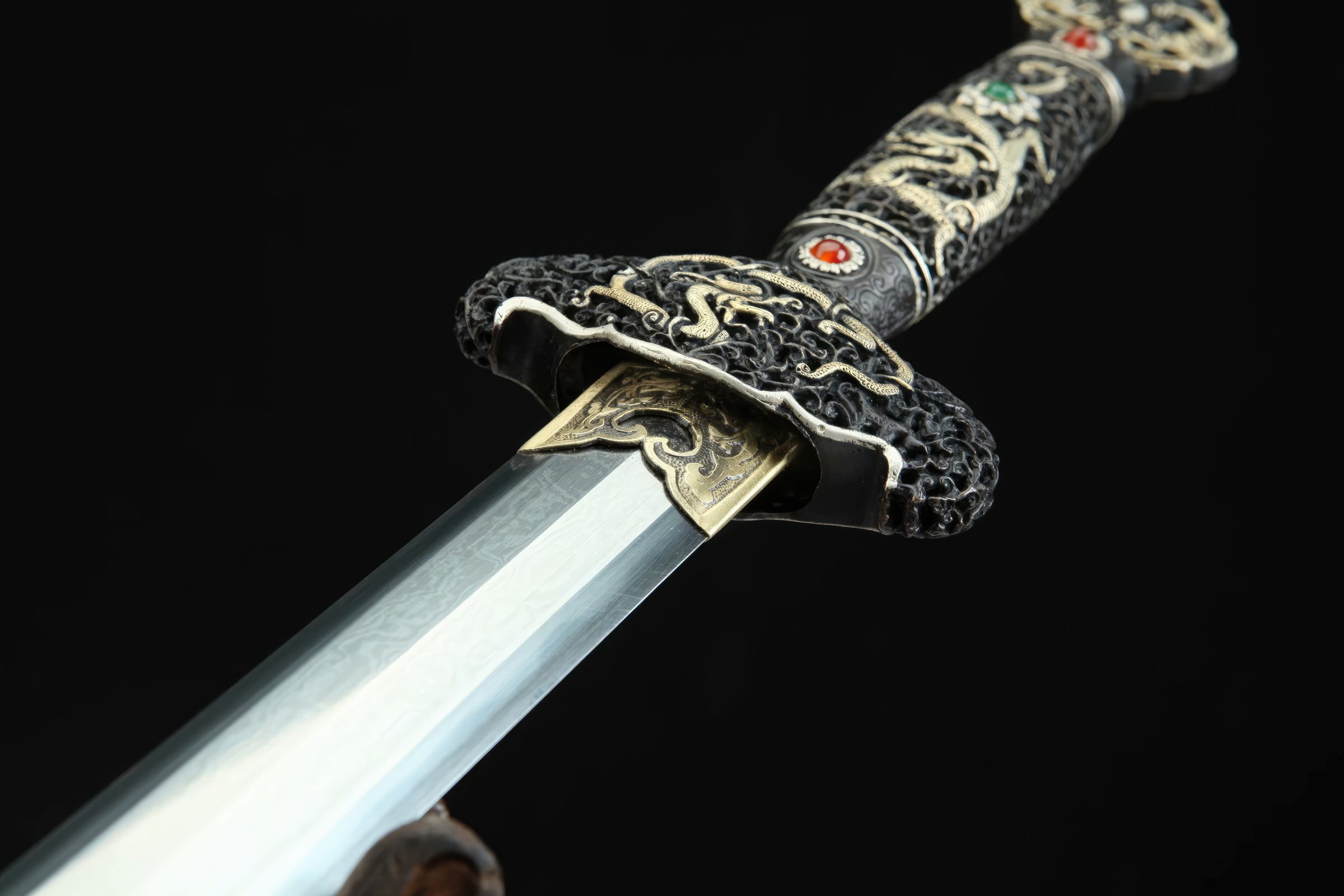 This is the Chinese "Dragon God Jian," named after the mythological and mysterious dragon beast that roamed through many great tales in ancient times. The dragon is depicted flying over the handle, handguard, and scabbard on top of twisted patterns to further enhance its visuals. This sword is made from pattern steel, folded multiple times to produce many Damascus-style layers over its blade.