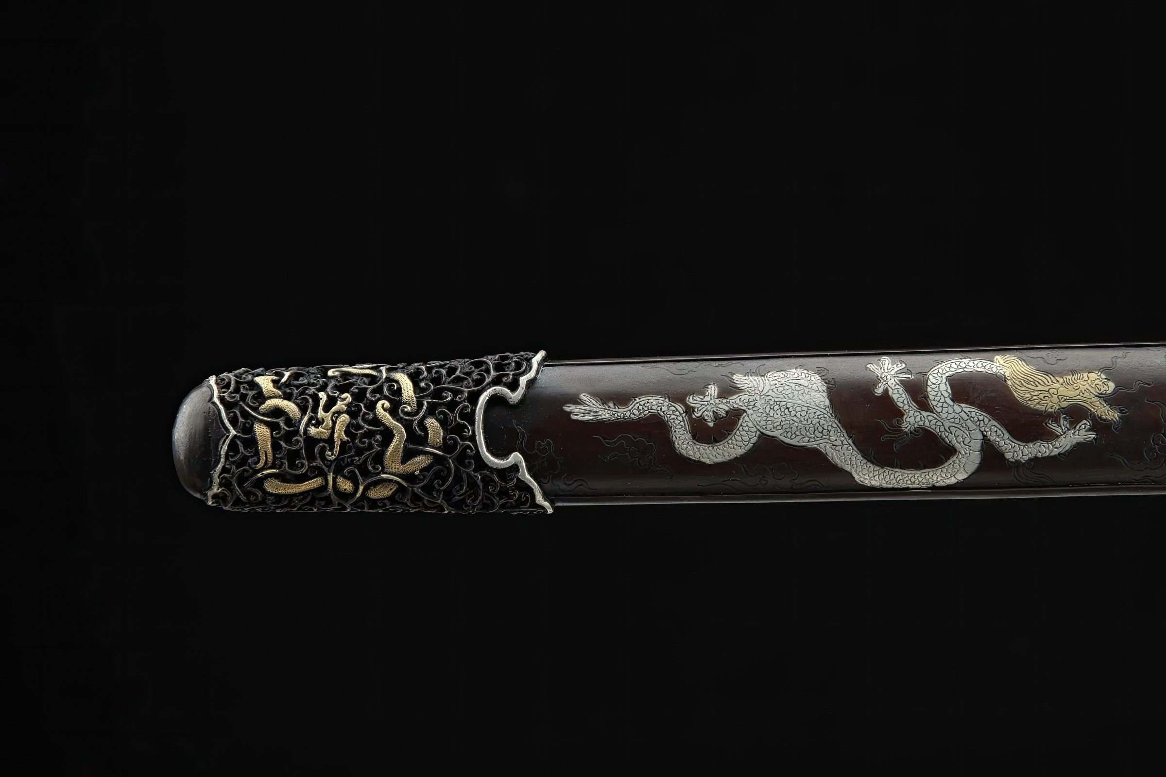 The traditionally 8-sided blade has undergone clay-tempering to produce an authentic hamon while hardening its edges. The fittings are made from brass, while the wooden handle and scabbard are adorned with engraved copper dragon accessories. This piece is available in both a sharpened and unsharpened version and is suitable for cutting practice, Tai Chi, Kung Fu training, and decor.