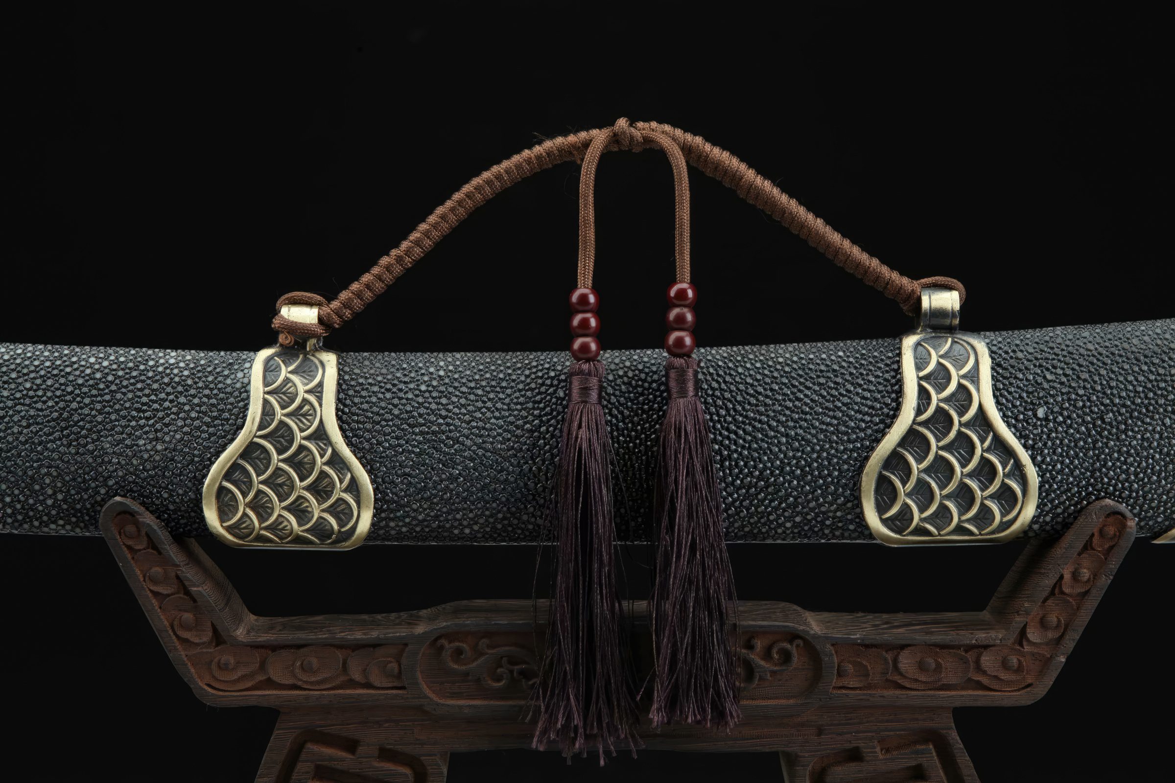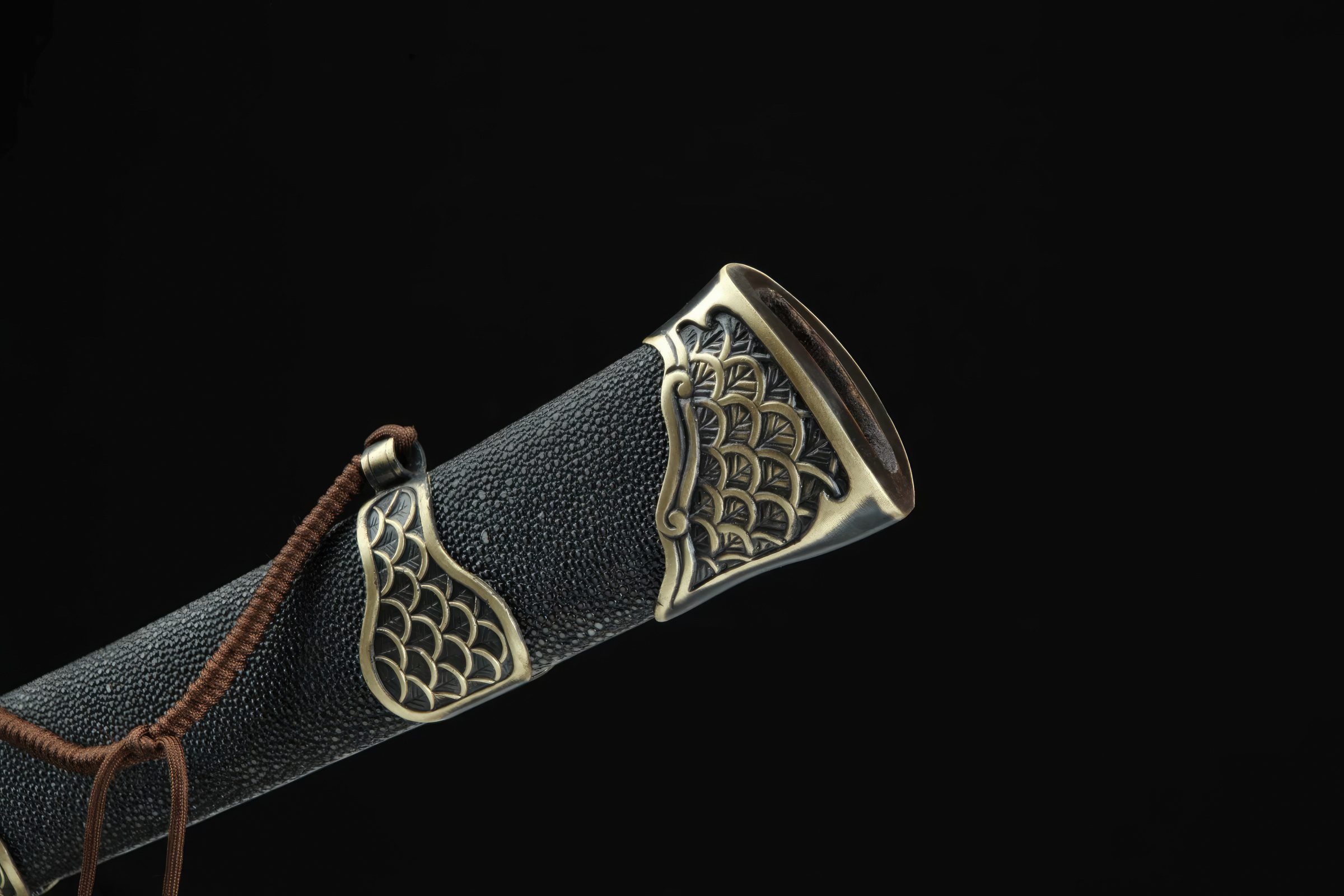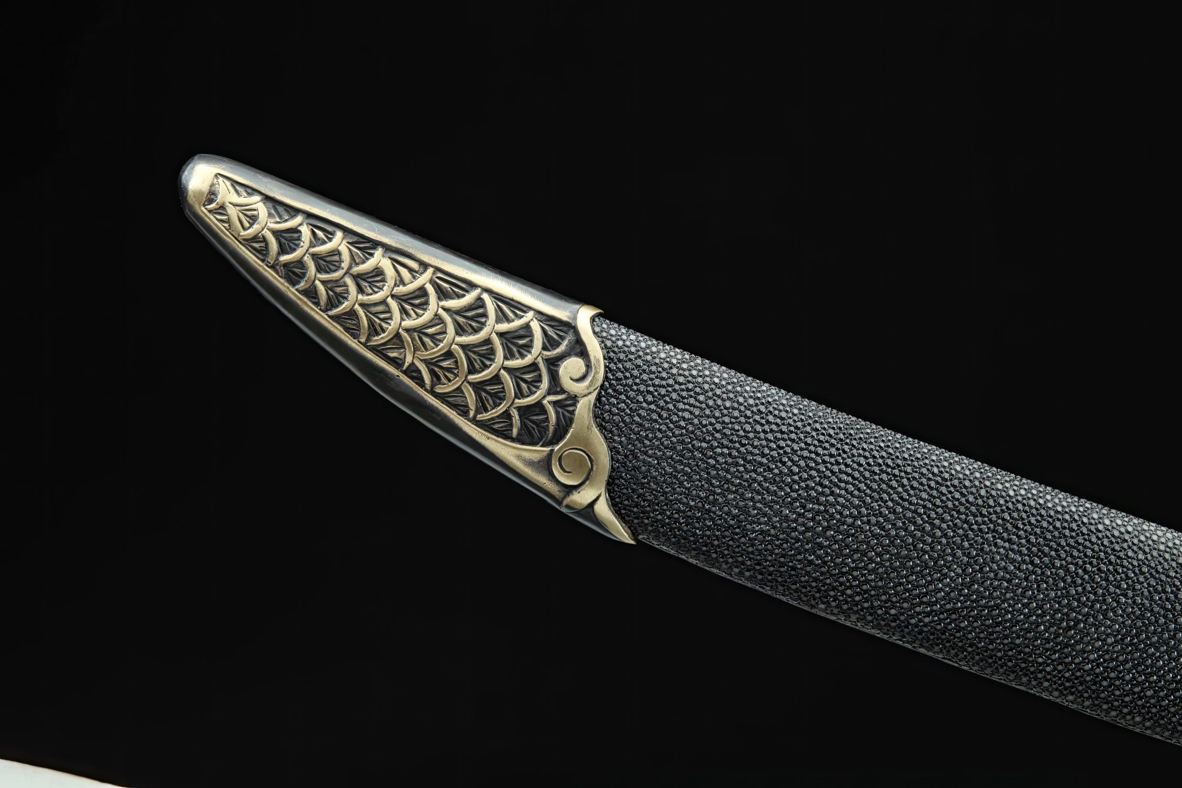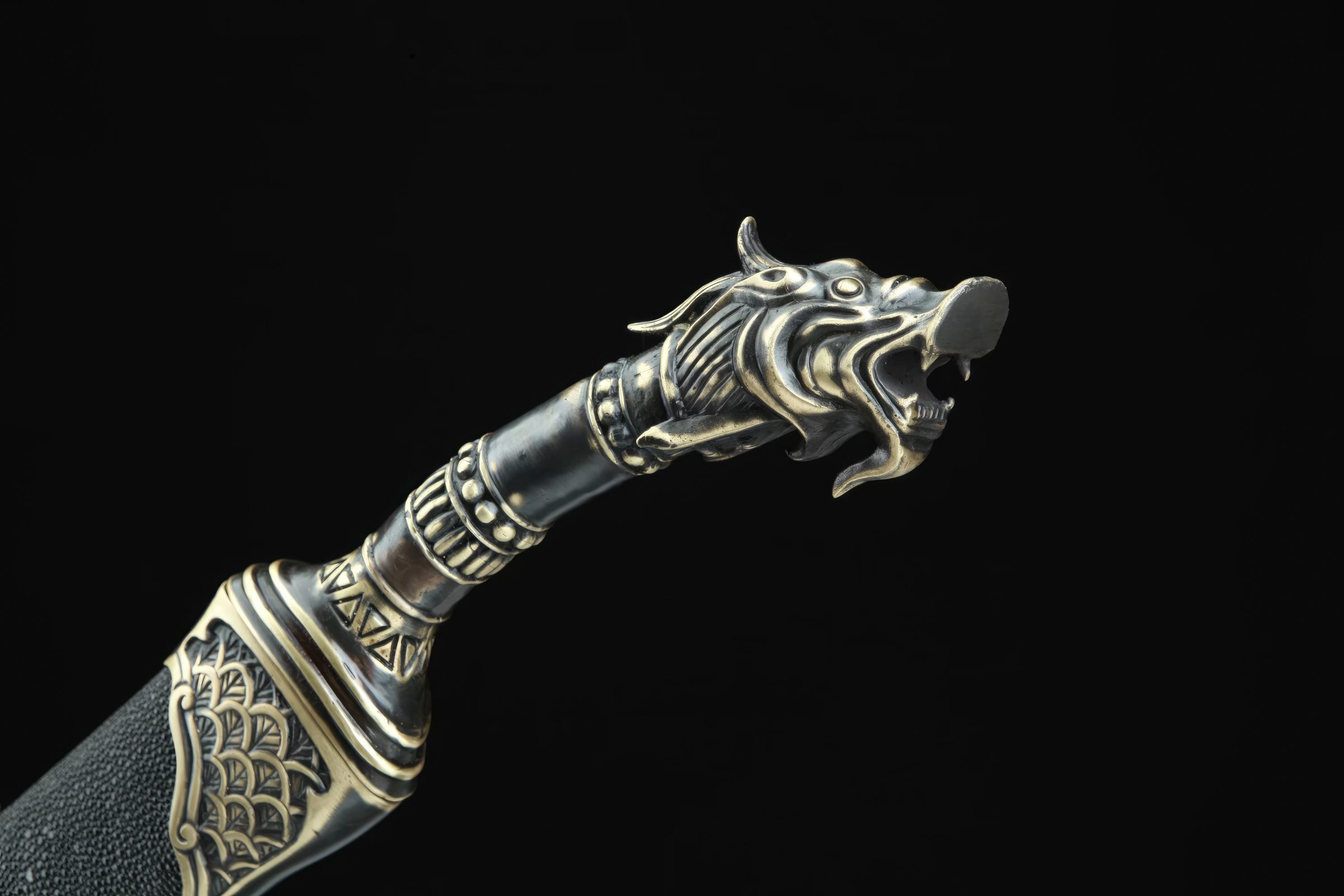 Its blade has been clay-tempered to produce a genuine hamon line, with its spine and edge differentially hardened. Its fittings, adorned with Chinese dragon emblems, are made from copper and bronze. It also features a wooden handle and a scabbard wrapped in quality rayskin.
