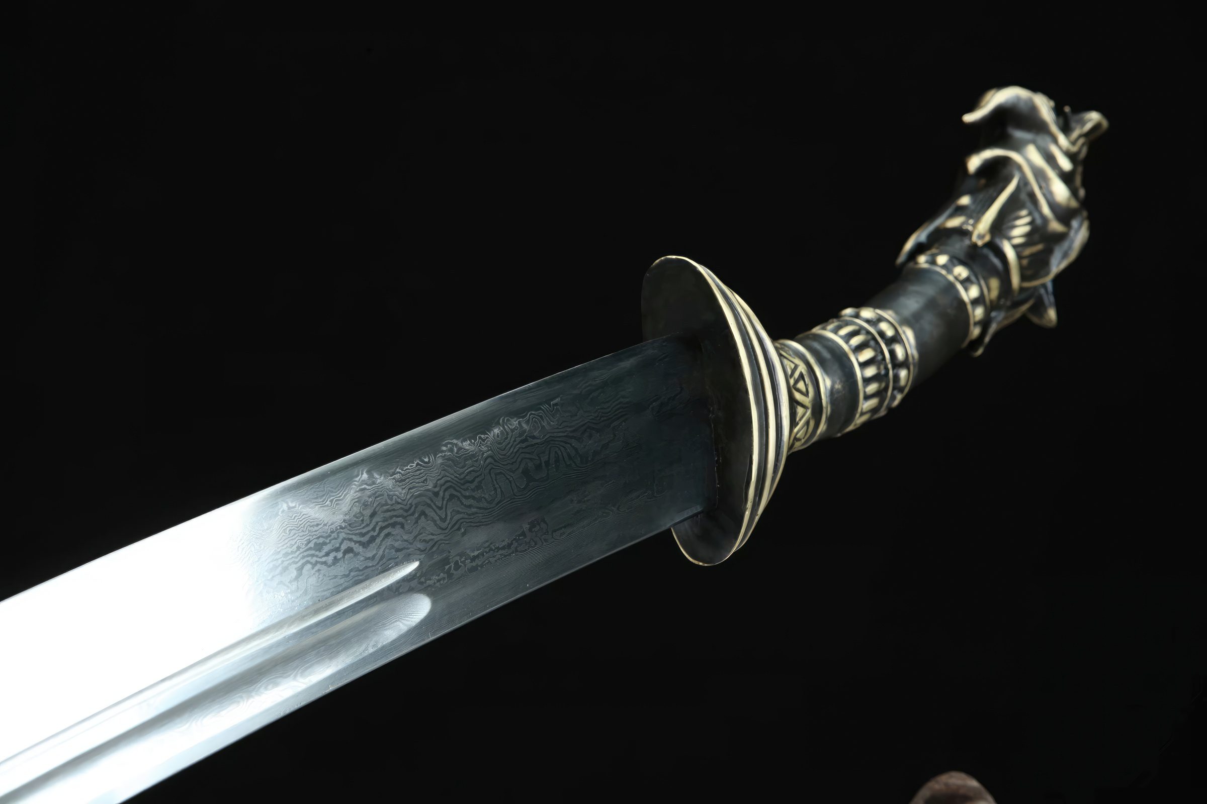 The Hailong Dao Saber is a single-edged, elegantly curved blade that represents the mysterious dragon of ancient Chinese mythology, mostly linked with Han culture. This adorned Chinese sword is made from pattern steel, folded multiple times to produce over 8192 Damascus blade layers.