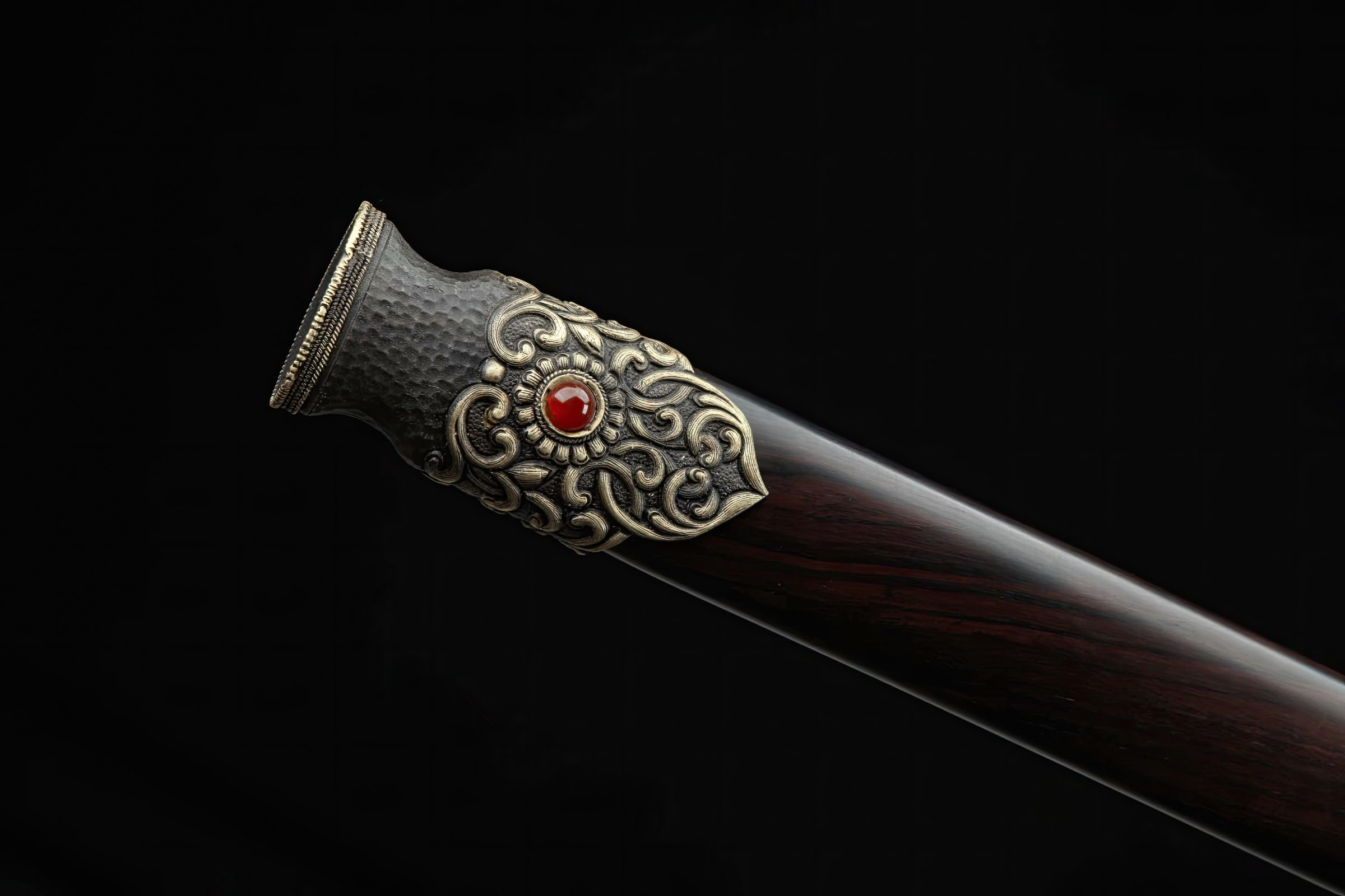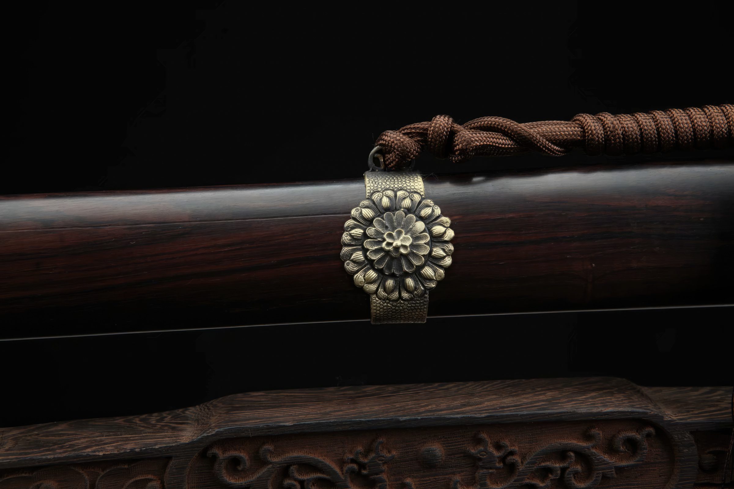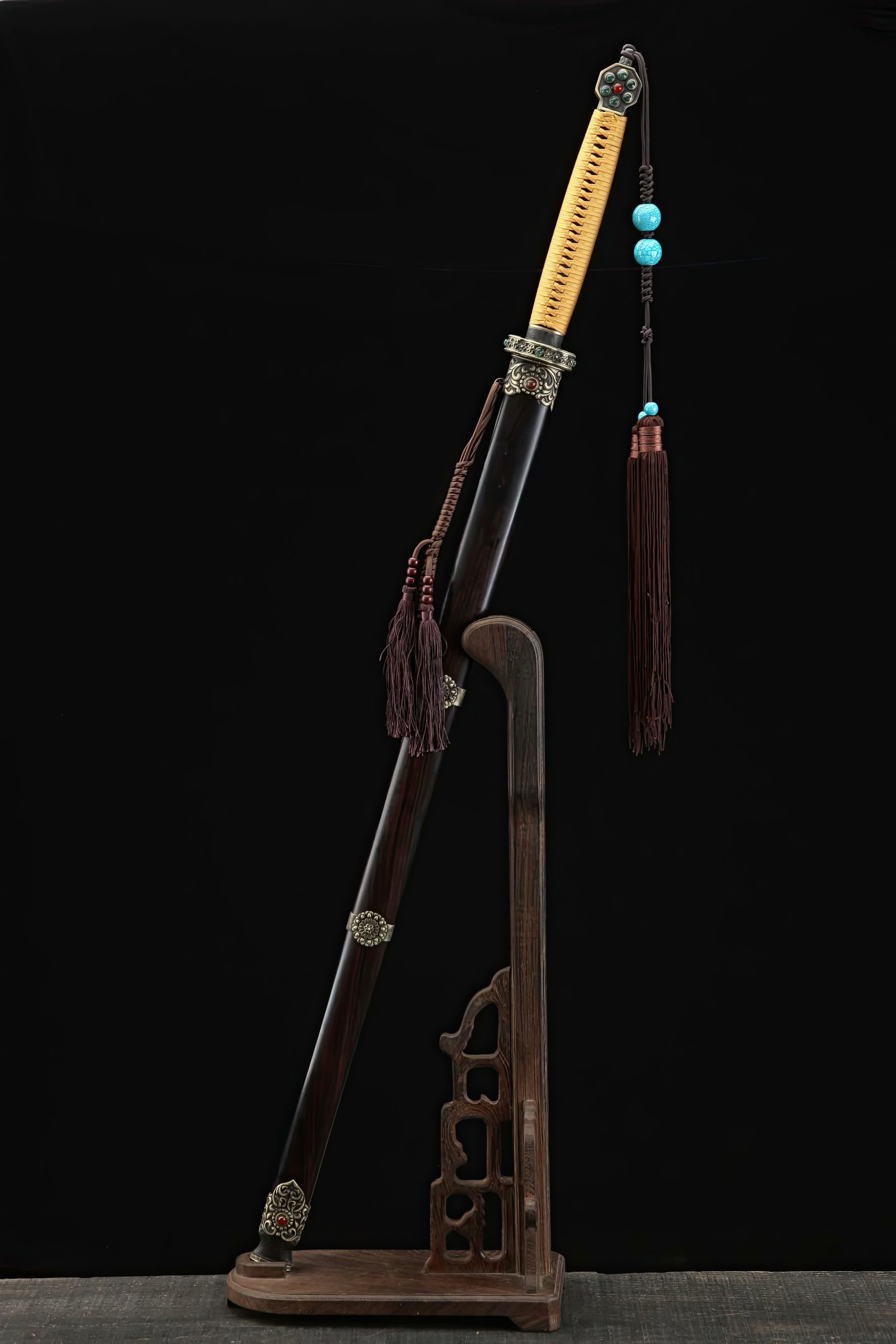 The scabbard, made from high-quality ebony wood, complements its handle with a hardwood core. A traditional Chinese cord wrap ensures a firmer grasp. Matching fittings, crafted from brass and copper, showcase a dragon and dragon-skin design. The blade engravings are customizable, and different levels of sharpness can be chosen. Each sword purchase includes a free sword bag.