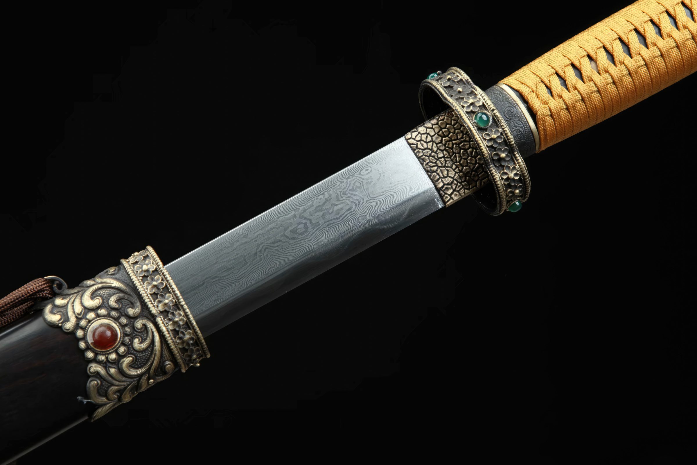 This straight, single-edged blade is a Tang Dao sword, originated in the golden era of Tang Dynasty China. This set the standard and norm for many other East Asian swords. The construction consists of folded pattern steel, creating numerous Damascus-like layers and patterns. It possesses an authentic clay-temper, producing the very visible and iconic hamon.