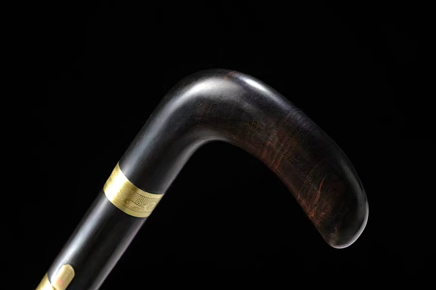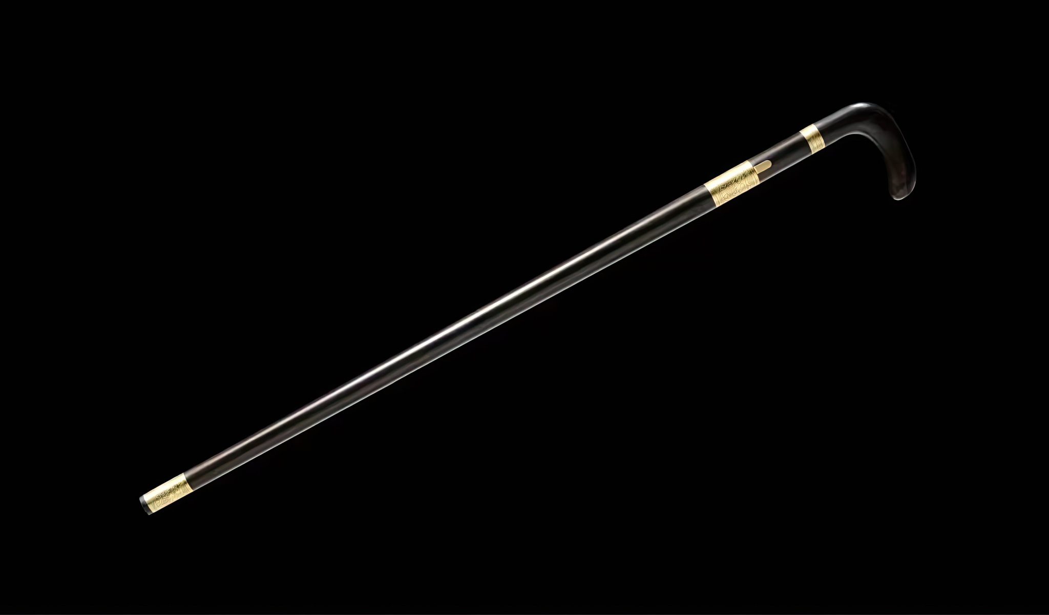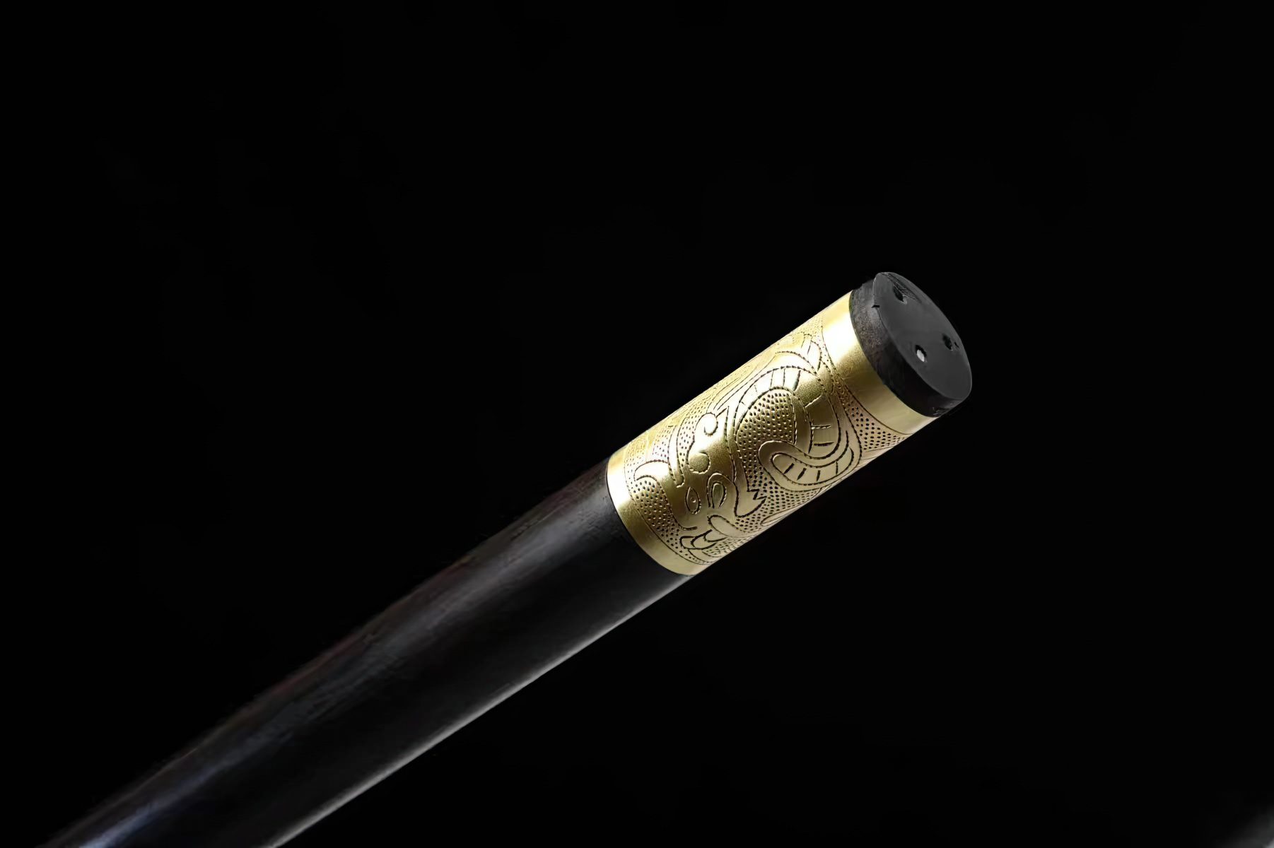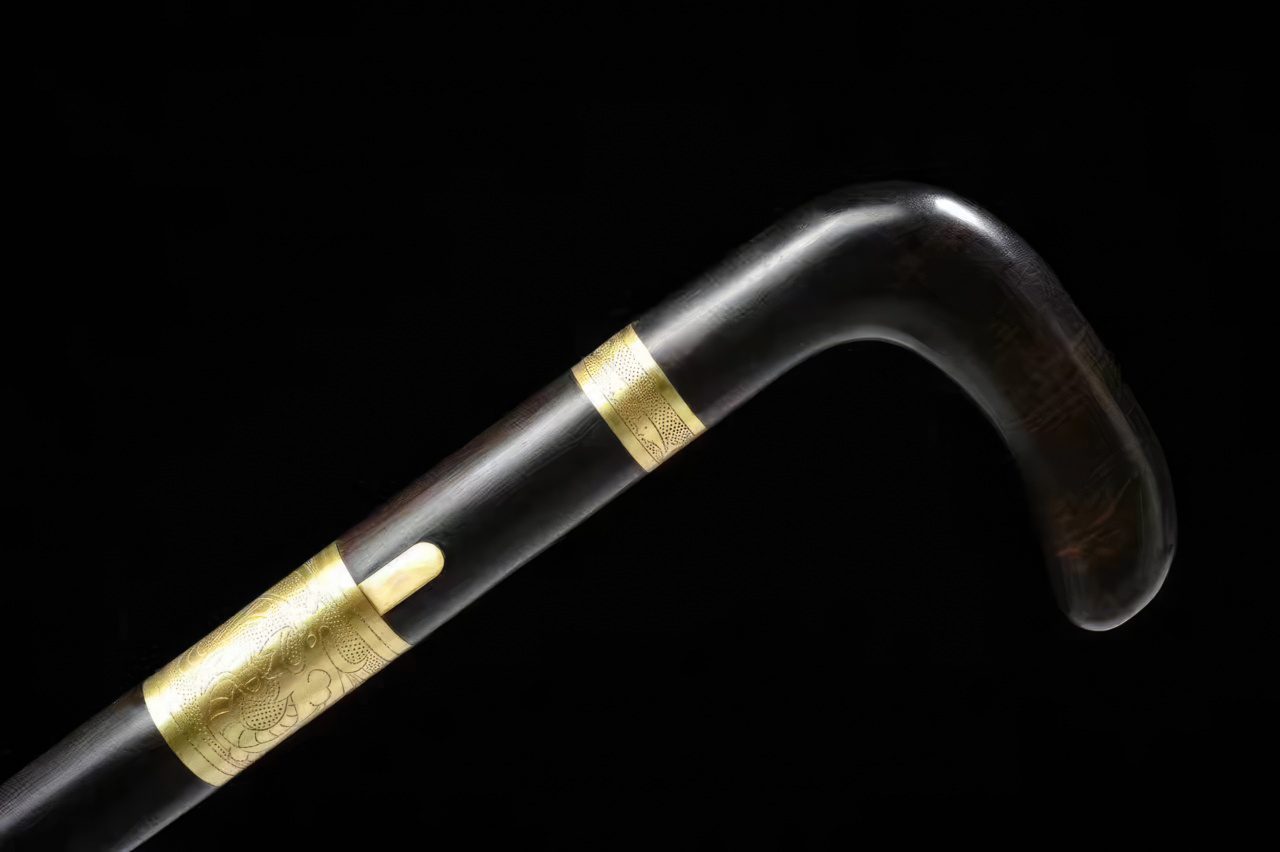 The shaft and handle are both made out of reliable hardwood, while its fittings are forged out of brass. Each element follows a golden hue, creating a contrast to the dark wood. This sword can act as a walking aid and is also a very functional concealed weapon. It can be used on cutting practice targets when ordered sharpened.